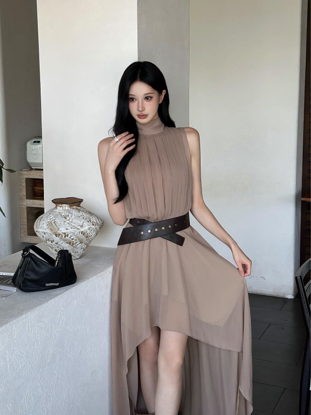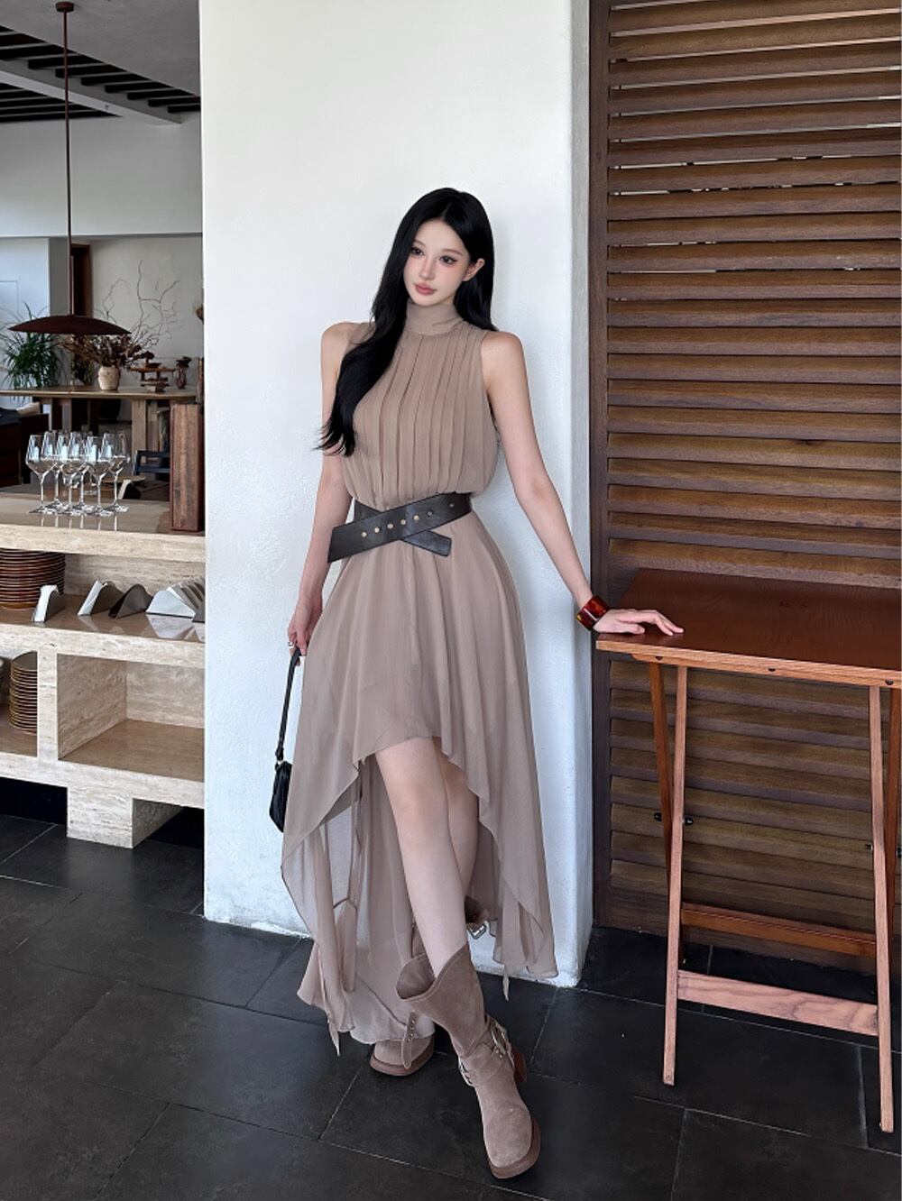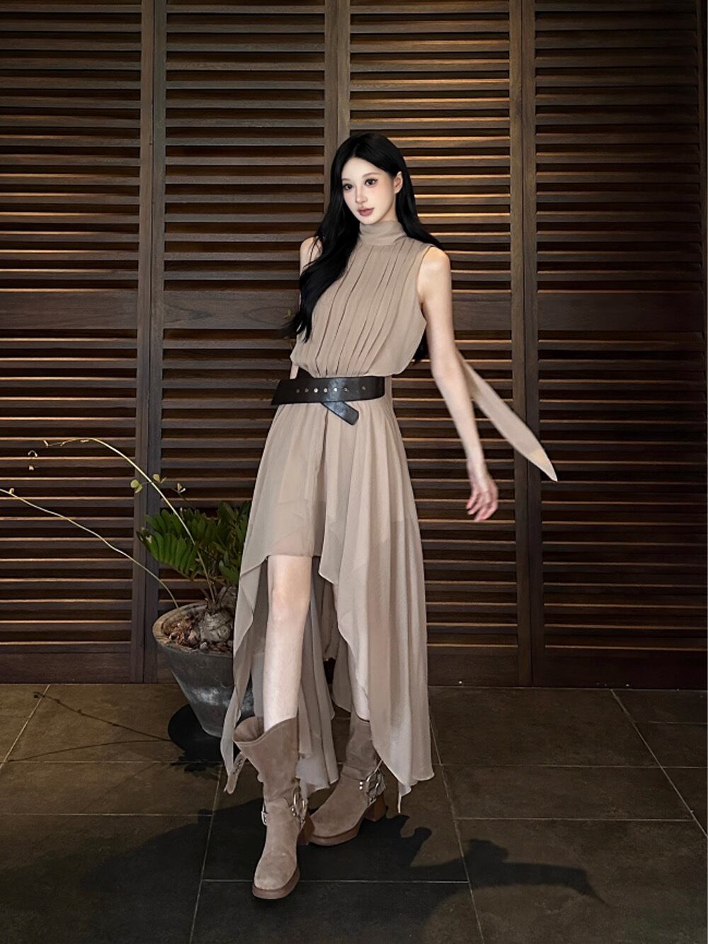 "内に秘めた美を体現する"「#大人スタイル|ベルトアタッチドベージュアシンメトリローブノースリーブワンピース」をお楽しみください♡