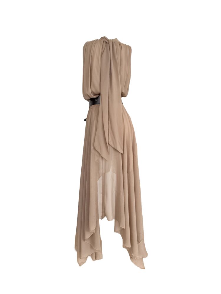 #大人スタイル|ベルトアタッチドベージュアシンメトリローブノースリーブワンピースは、洗練されたシルエットと独自のデザインで、特別な一日を彩るアイテム。