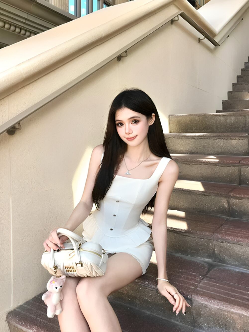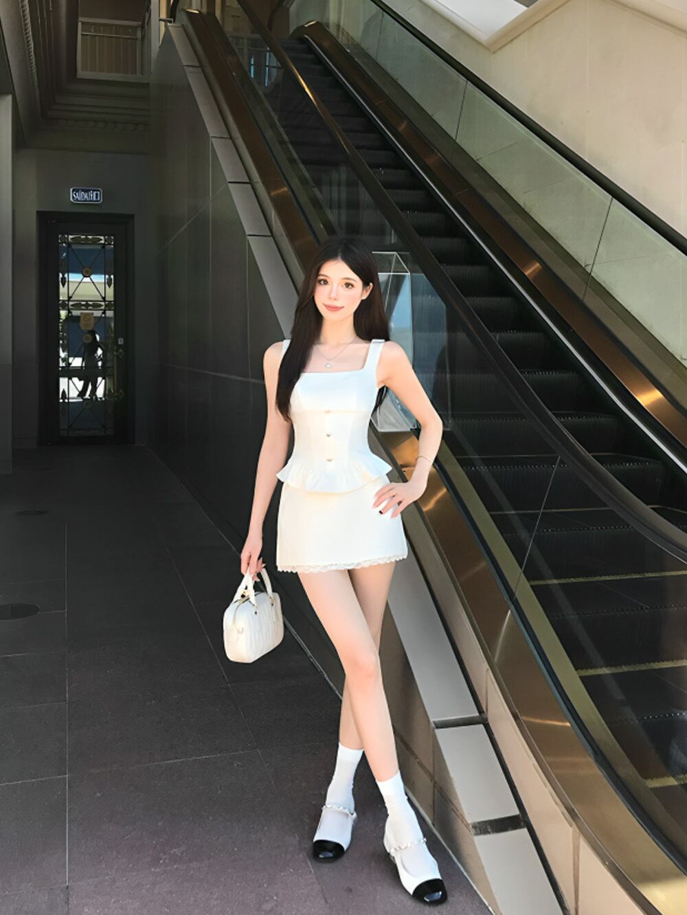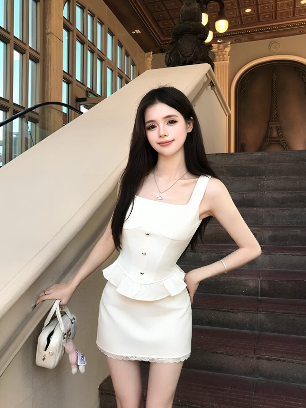 可愛くも上品な「ペプラムフレンチキャミソールトップス+ヘムレーススカートセットアップ」をお楽しみください♡