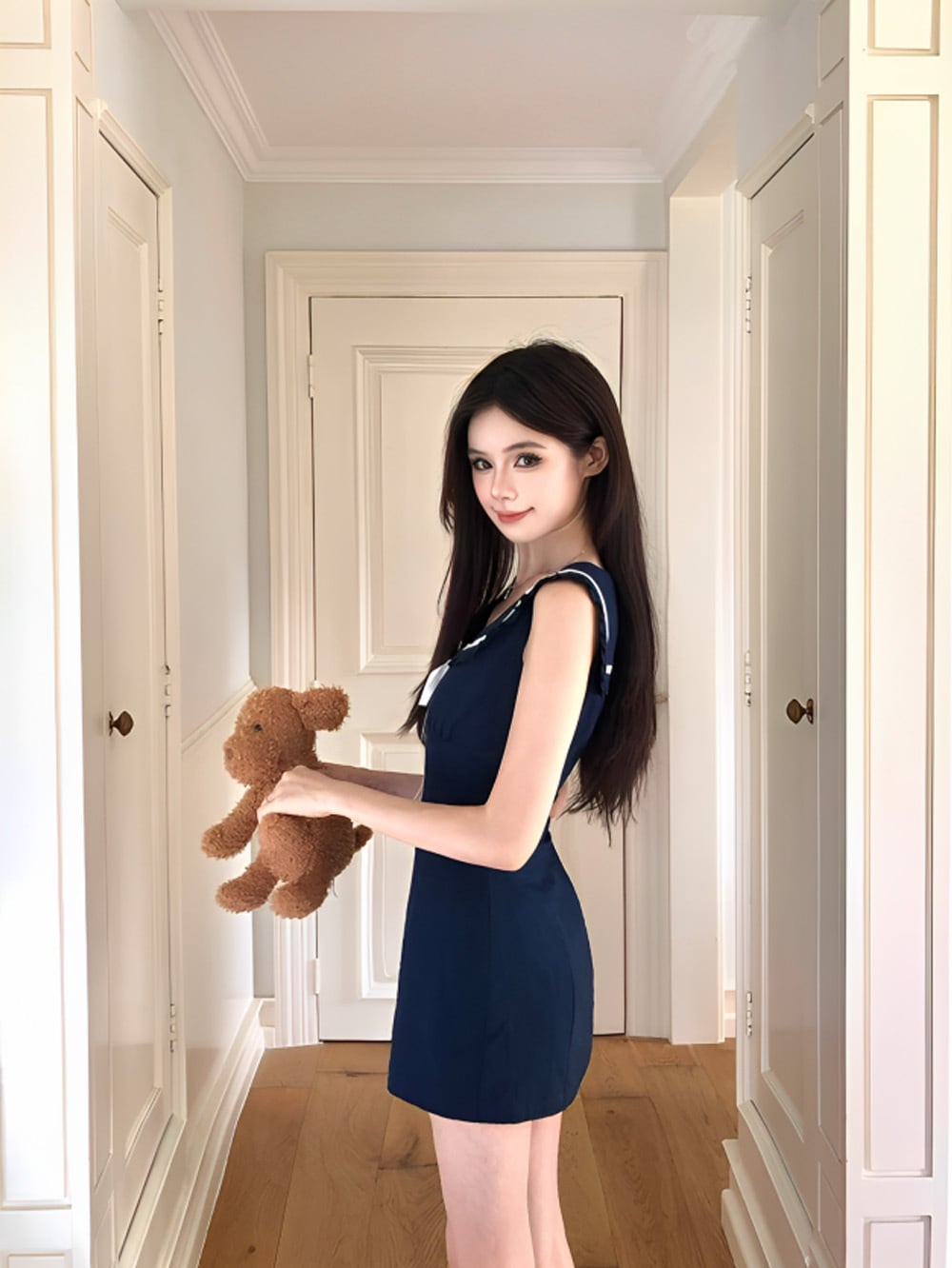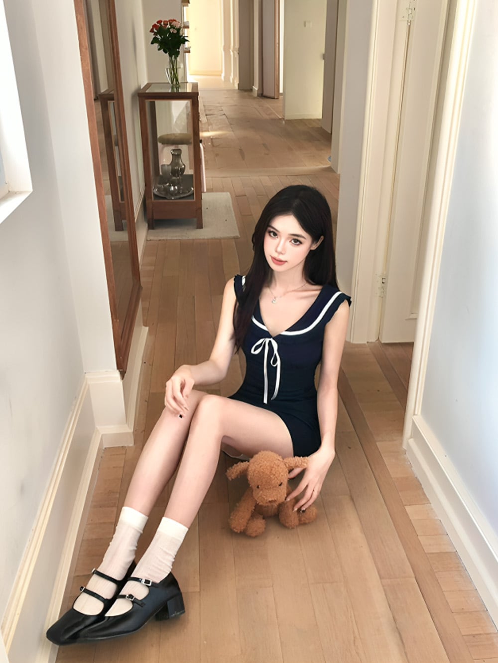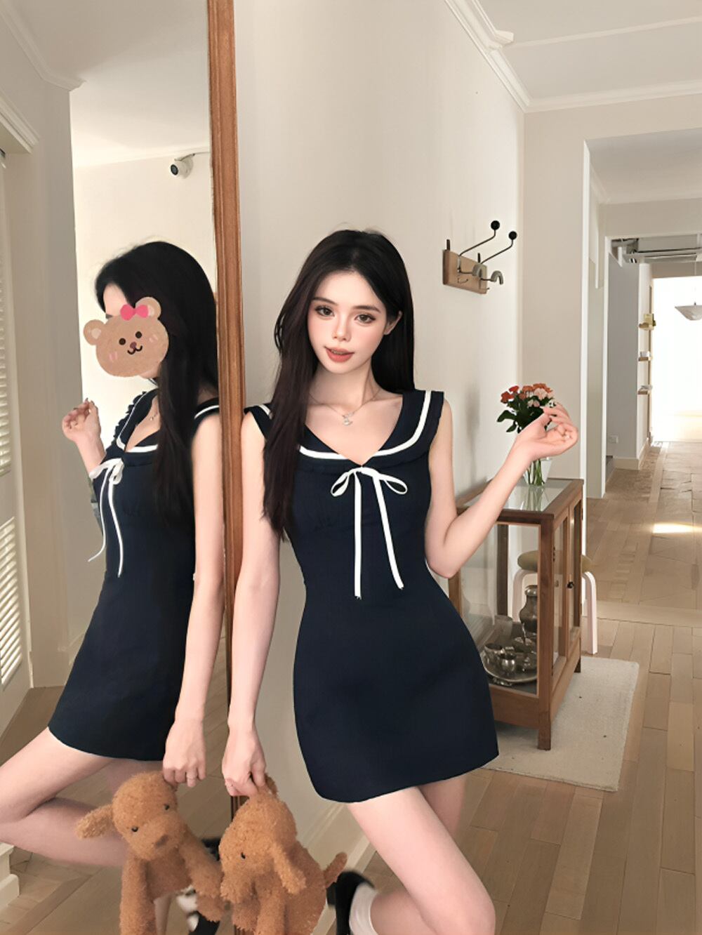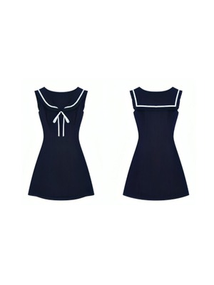 #miu系穿搭|セーラースタイルホワイトラインフロントコードノースリーブワンピース