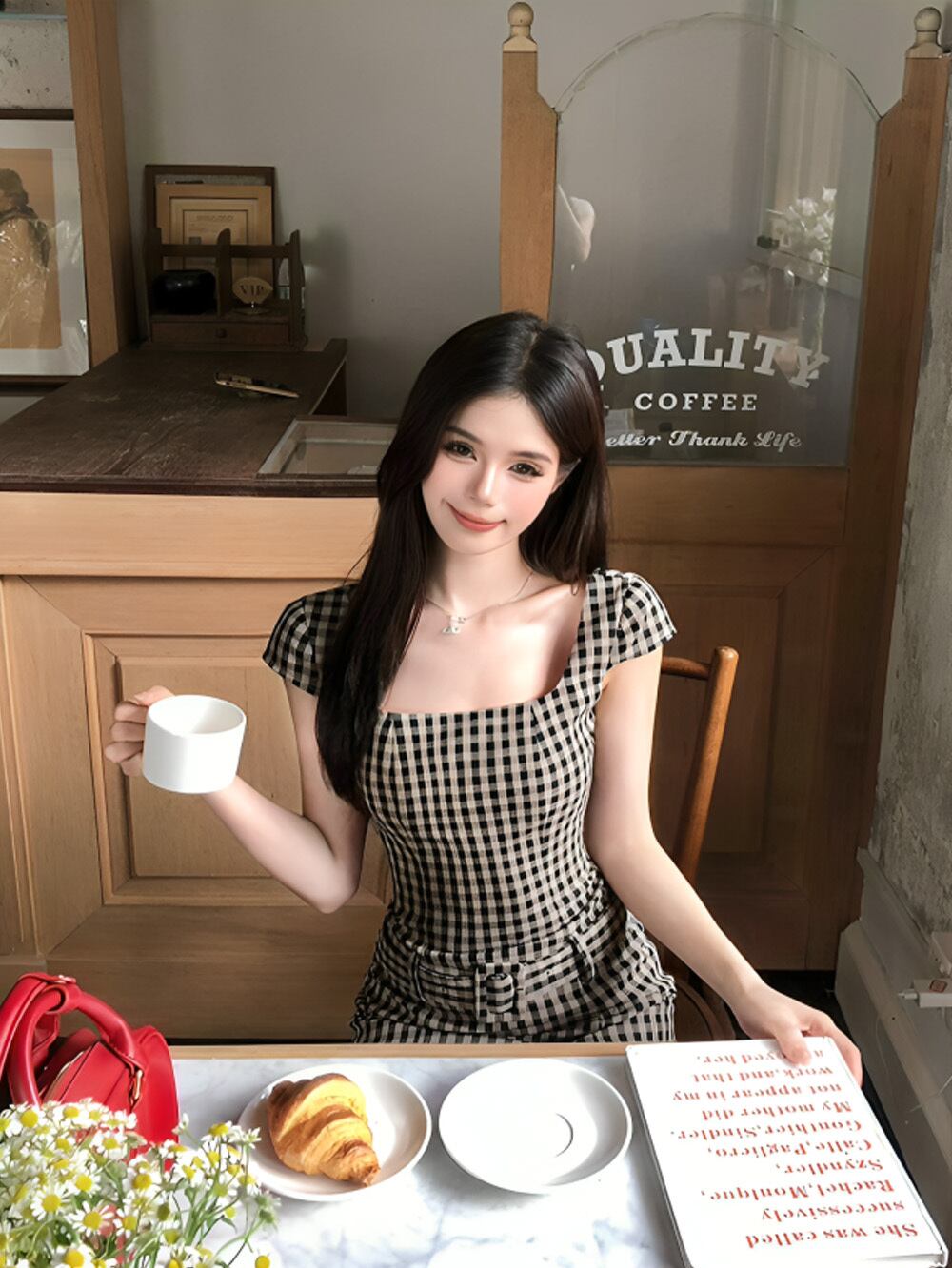 ギンガムチェックの規則性と、スクエアネックの直線美で