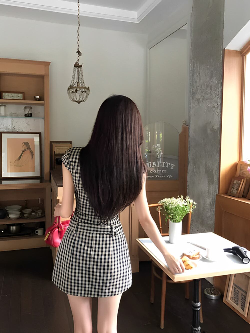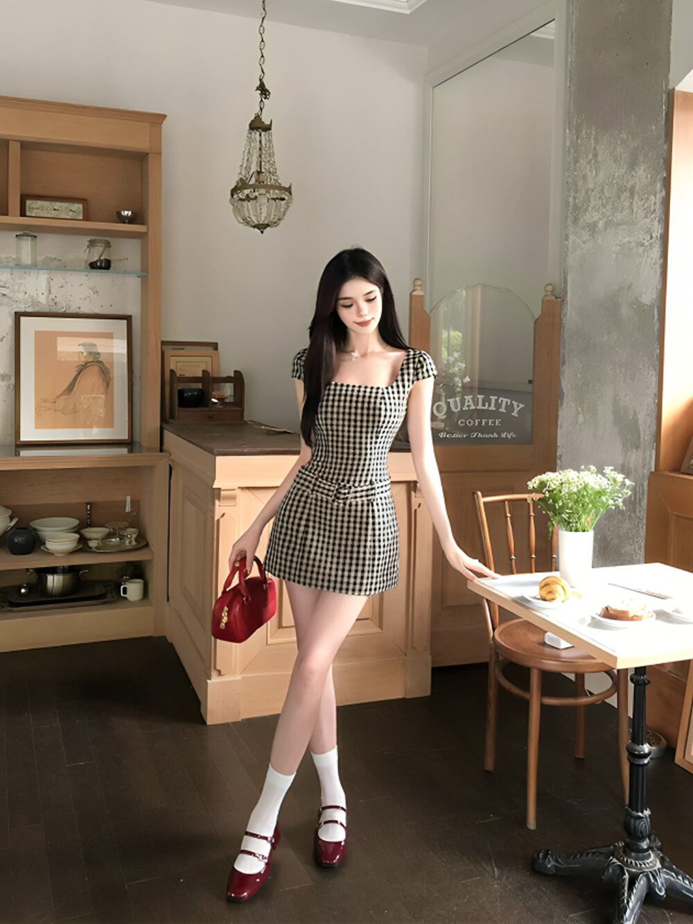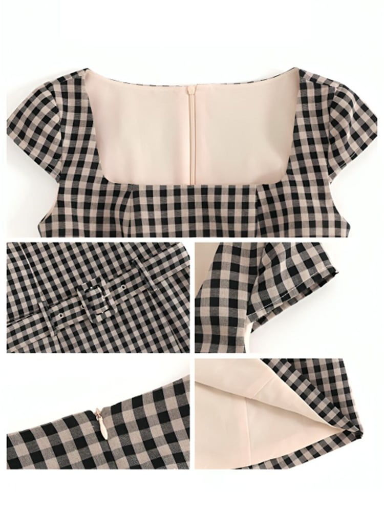 余白のあるエレガンスが楽しめる「ギンガムチェックコットンベルテッドスクエアネックミニワンピース」をお試しください♡