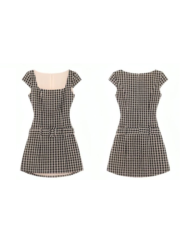 ギンガムチェックコットンベルテッドスクエアネックミニワンピース