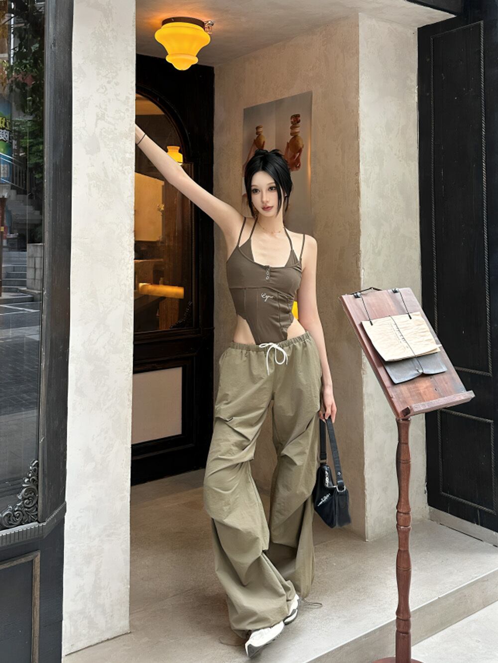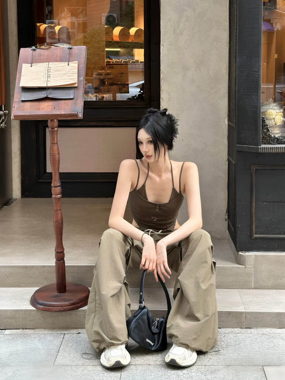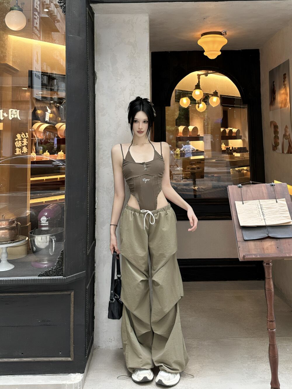 ブラウンキャミソールボディスーツに、 ゆるっとしたカーキパンツを合わせた