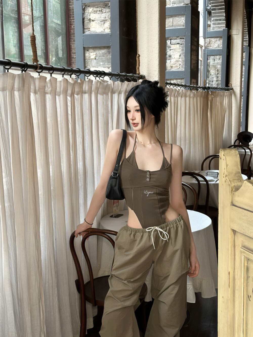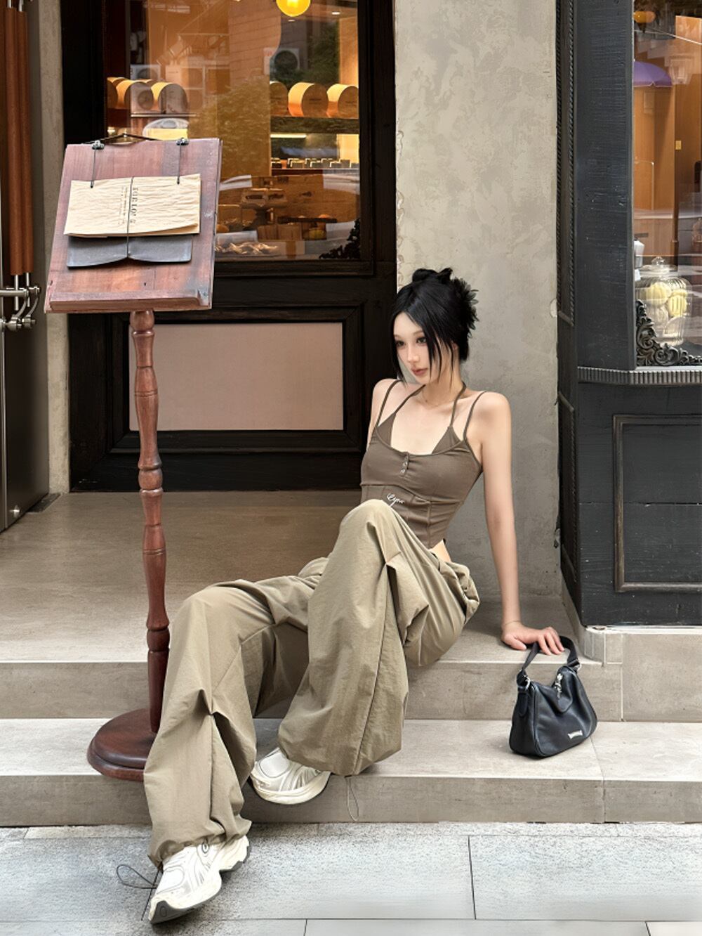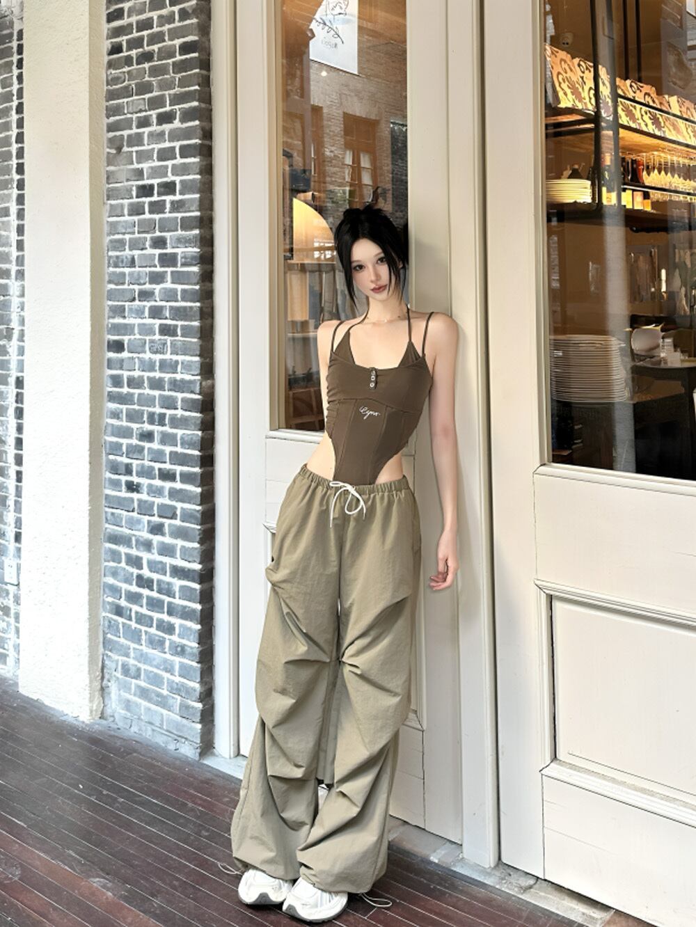 ブラウンキャミソールボディスーツに、 ゆるっとしたカーキパンツを合わせた