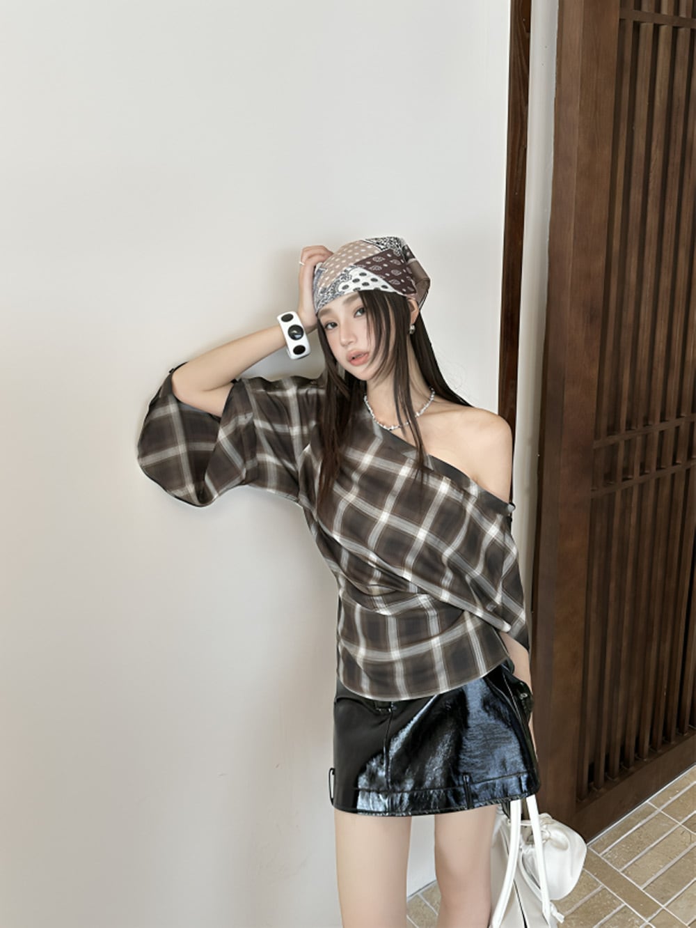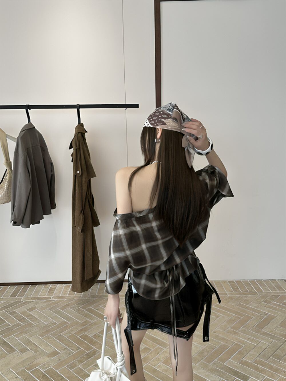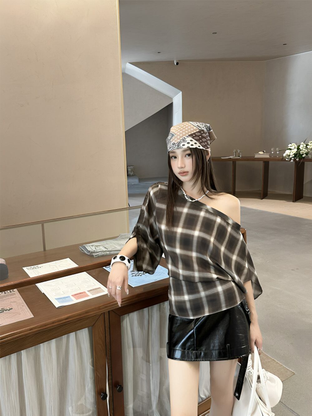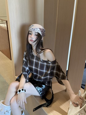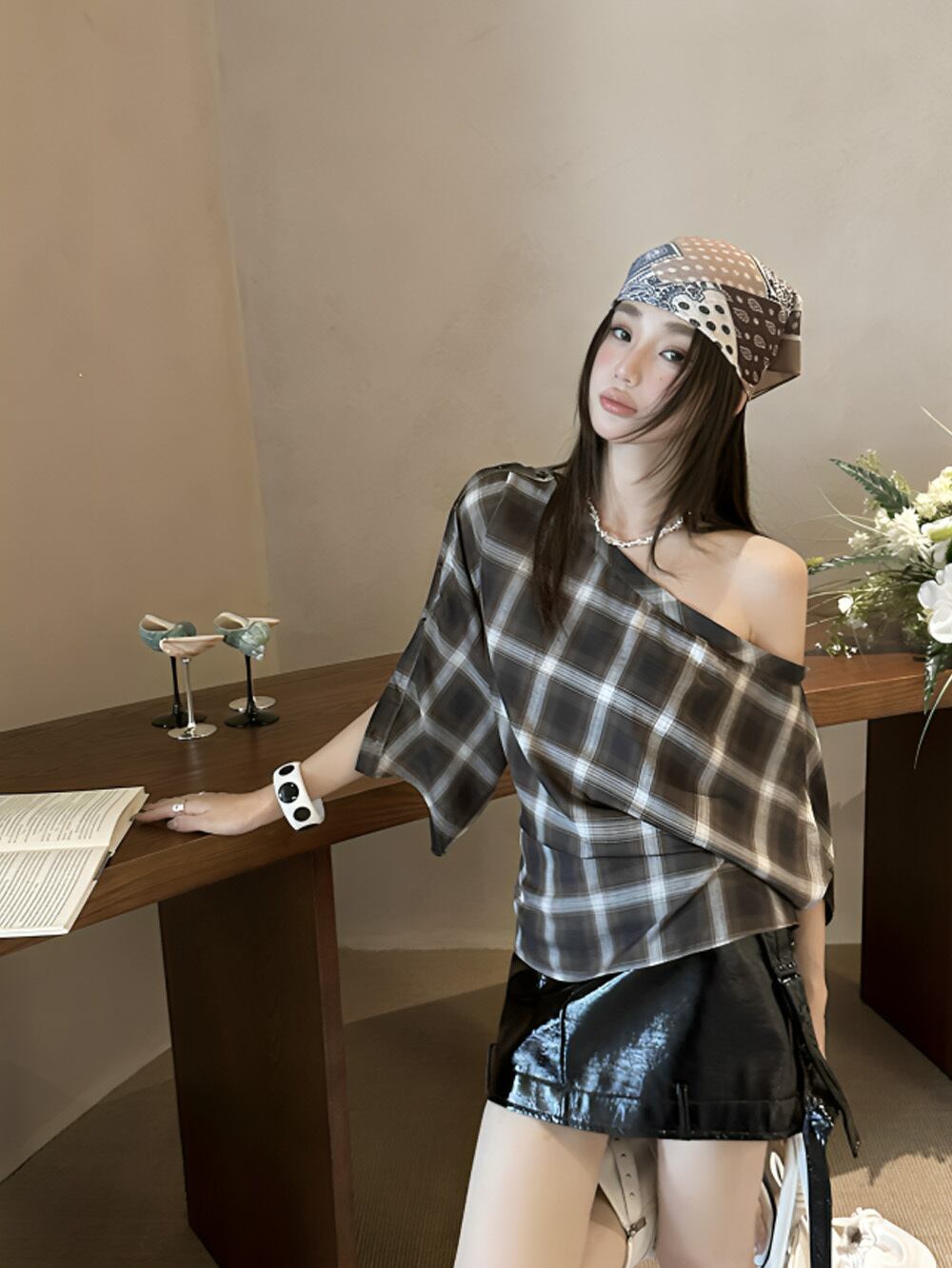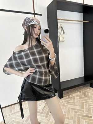 オーバーシルエットワンショルダーブラウンチェックトップスは、ヴィンテージの風をまとう、ラフさの中にひそむトレンド感。