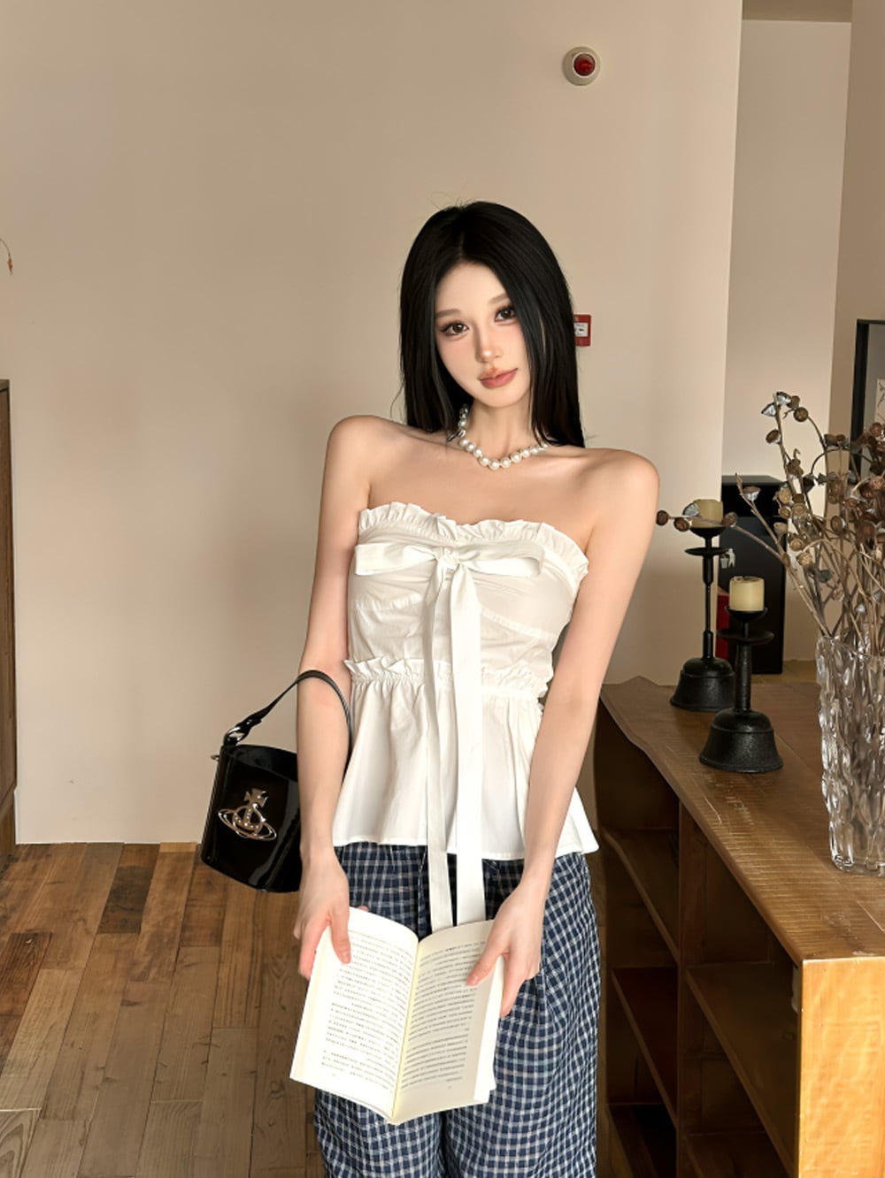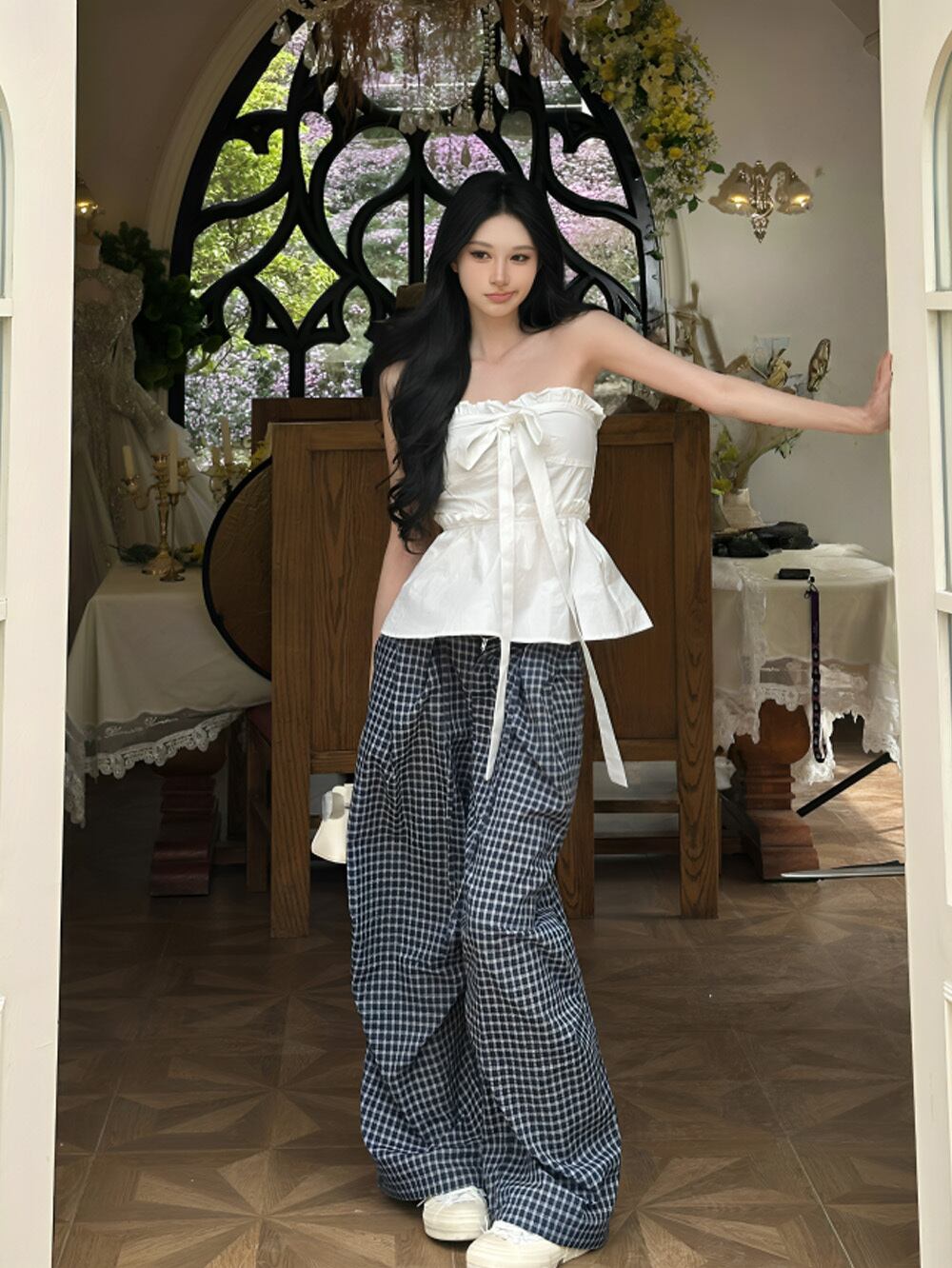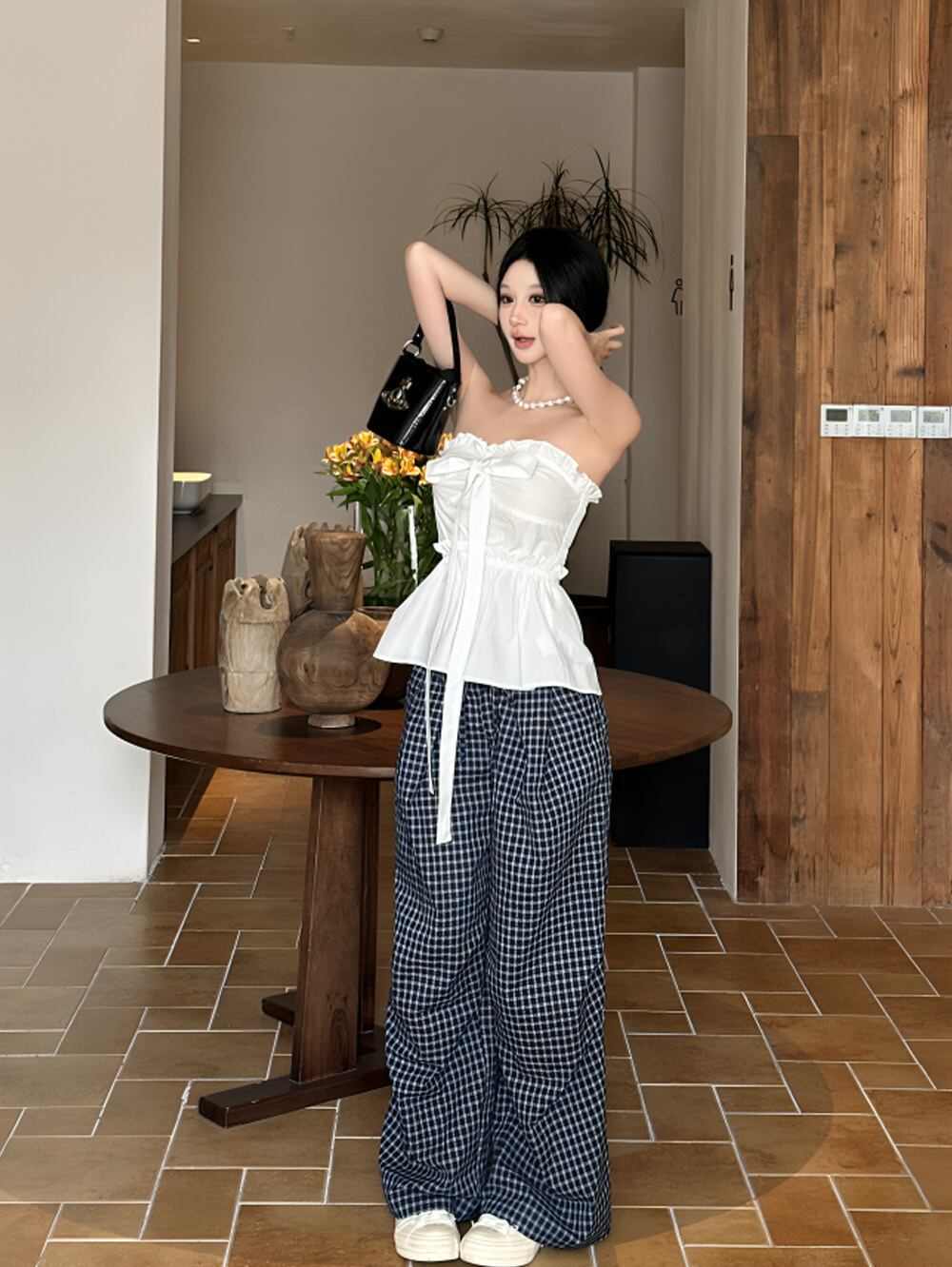 ペプラムデザインとチェックパターンが折り重なる