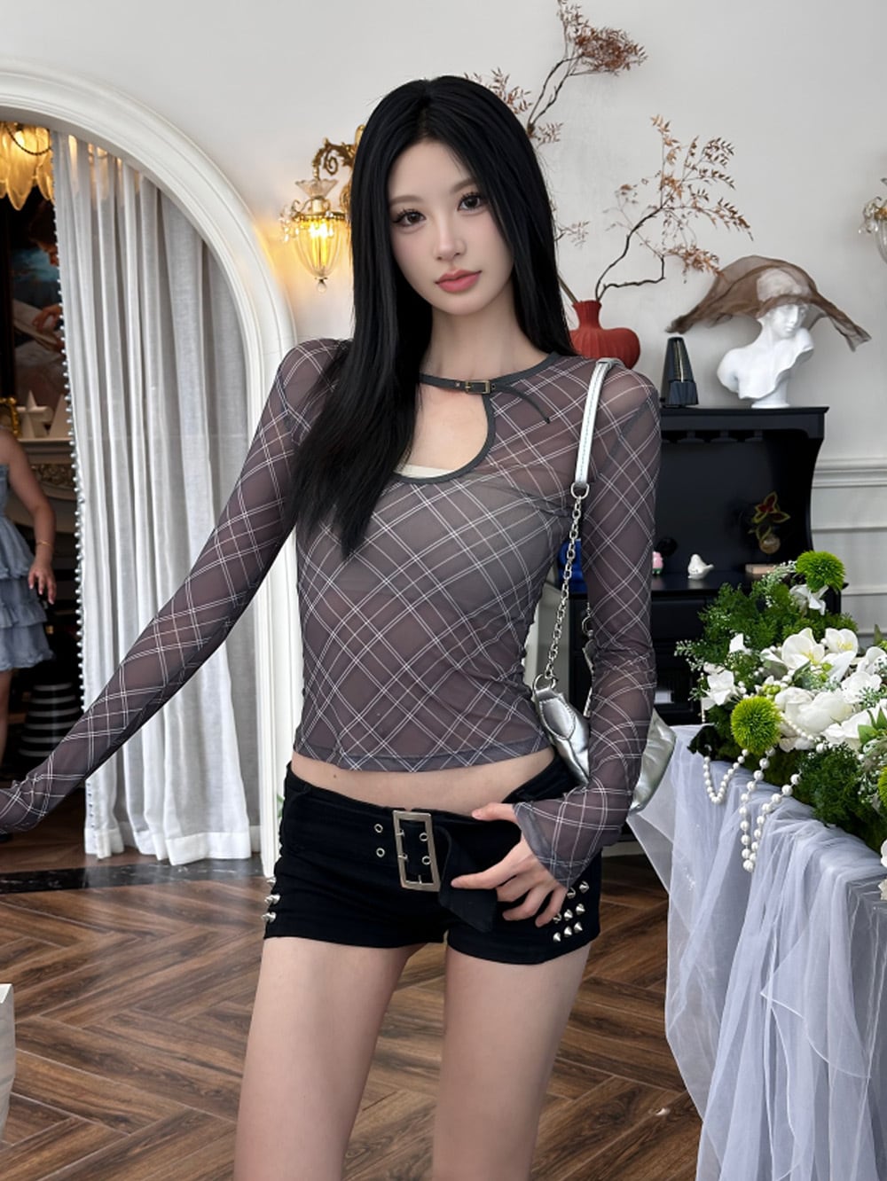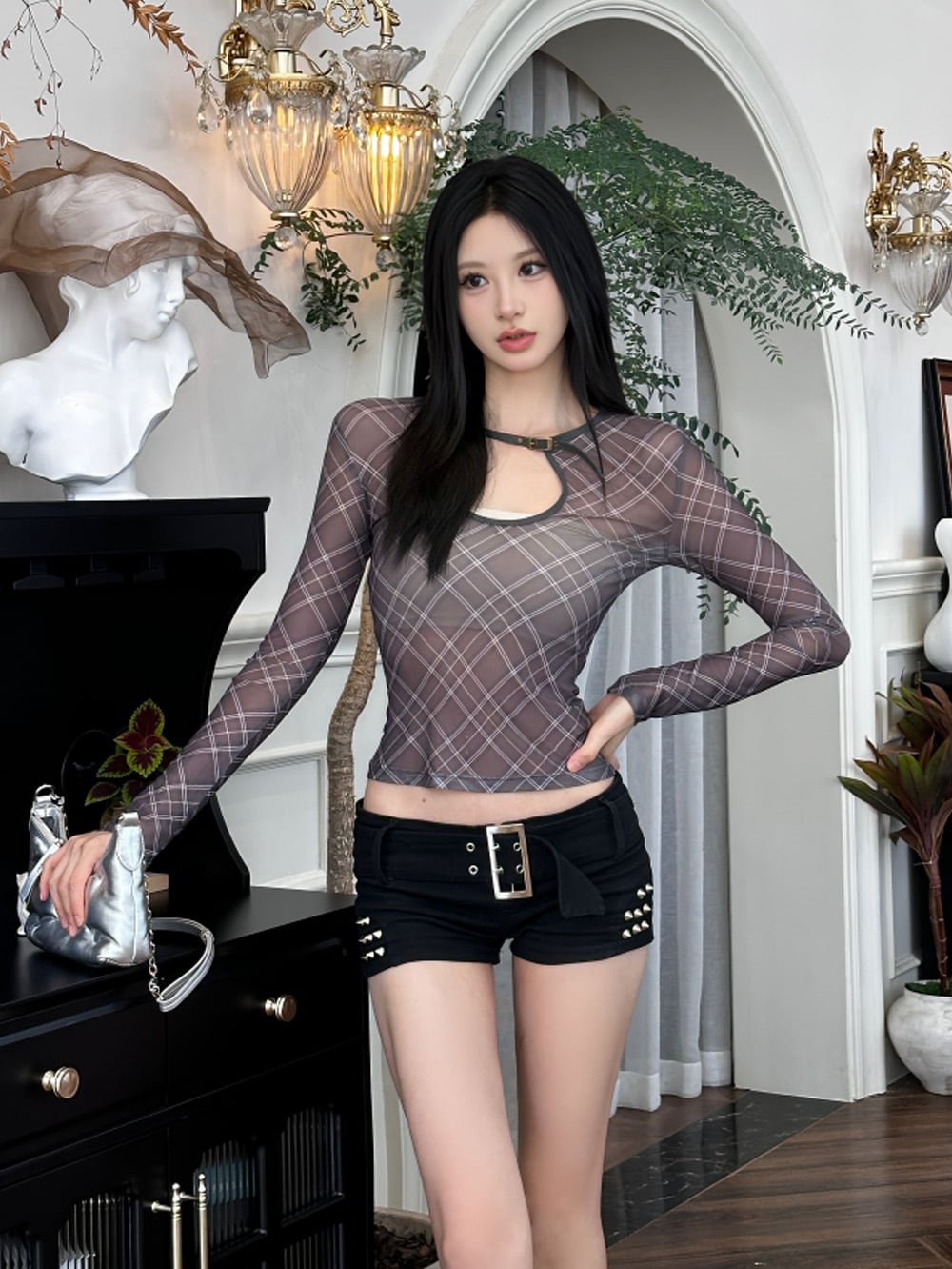 メッシュシースルーネックベルトチェックラインロングスリーブトップスは、スタイリッシュでフェミニンな美しさ、私らしさが光るアイテム。