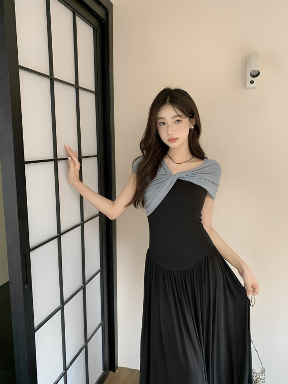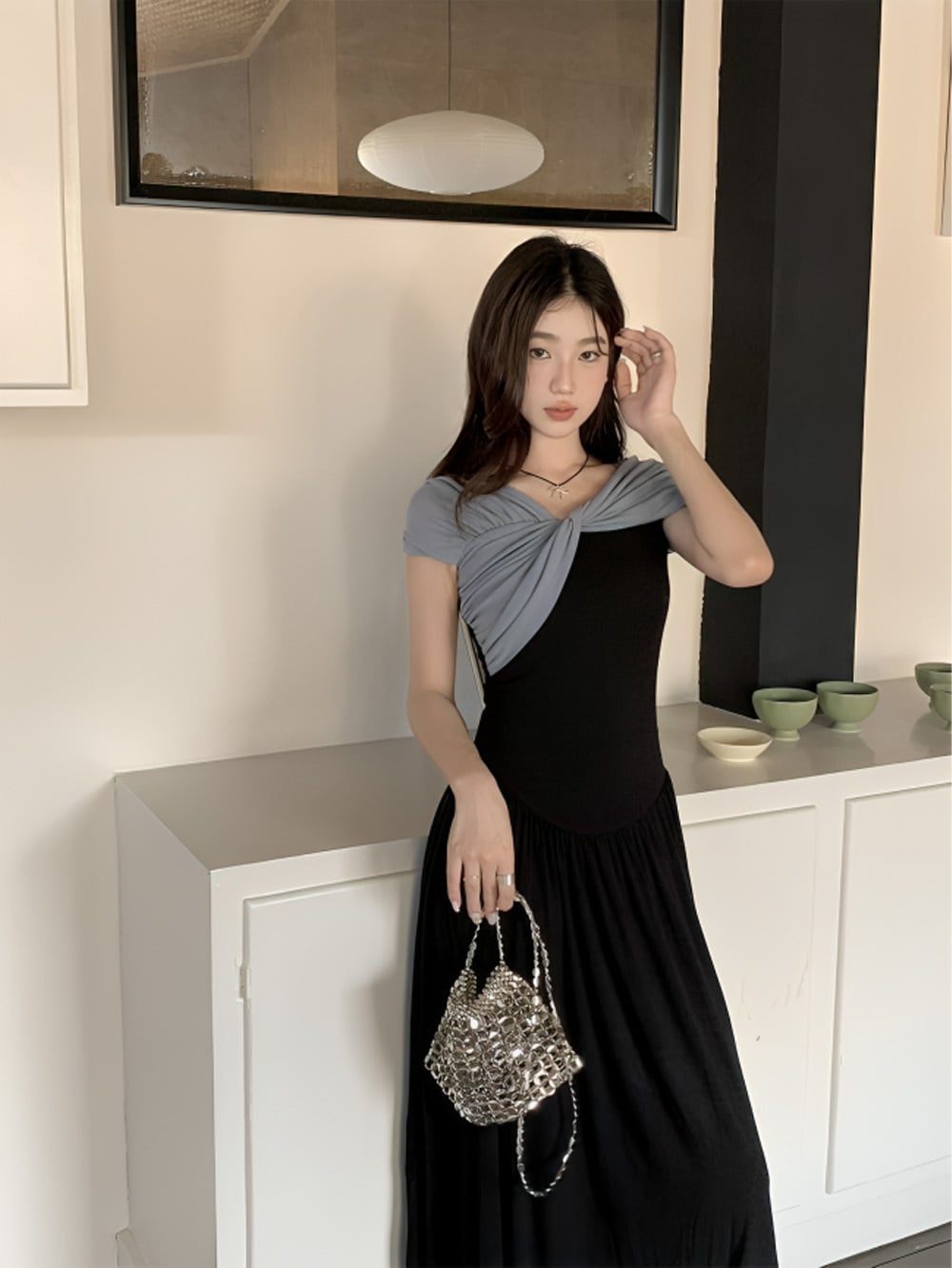 フェイクツーピースライトブルーアセンブルロングワンピースは、淡いブルーと、深いブラックのコントラストが大人可愛いアイテム。