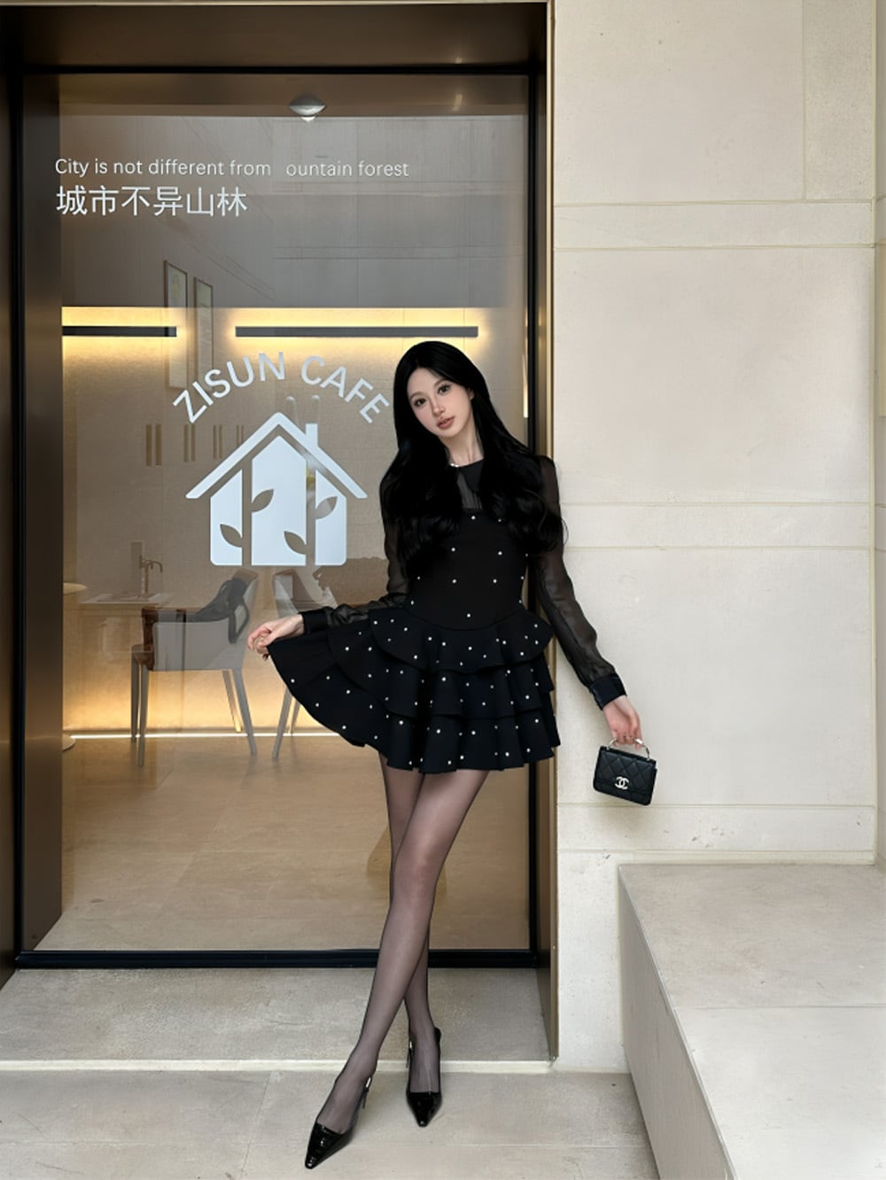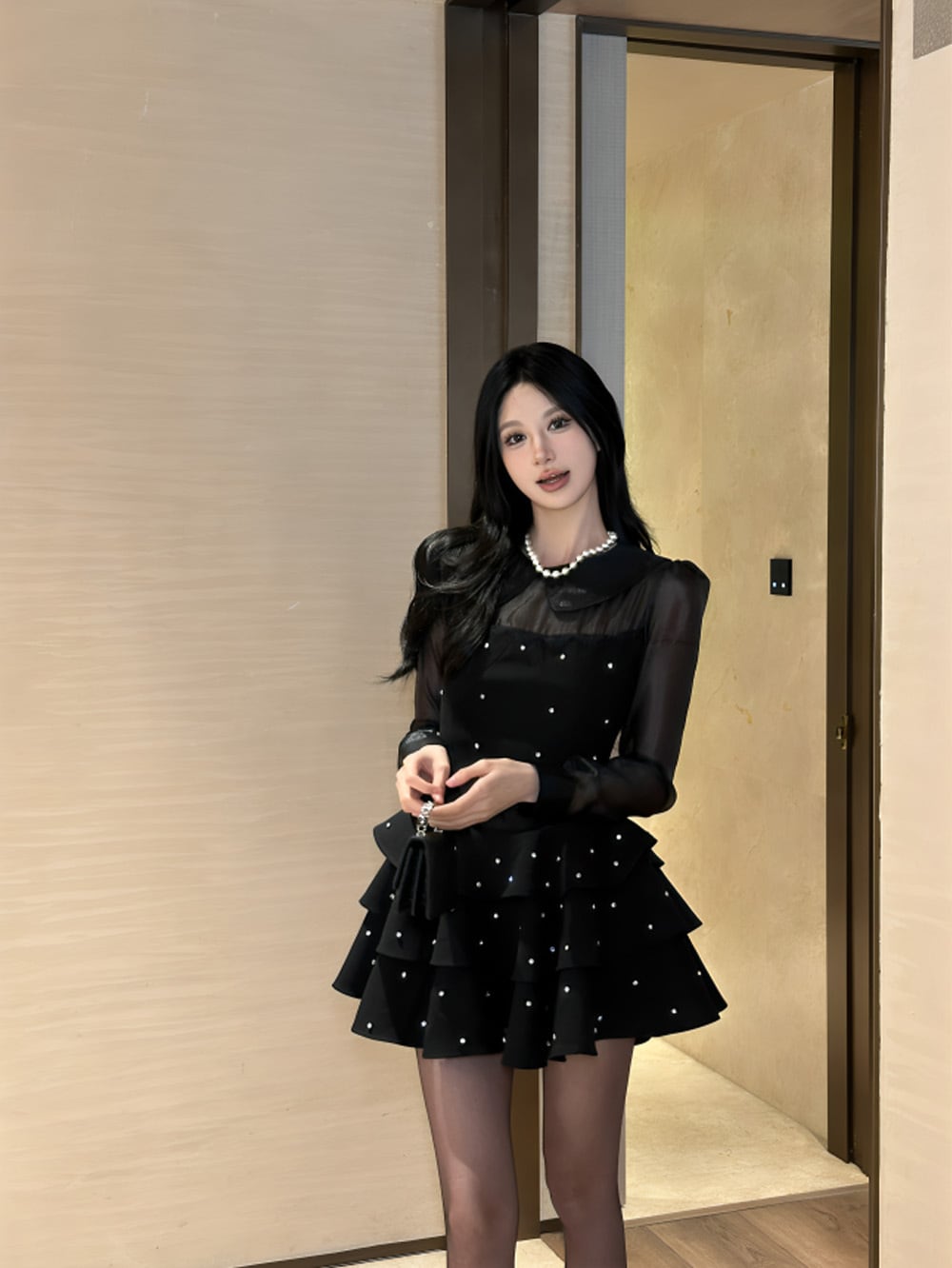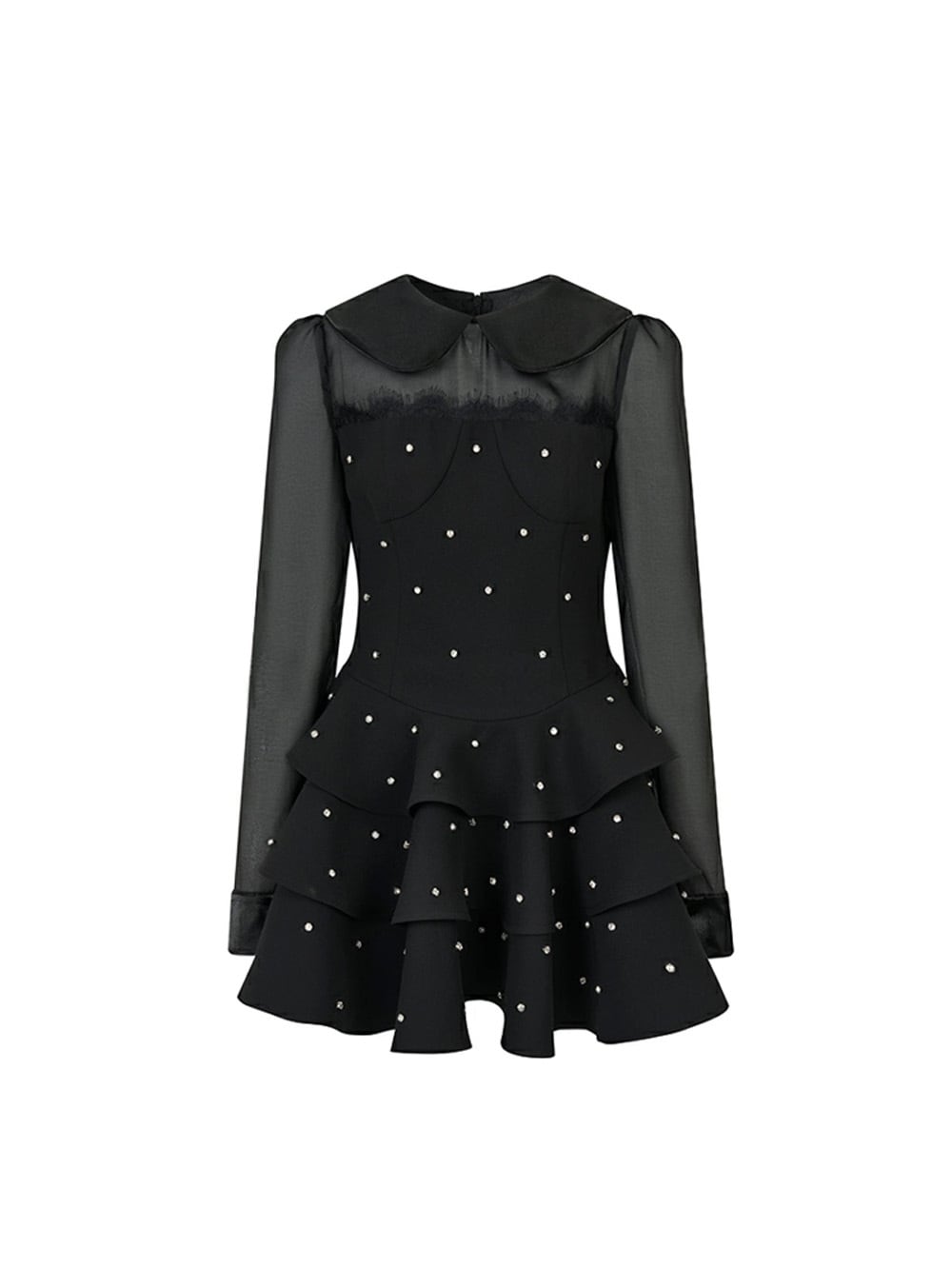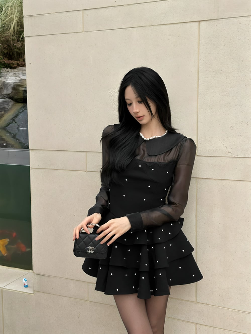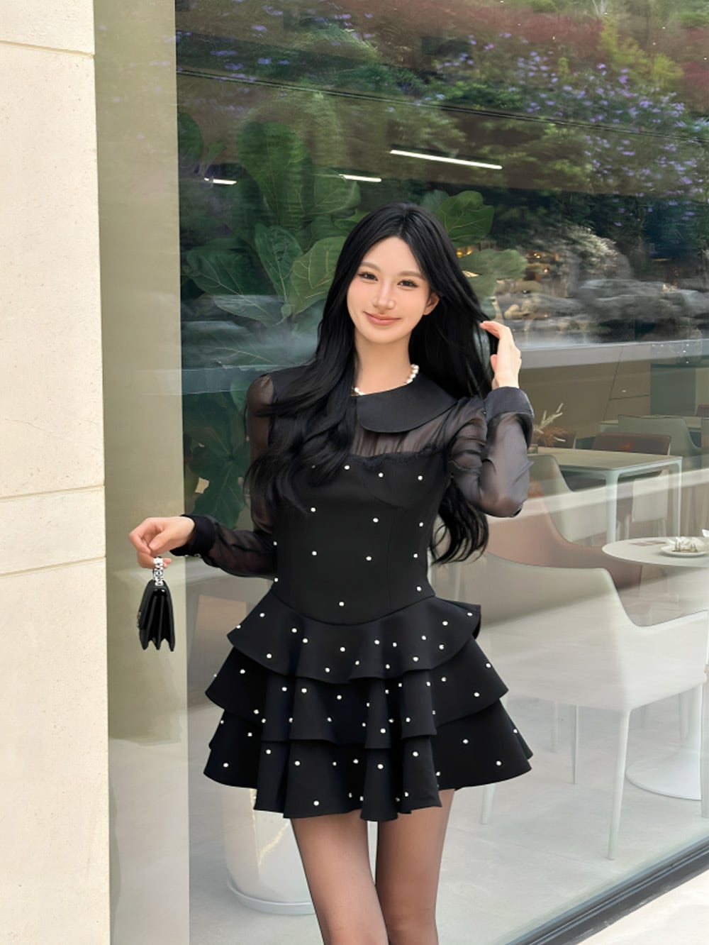 メッシュシースルースリーブビジュードットレイヤリングワンピースは、トレンド感と優雅さをマッチングさせたアイテム。