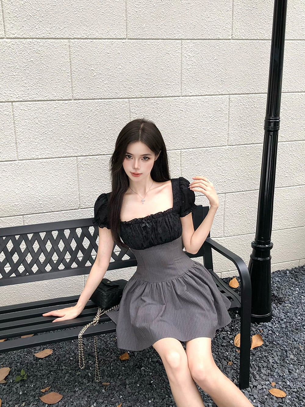 #大人可愛い|ダブルファブリックアセンブルスクエアネックミニワンピース