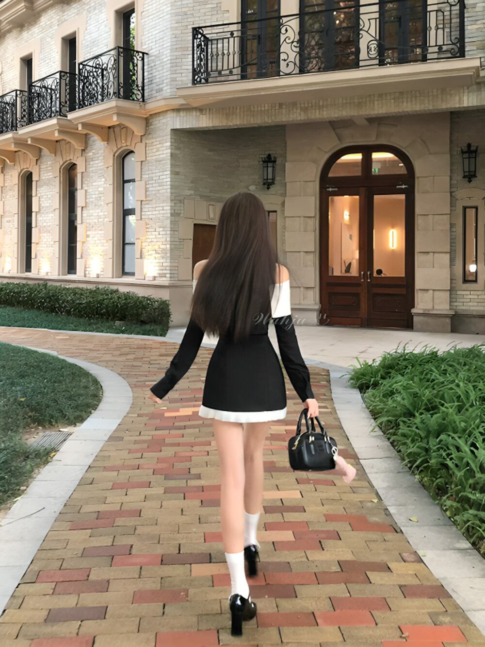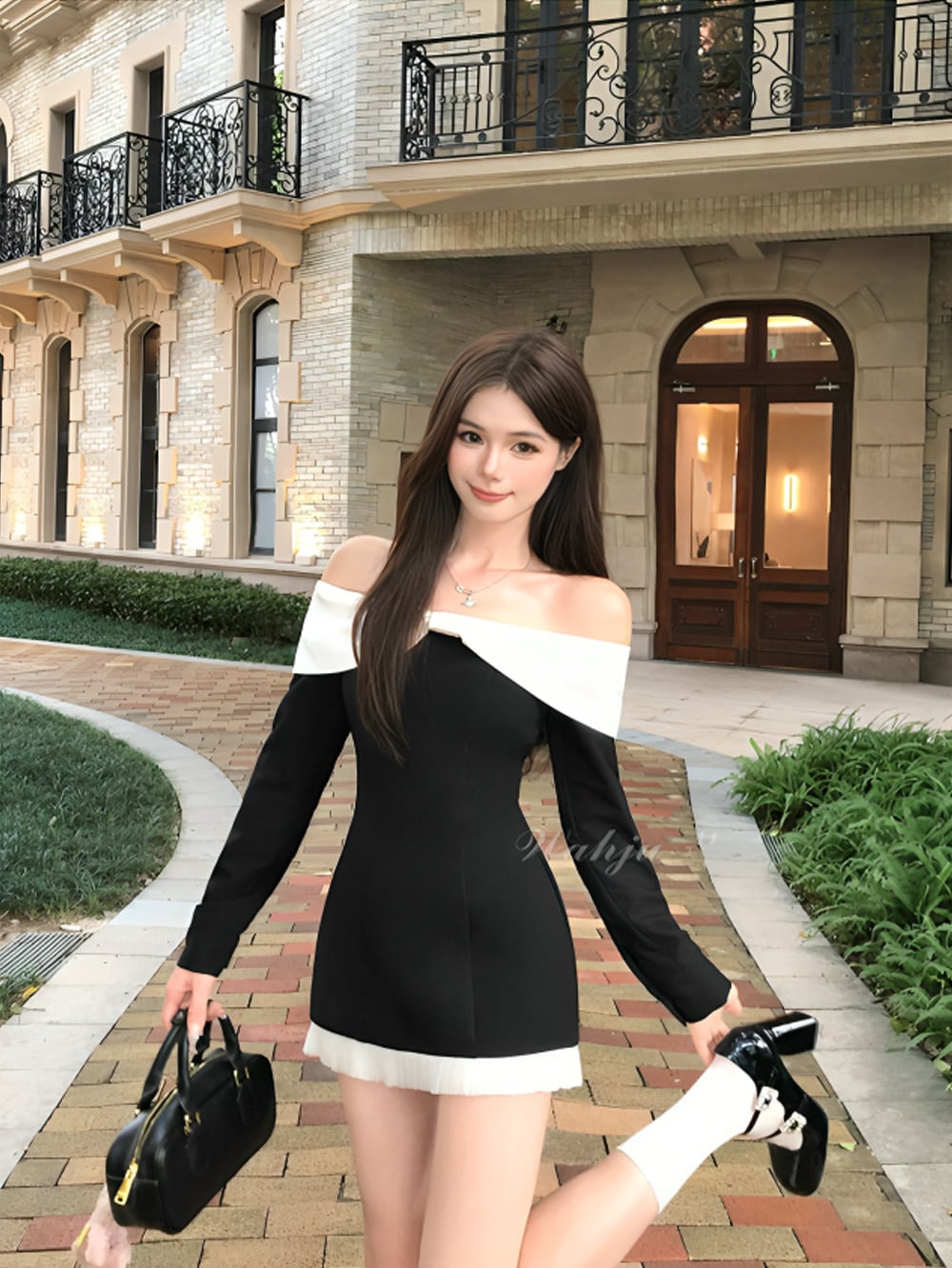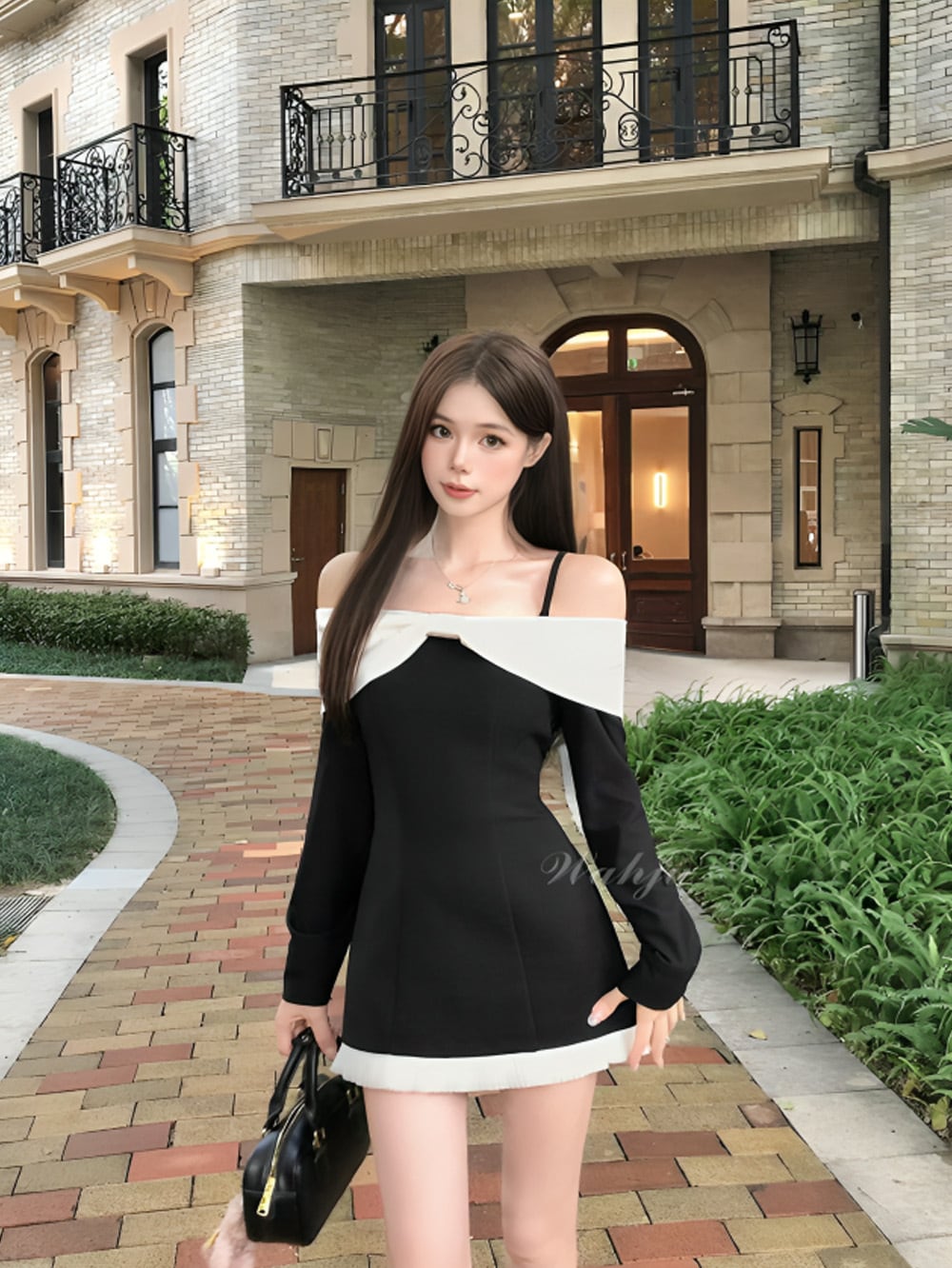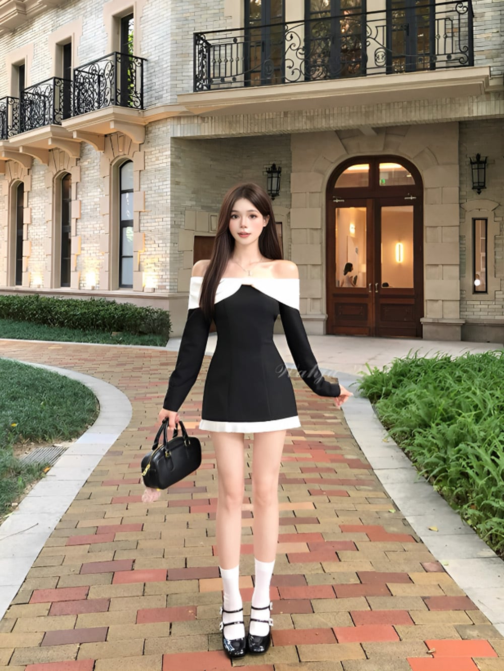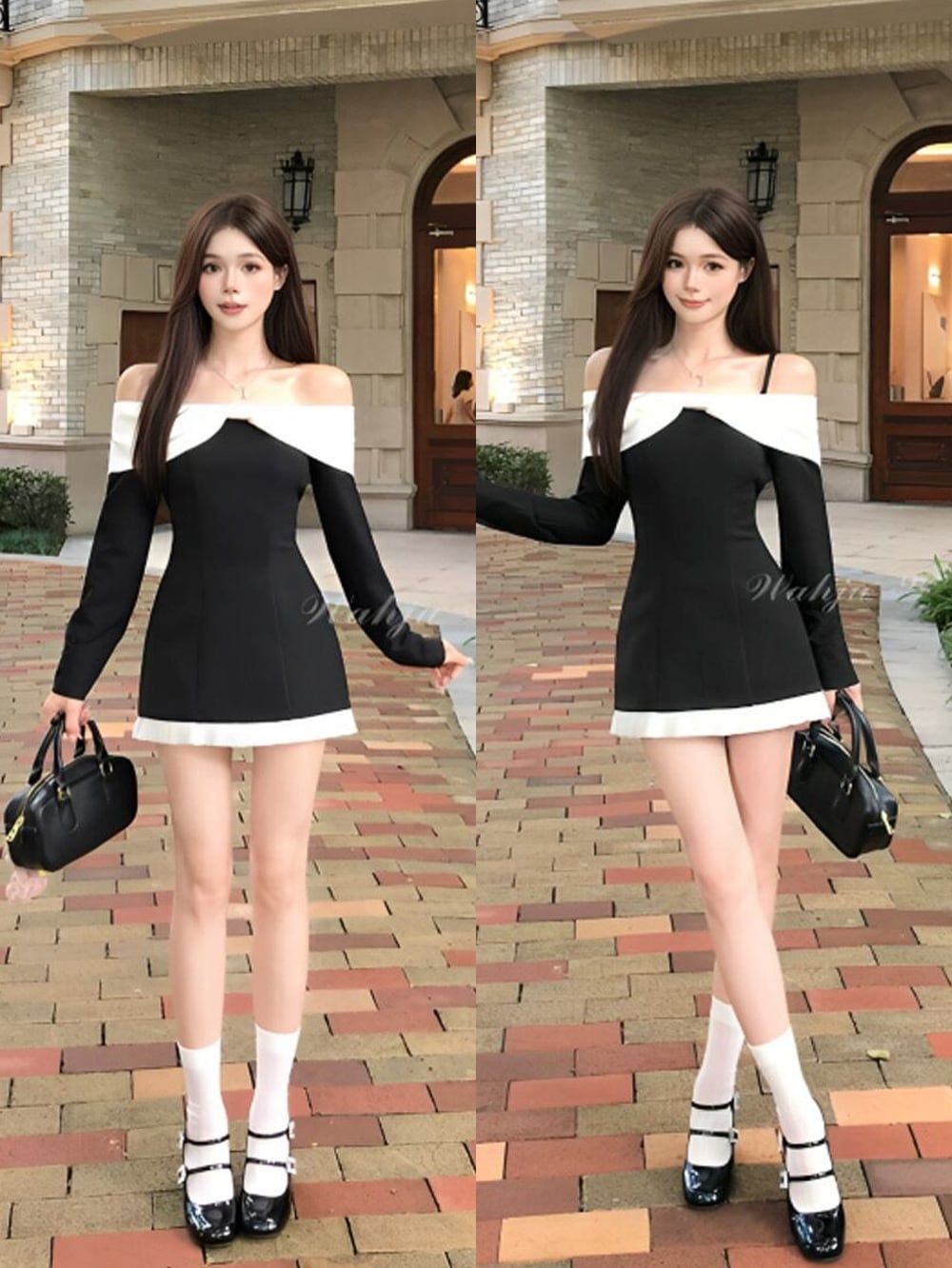 肩のラインを美しく魅せるオフショルデザインに、ホワイトの切り替えがアクセントとなり、上品なフェミニンさをプラス。