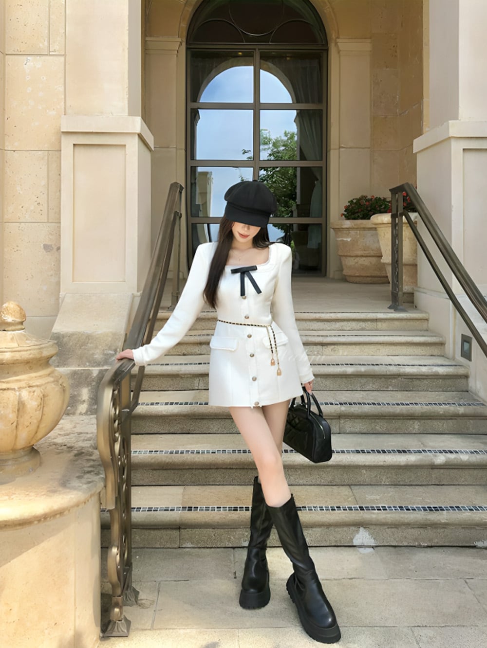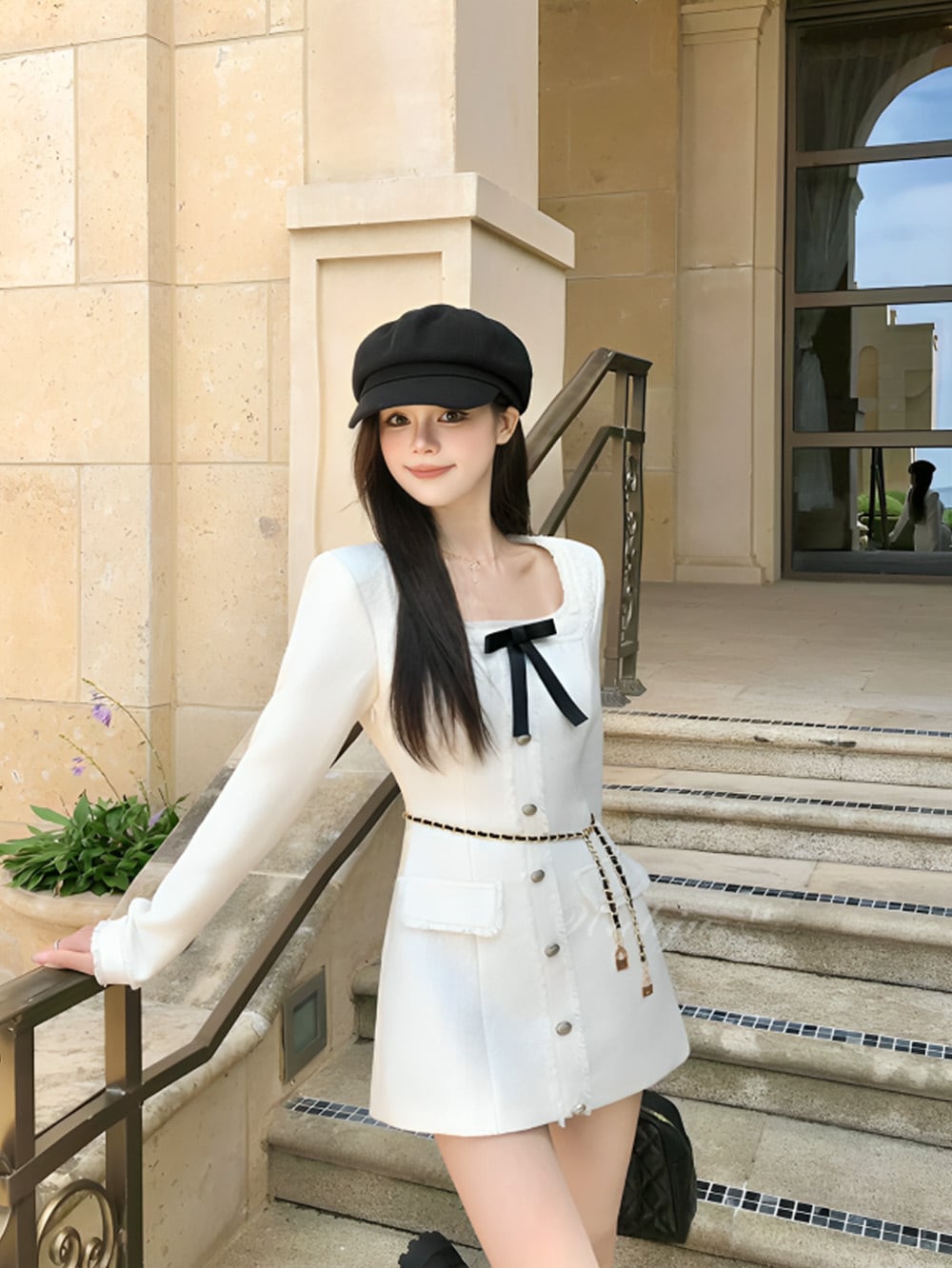 ベルトアタッチホワイトツイードモチーフリムーバブルリボンワンピースは、レザーチェーンベルトと取り外し可能なフロントブラックリボンが付属したアイテム。
