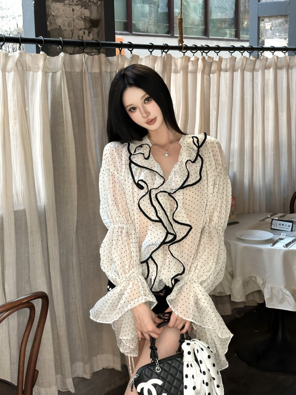 "甘さと大人っぽさをひとさじずつ"加えた「ブラックラインシアードットフレアスリーブトップス」をお楽しみください♡