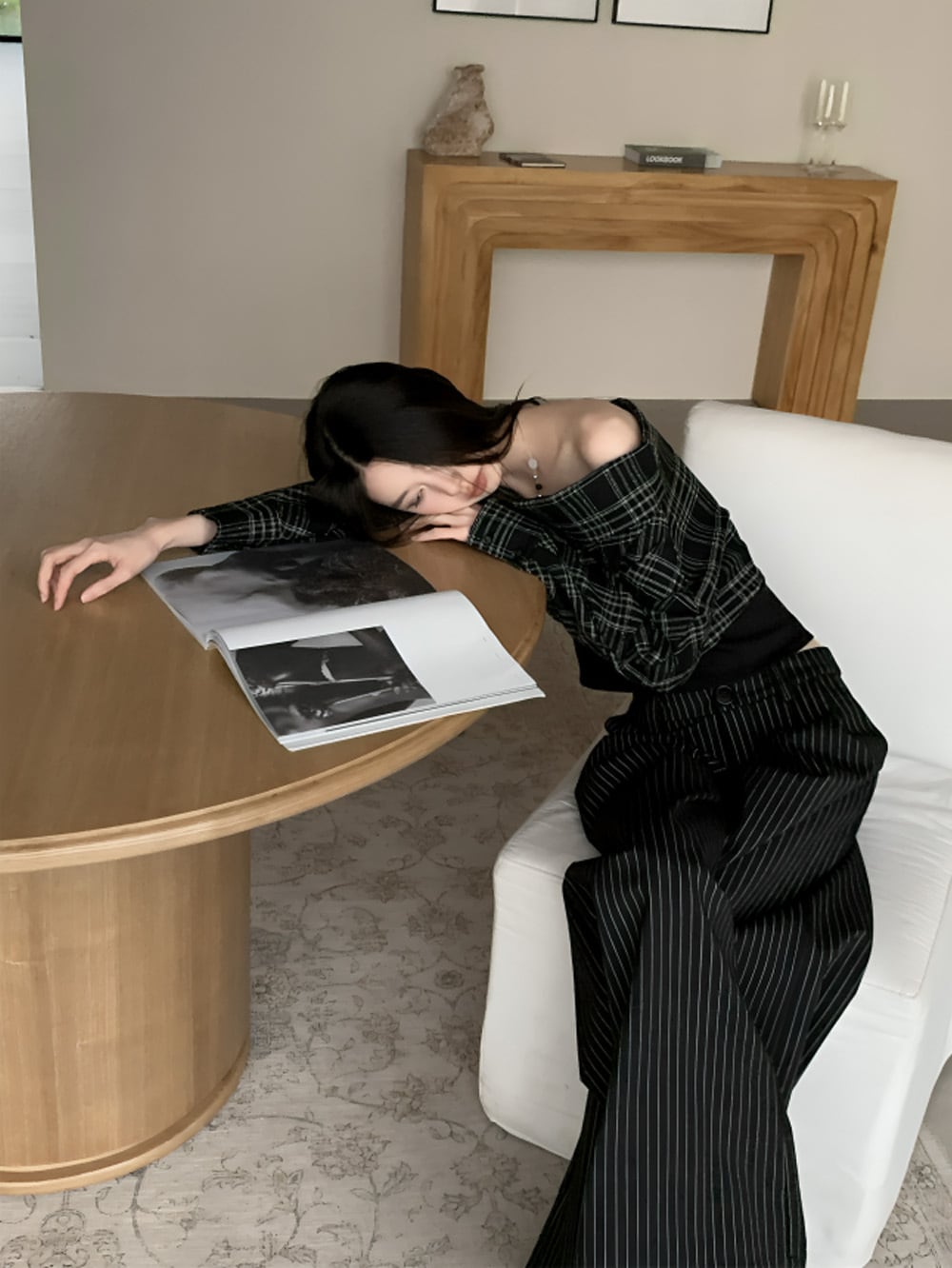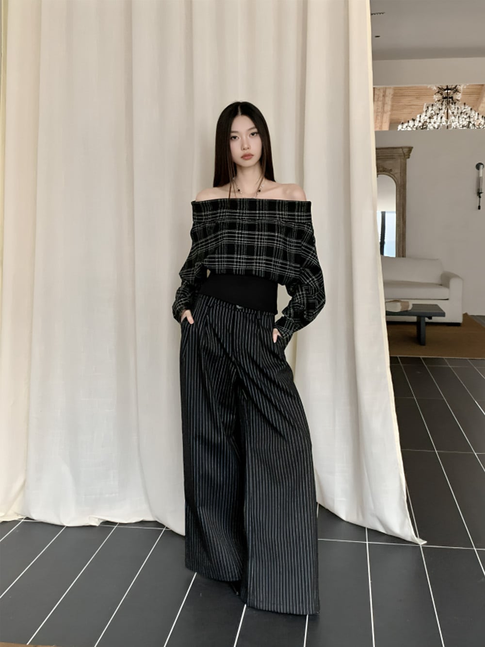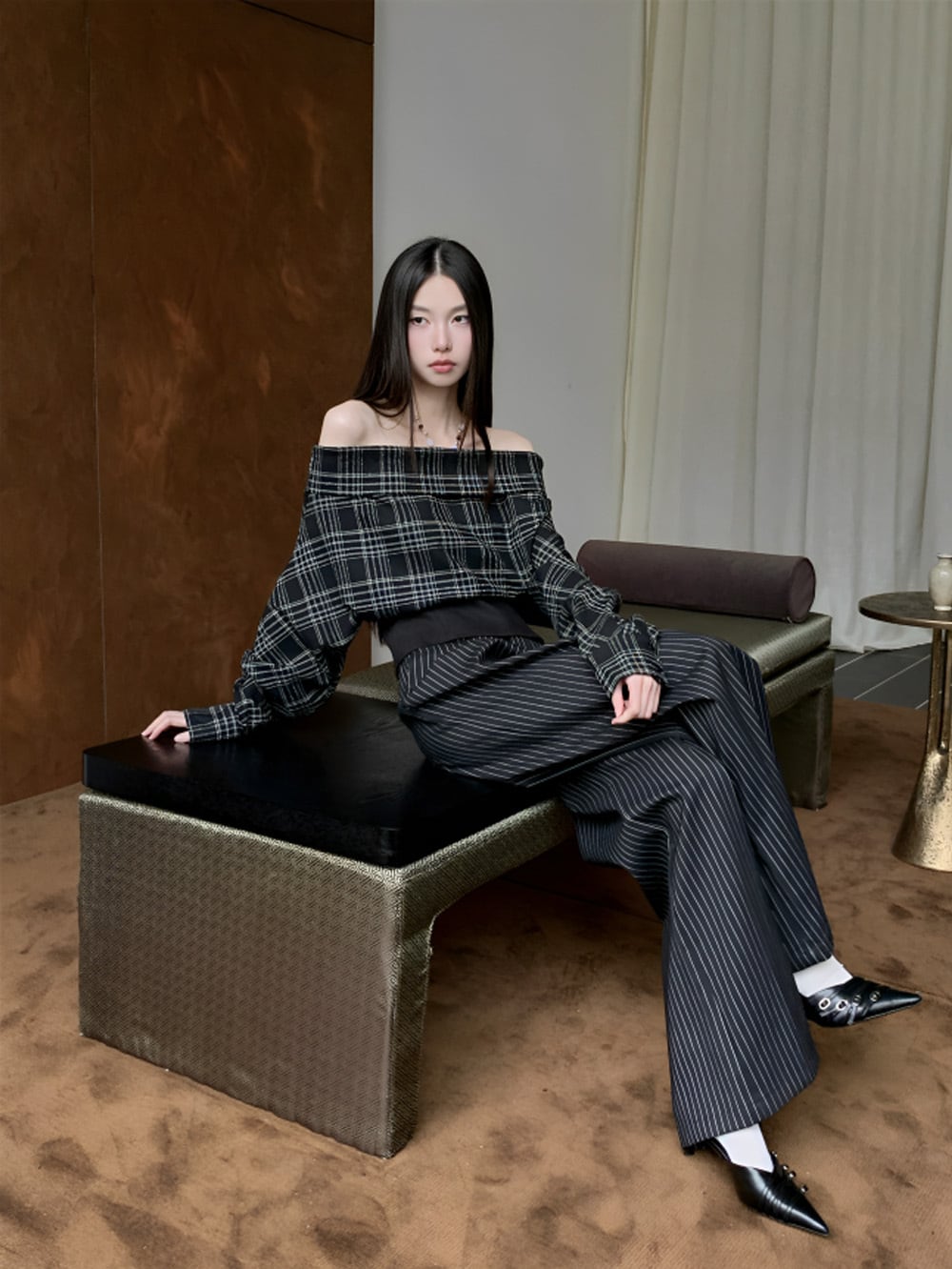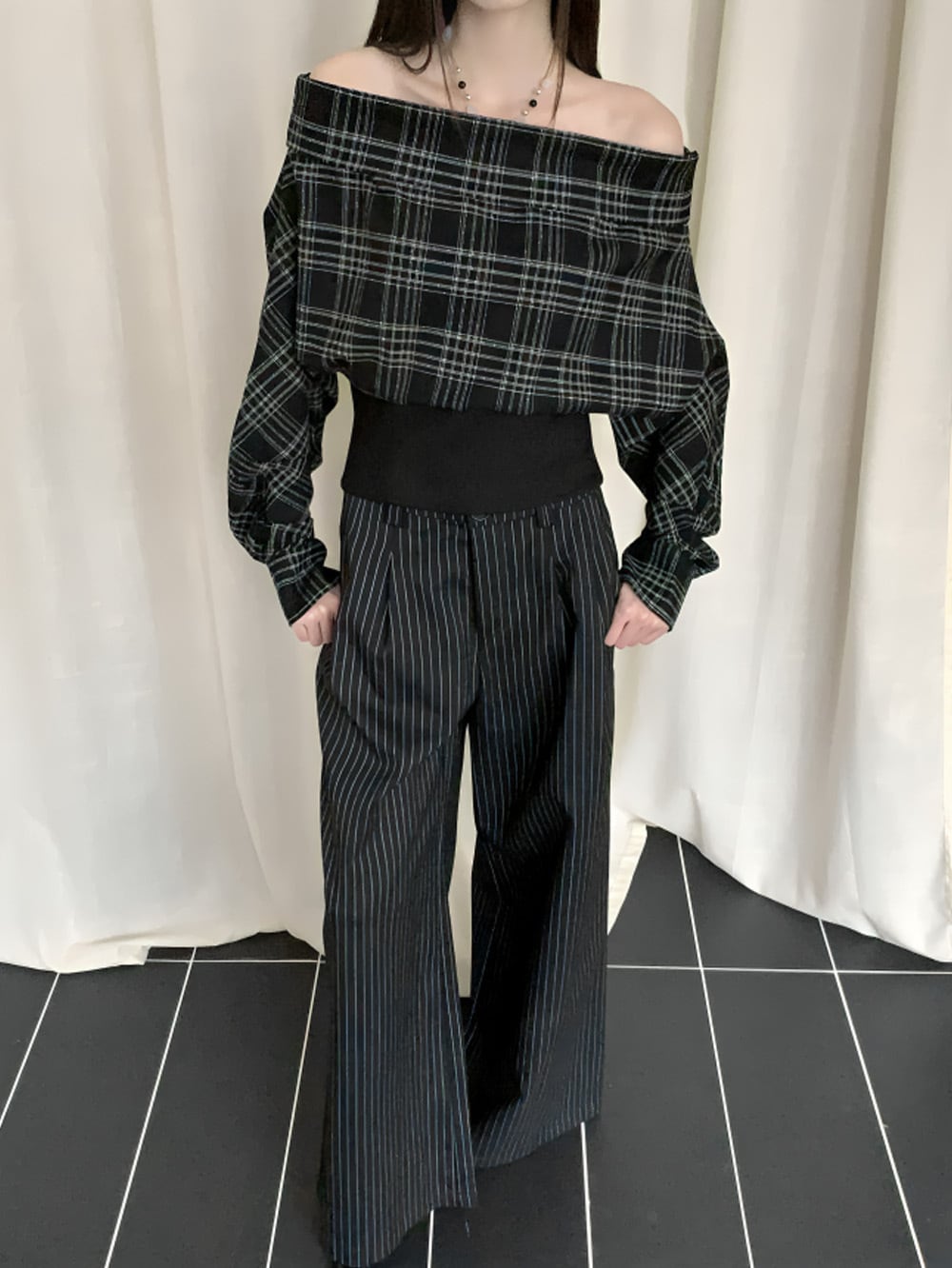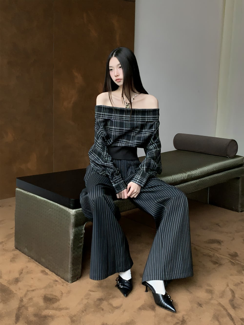 モダンチェックオフショルダートップス&メインストライプロングパンツ|Atelier Item