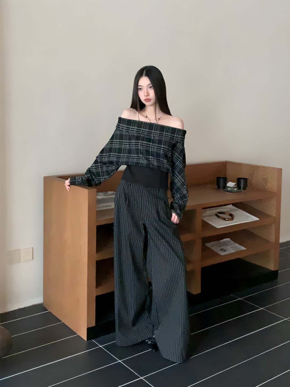 モダンチェックオフショルダートップス&メインストライプロングパンツは、シンプルながらも確実にお洒落と思わせるコーディネートセット。