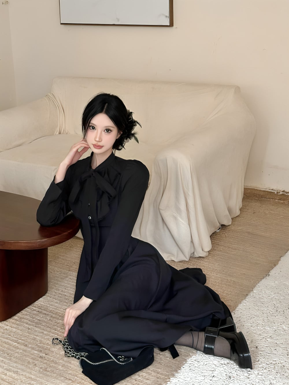 フレンチスタイルフロントリボンブラックロングワンピース|Atelier Item