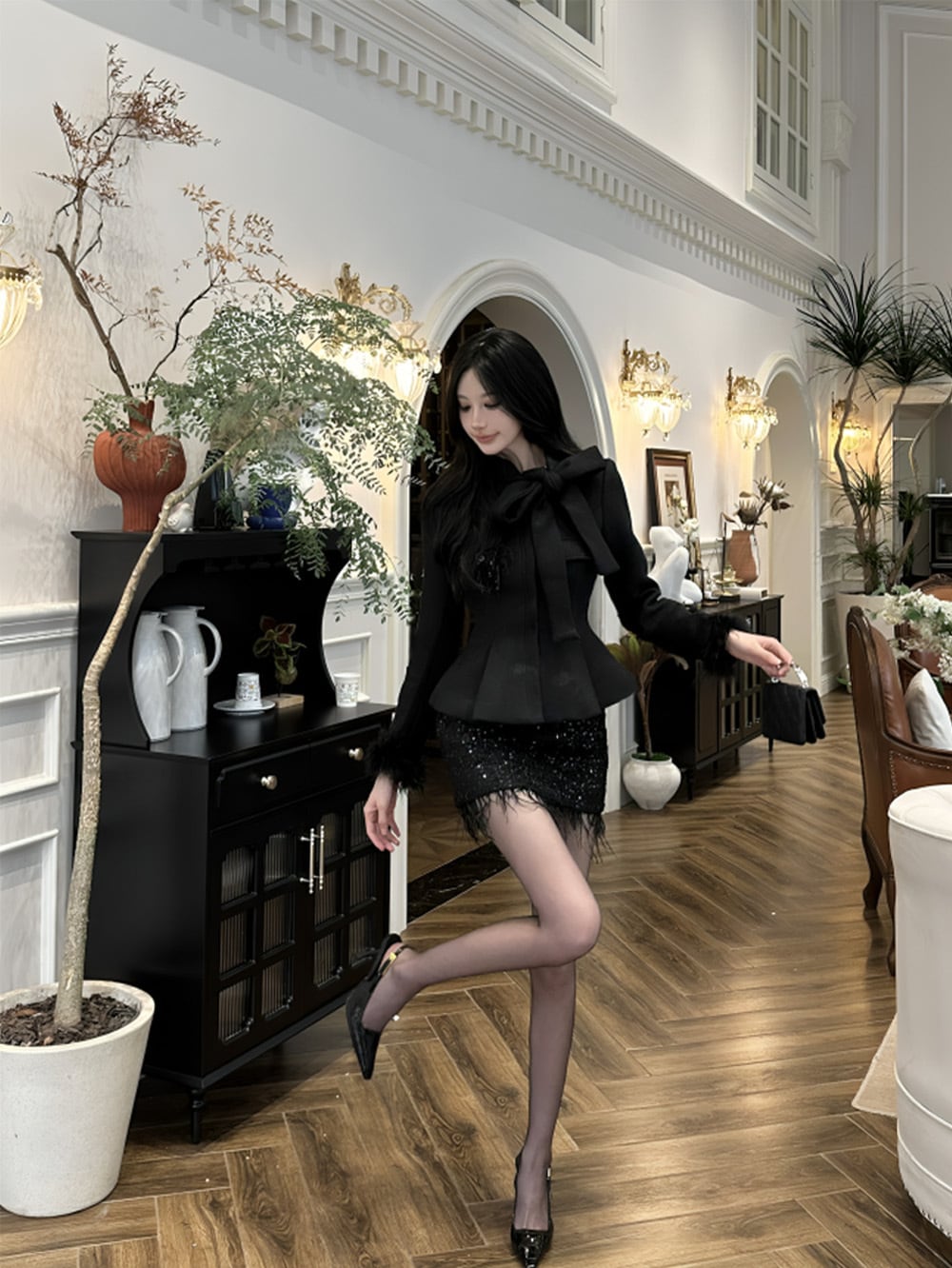スタイルに自信を持たせてくれる「#財閥千金穿搭|ネックコードペプラムヘムフリンジ+スパンコールミニスカートセットアップ」をお楽しみください♡