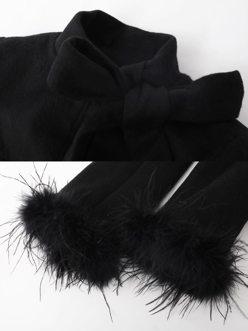 首元の大きなボウタイは、エレガントなリボン結びで顔周りを華やかに彩り、