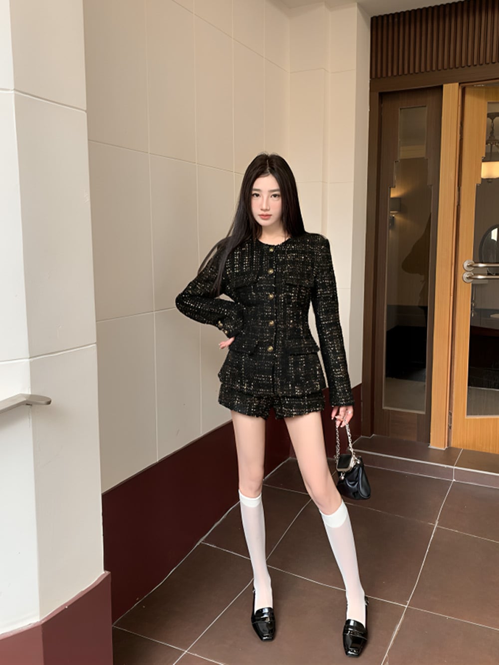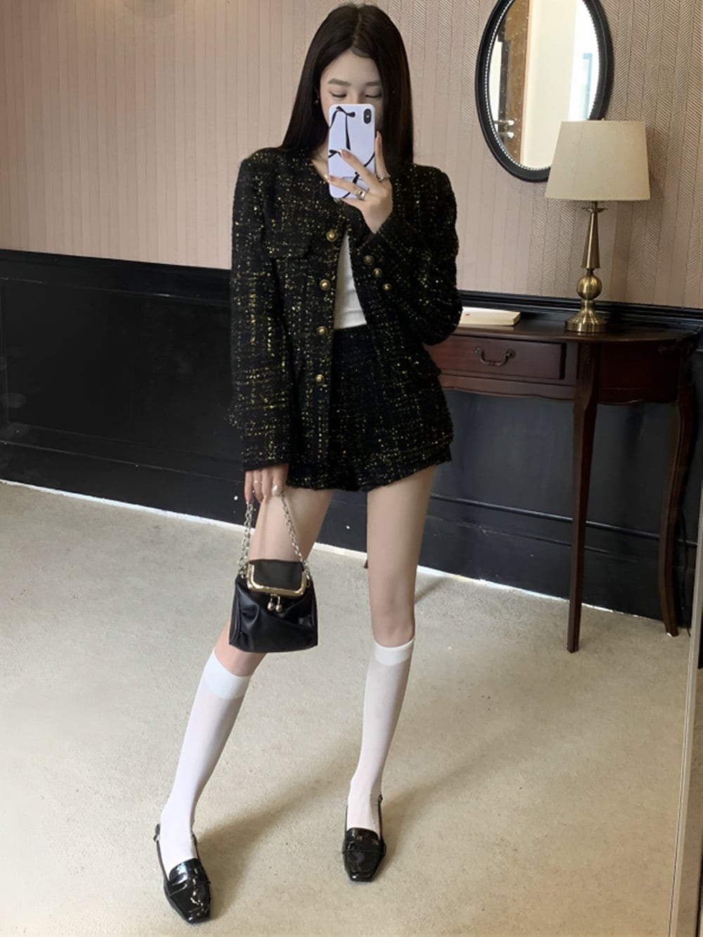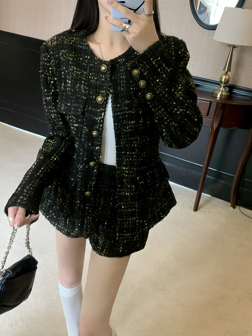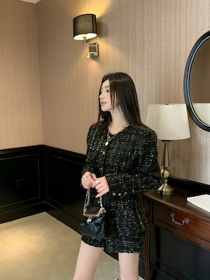 #きれいめ|ブラックゴールドツイードモチーフジャケット+ショートパンツセットアップ|Atelier Item