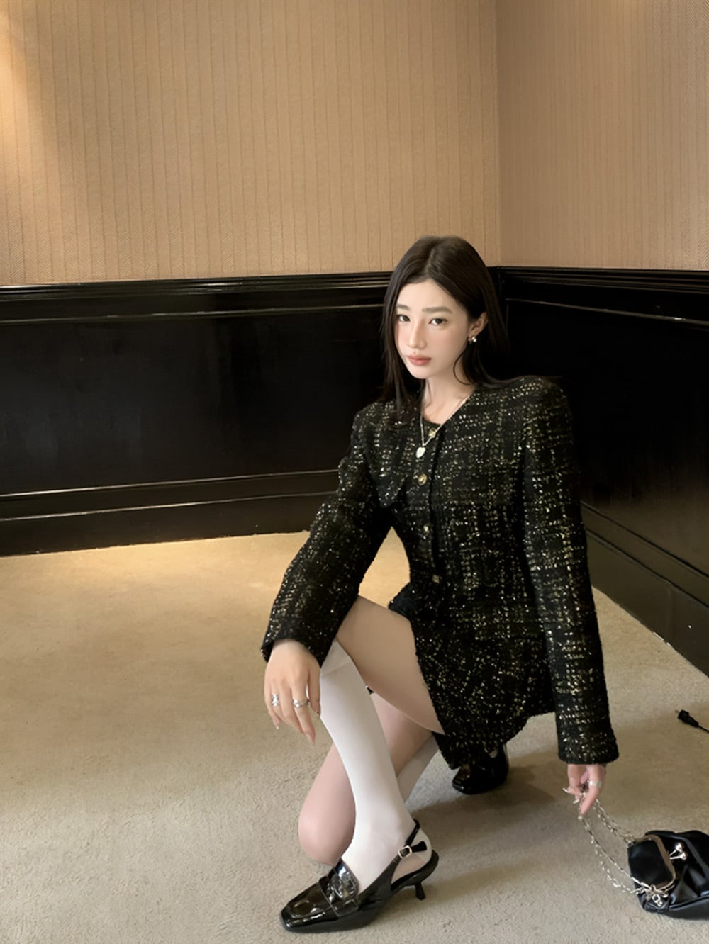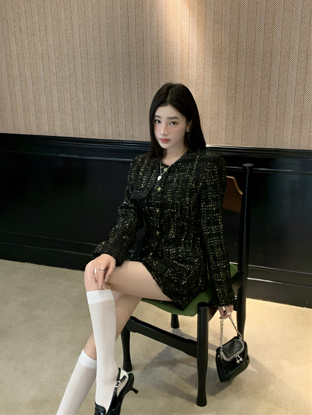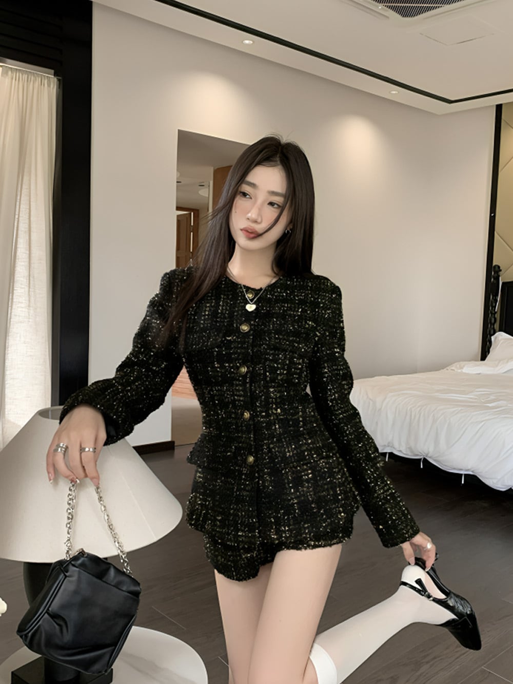 ツイードの可愛さを前面に出した「ブラックゴールドツイードモチーフジャケット+ショートパンツセットアップ」をお楽しみください♡