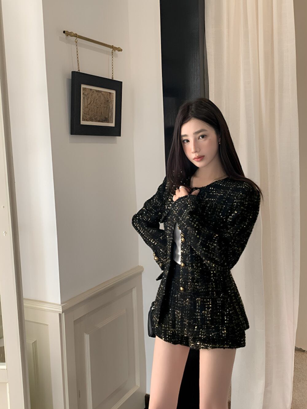 #きれいめ|ブラックゴールドツイードモチーフジャケット+ショートパンツセットアップは、センス溢れるゴールドがきらめくコーディネートセット。