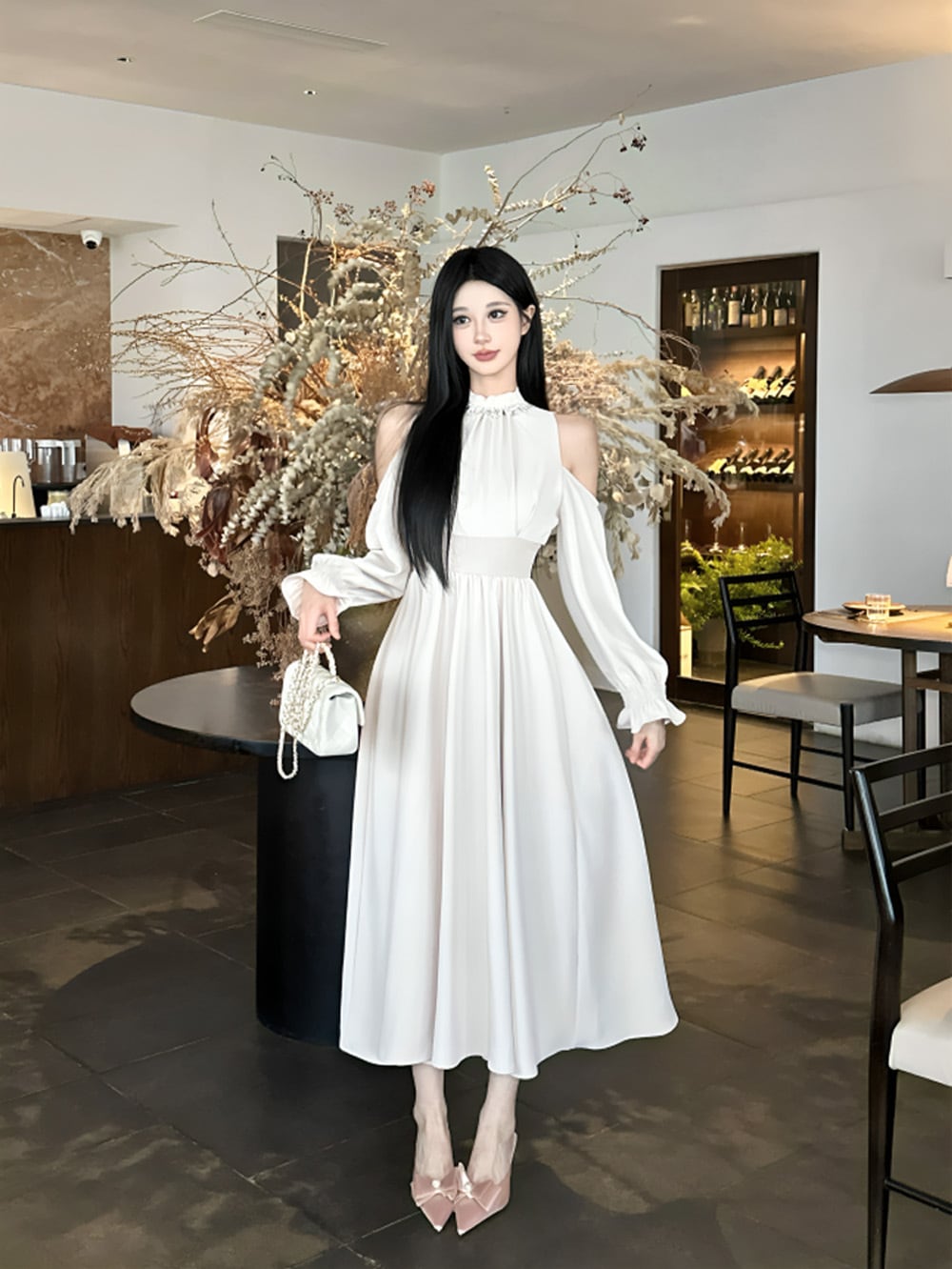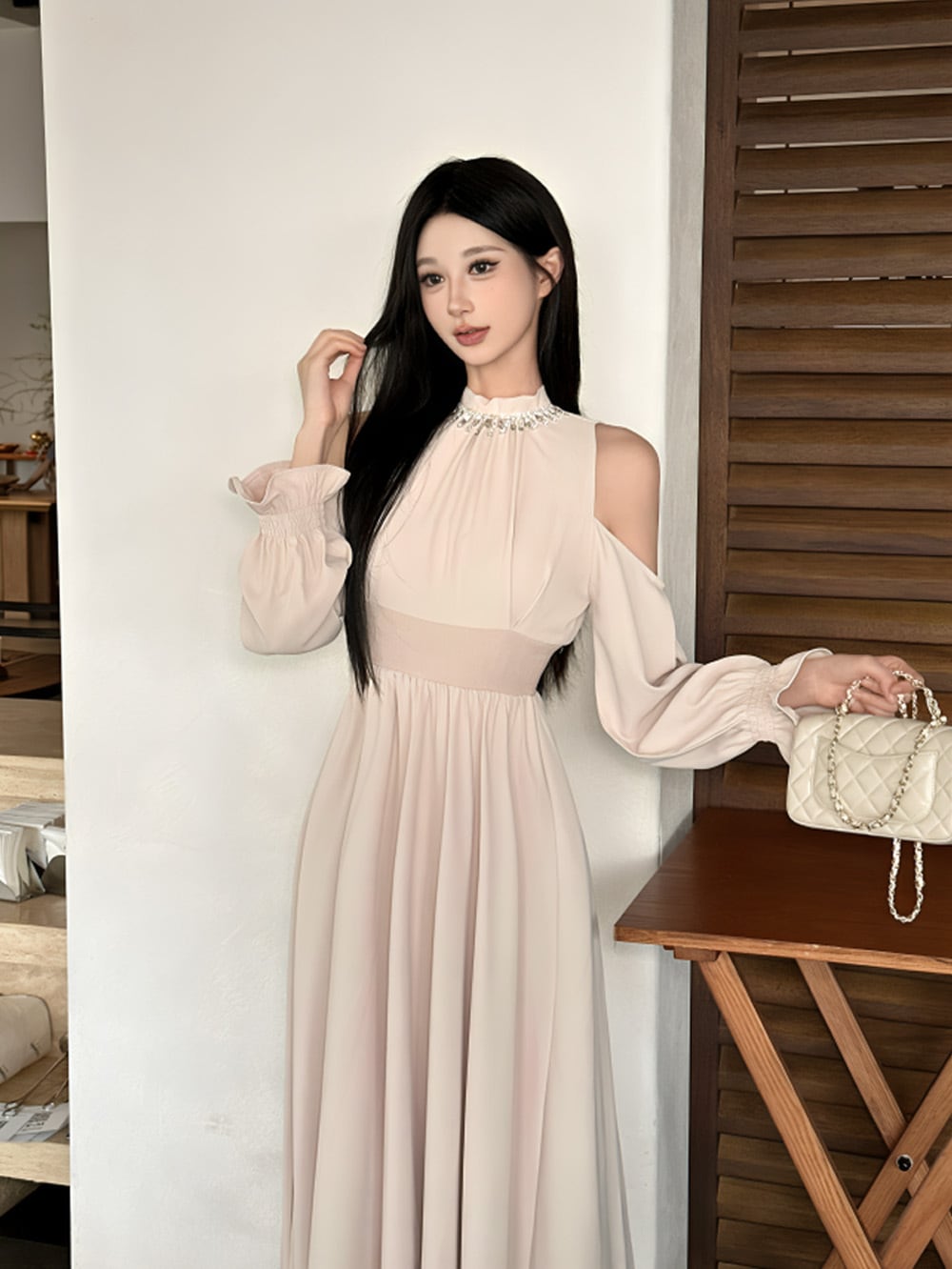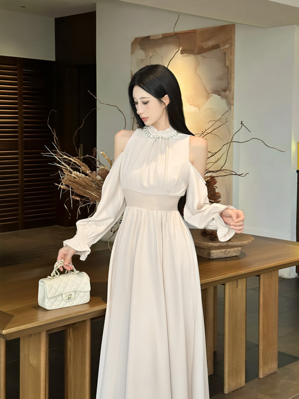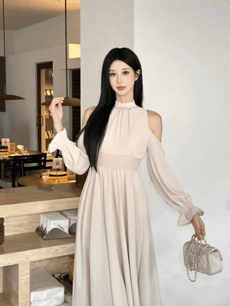 ホルタ―ネックバックリボンベージュピンクオフショルダービジューロングワンピースは、まるで光を纏ったかのように、優雅でロマンチックな魅力を最大限に引き出すアイテム。