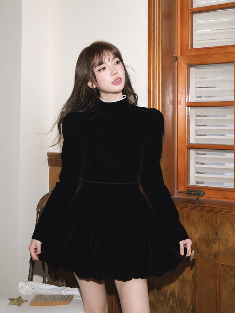 #きれいめ|バルーンシルエットドレッシーホワイトネックラインベロアワンピースは、ハイネック×バルーン、クラシカルで愛らしい最強シルエットがポイントのアイテム。