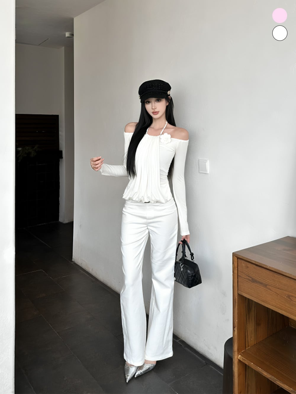 まとうだけで、ふんわり甘く、着るだけで自信が持てる特別な一着の「フラワーブローチドレープオフショルダーキャミソールトップス」をお楽しみください♡