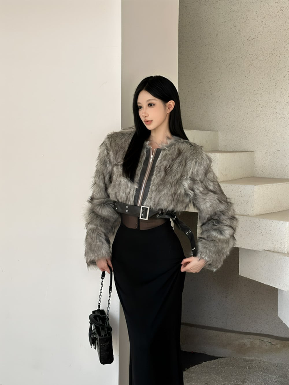 主役となるクロップド丈のファージャケットは、アッシュグレーの毛足が光を捉え、
