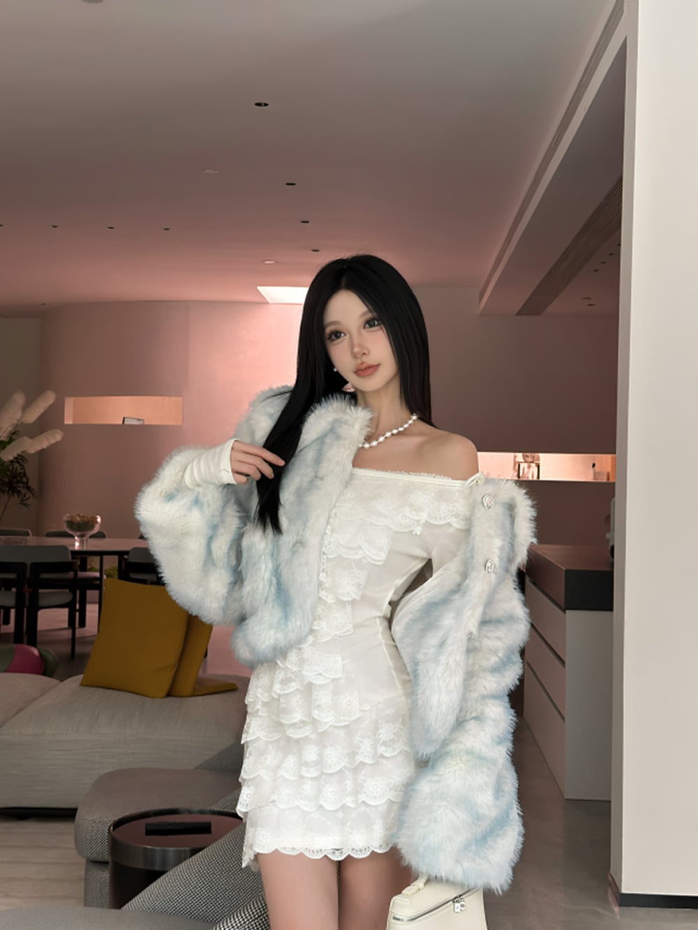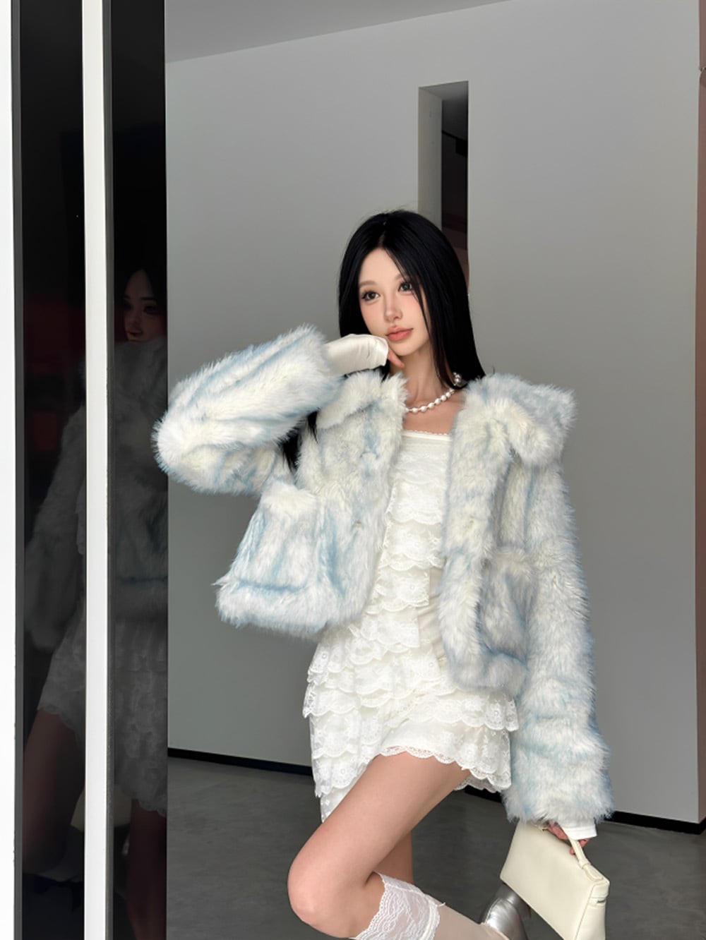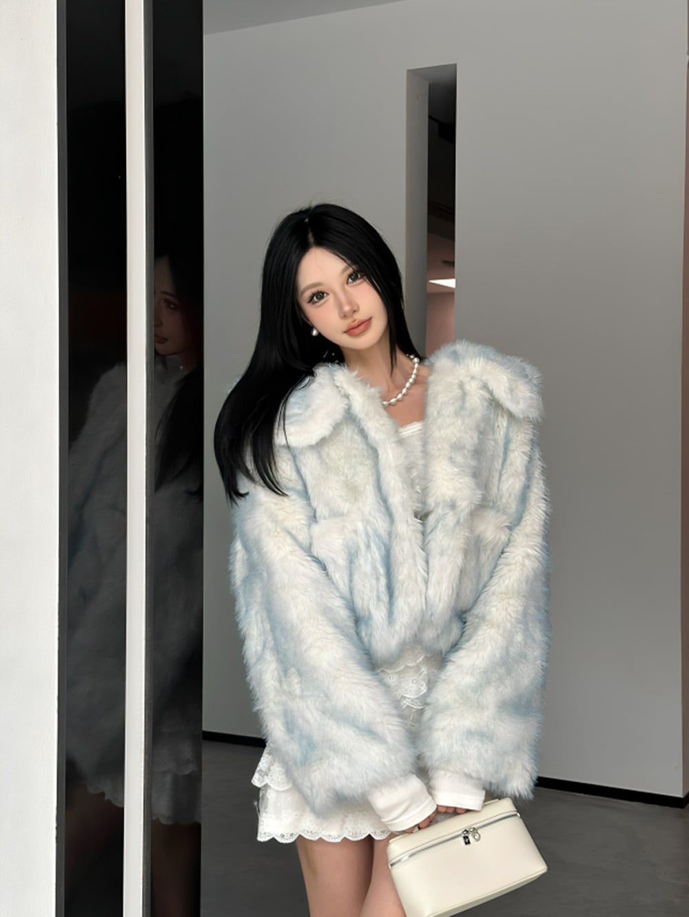 ホワイトを基調に、夢のように淡いブルーのマーブル模様が描かれたファーは、使いやすくも圧倒的な、お洒落な存在感を放ちます。