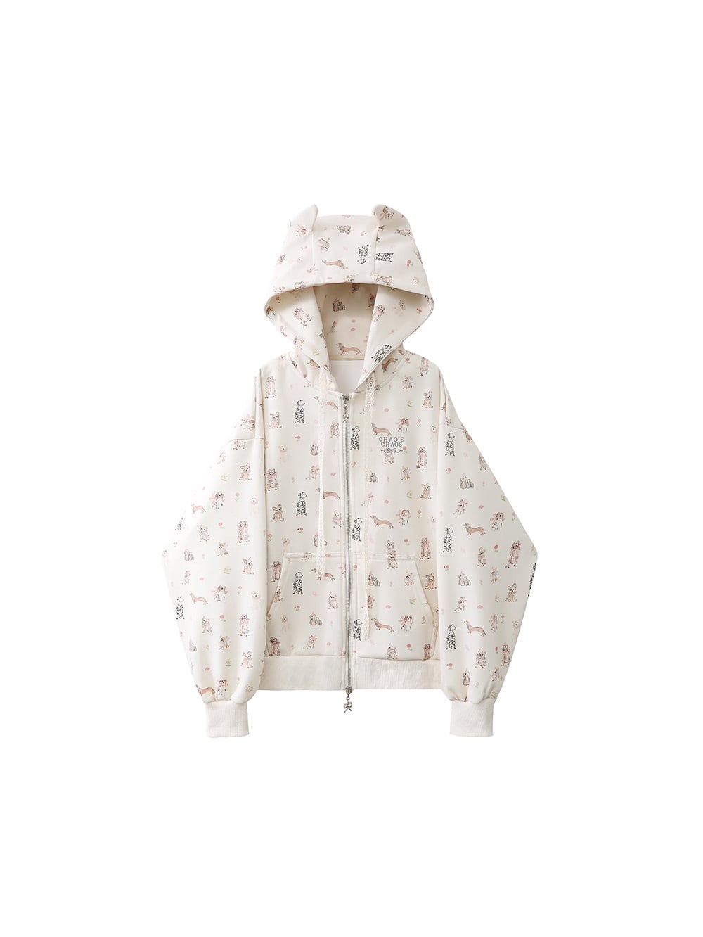 主役のフーディパーカーは、ジップアップで仕上げられ、フードの上部には遊び心あふれる「アニマルイヤー(犬の耳)」のディテールが。