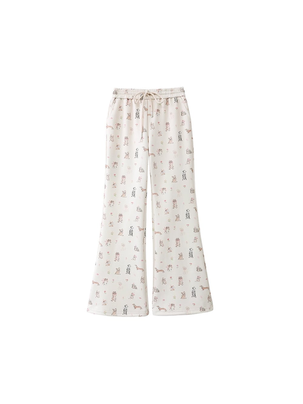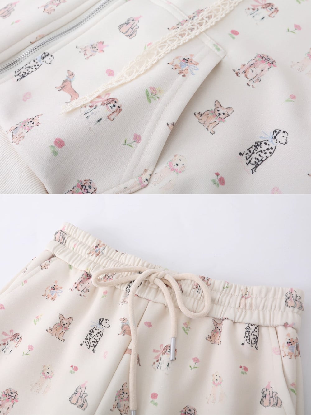 柔らかなアイボリーの生地に、ダックスフンドやダルメシアンなどの愛らしいドッグプリントが全体に施され、心がウキウキするようなハッピーなムードを演出。