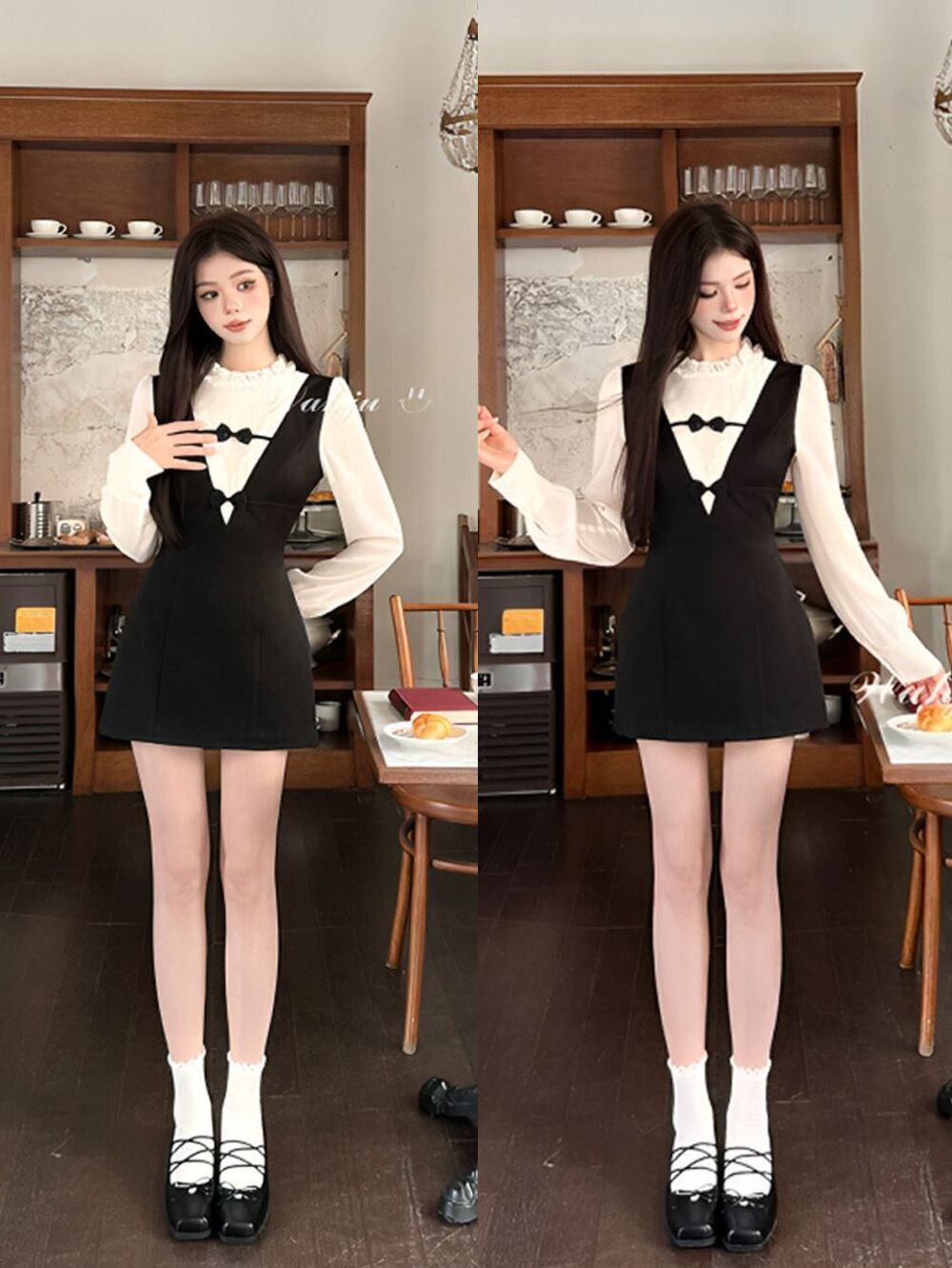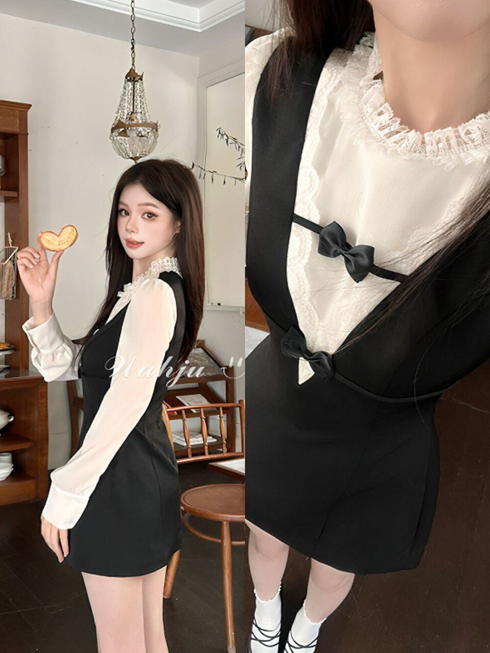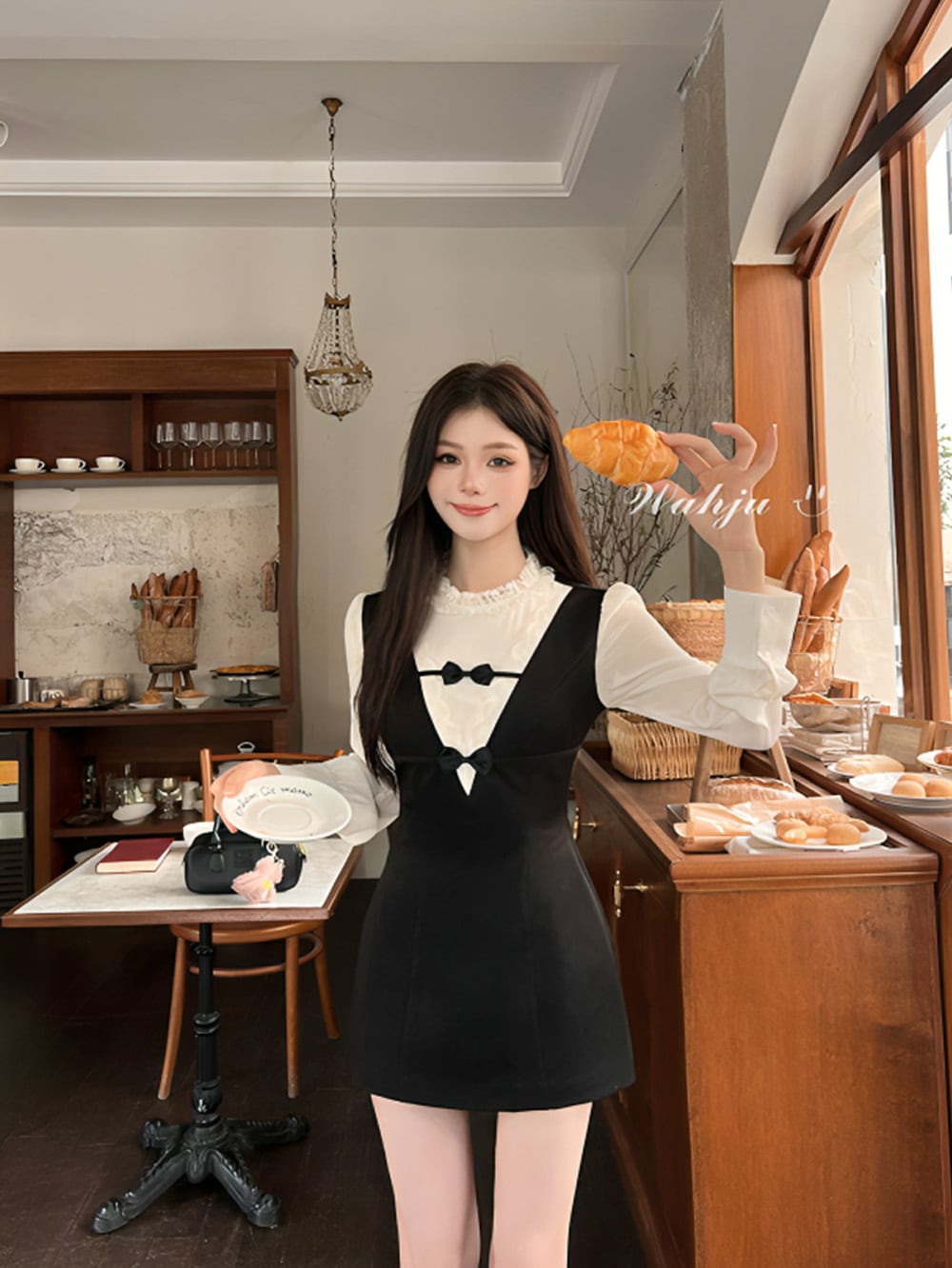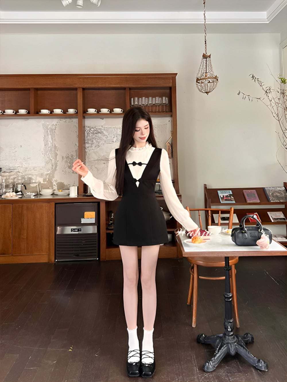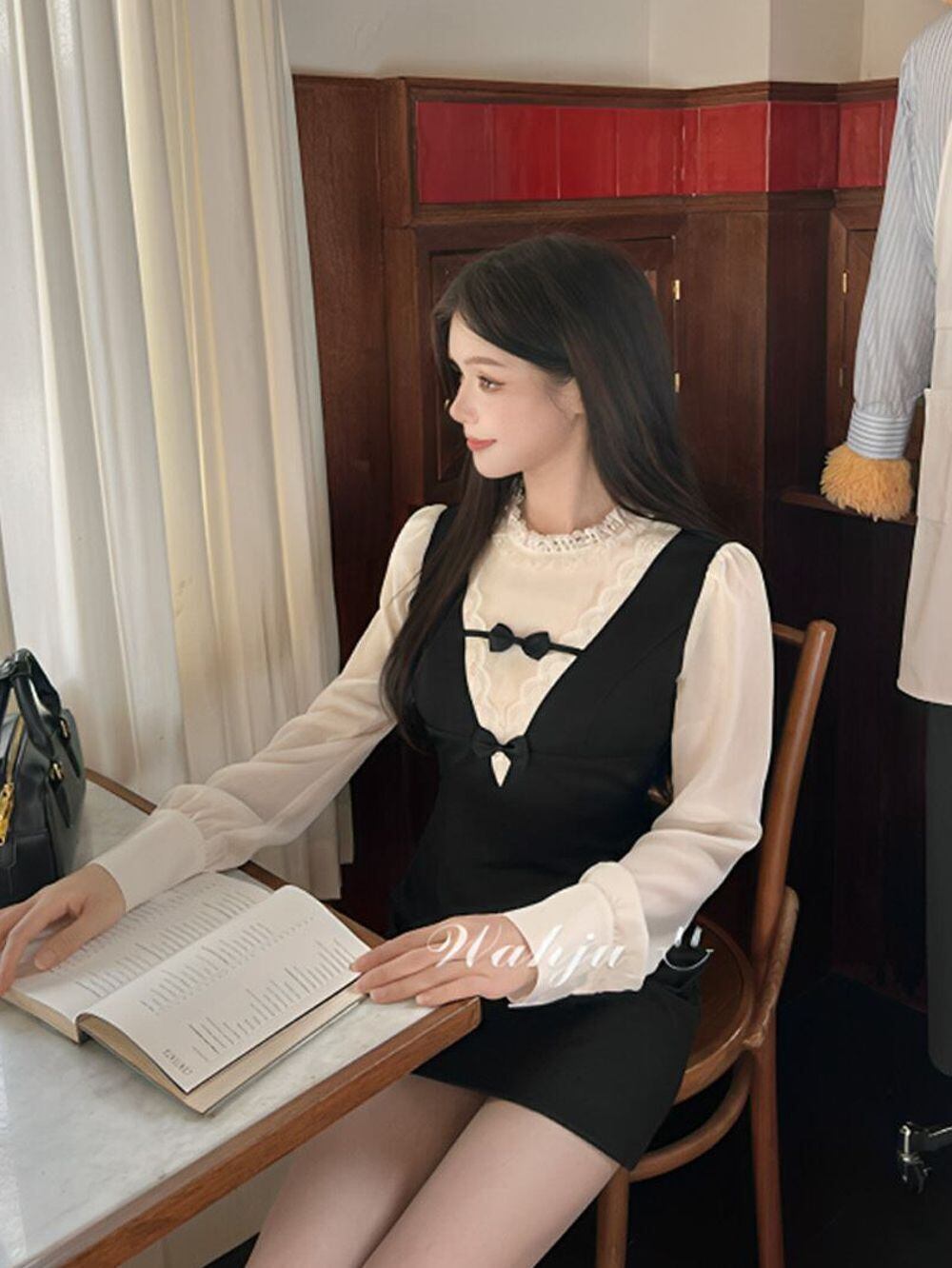 胸元のブラックリボンが、甘さの中にモードな雰囲気をプラス。