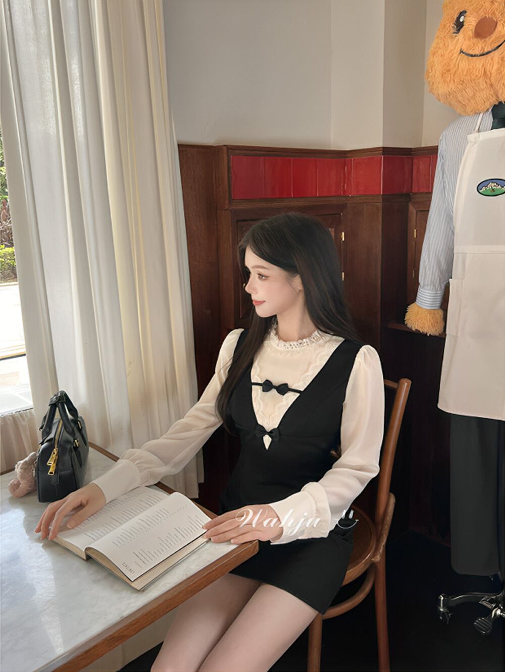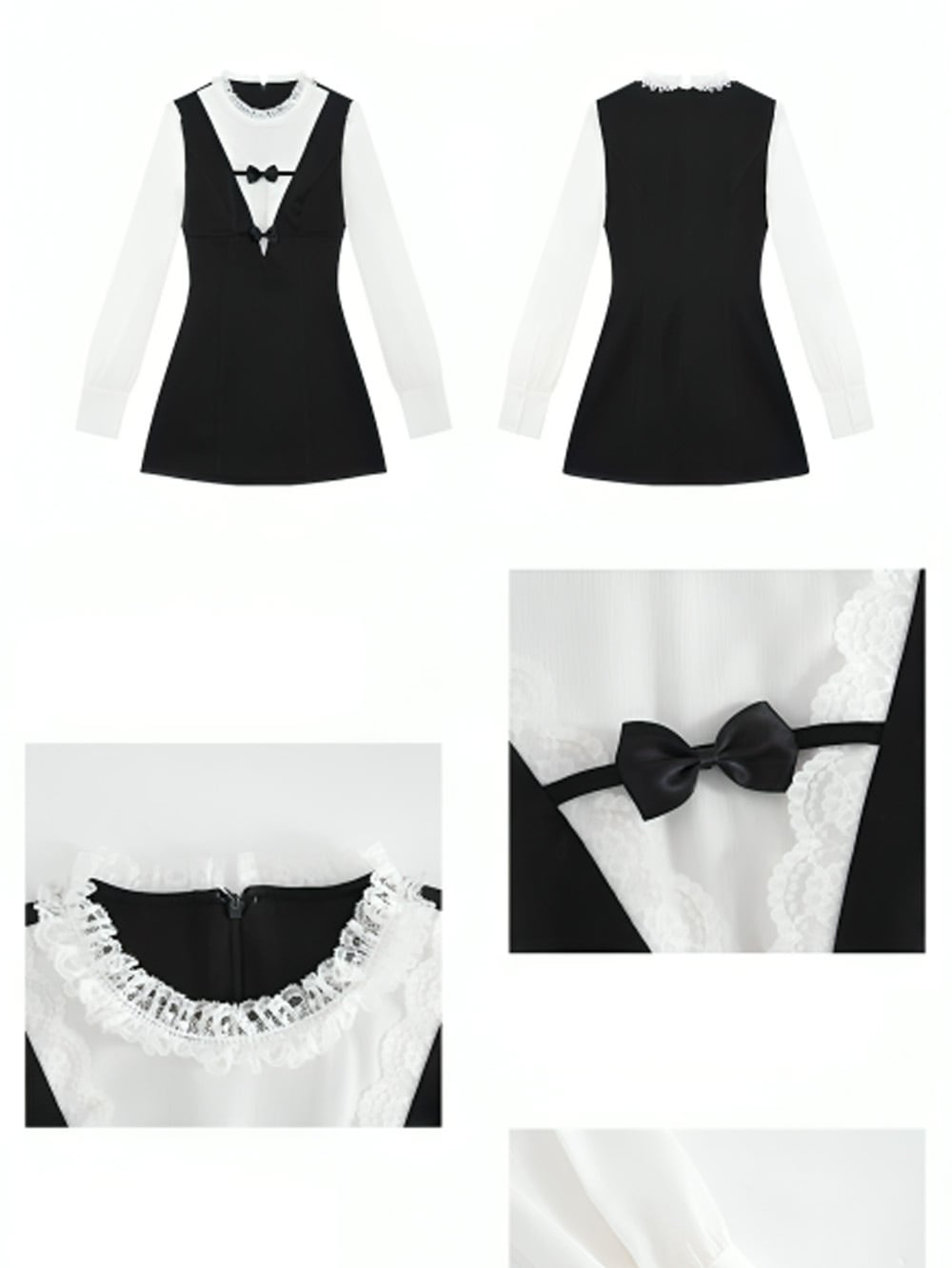 繊細なレース襟が描く優美なネックライン、計算されたフロントリボンのアクセント、