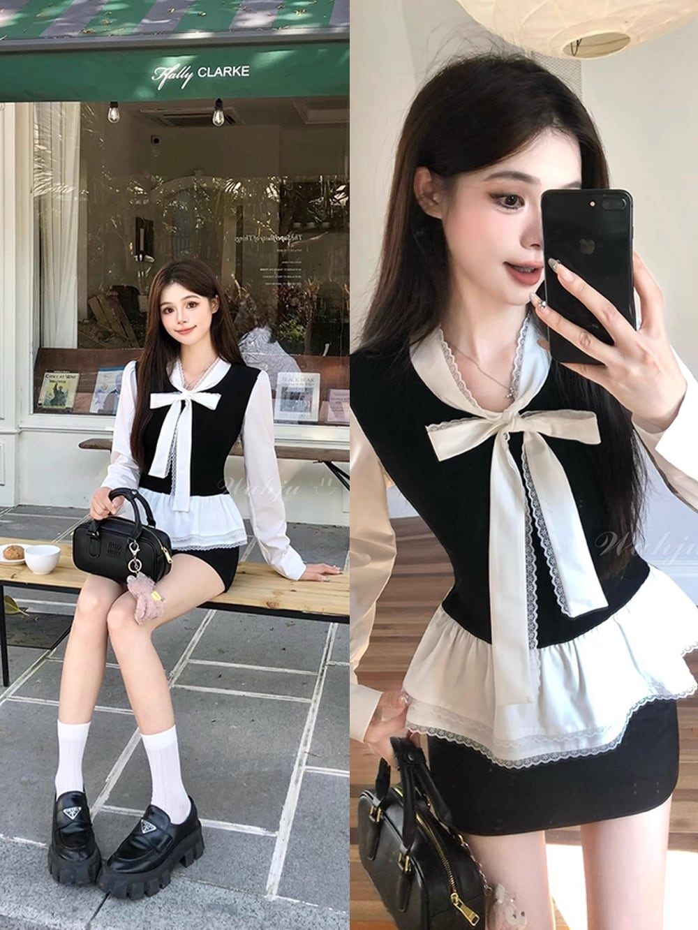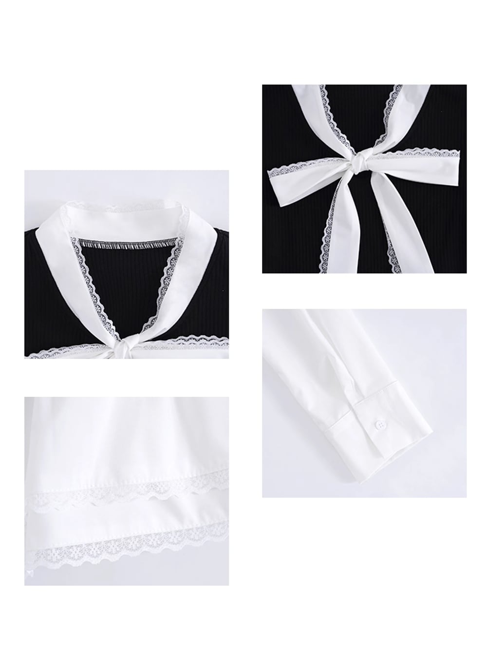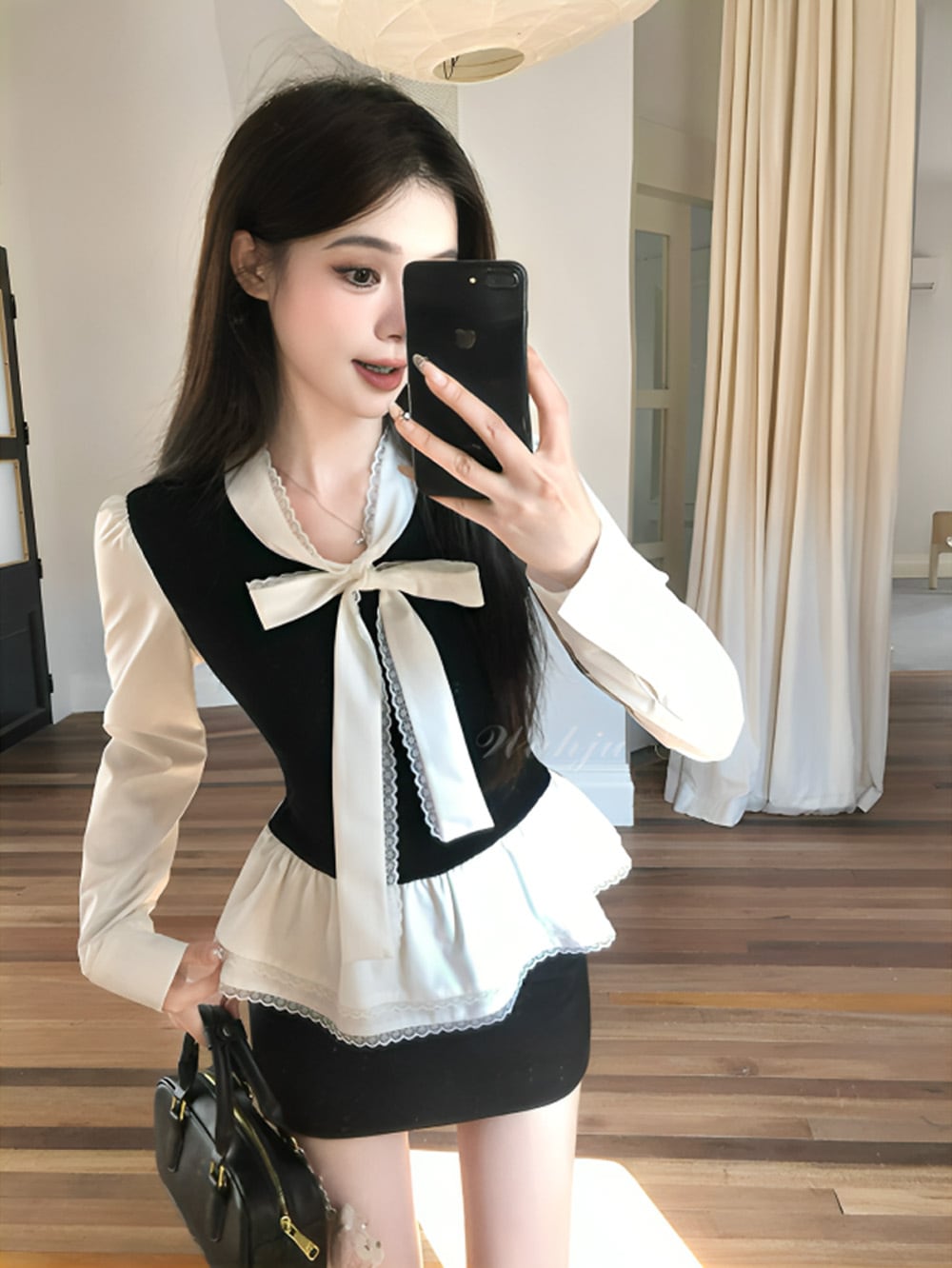 白と黒という対照的な色彩が生み出す、クラシカルでありながらモダンな佇まいの「ボウタイペプラムバイカラーロングスリーブトップス」をお楽しみください♡
