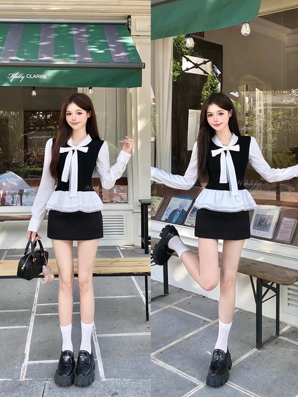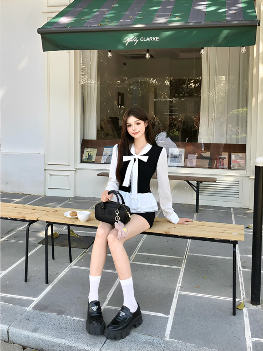シックなブラックのベストに、ピュアホワイトのブラウスを重ねたような、