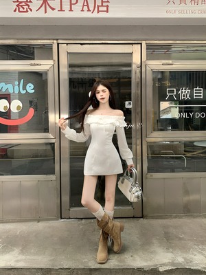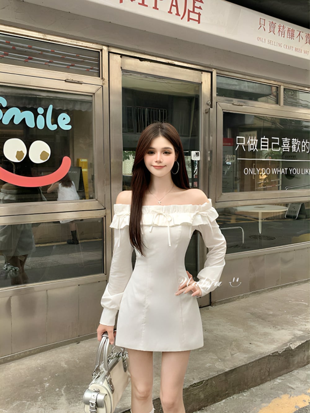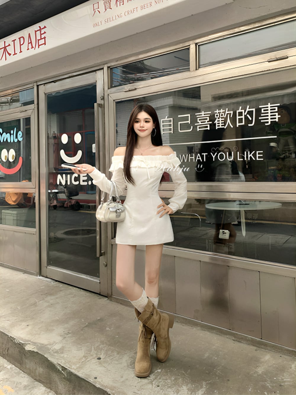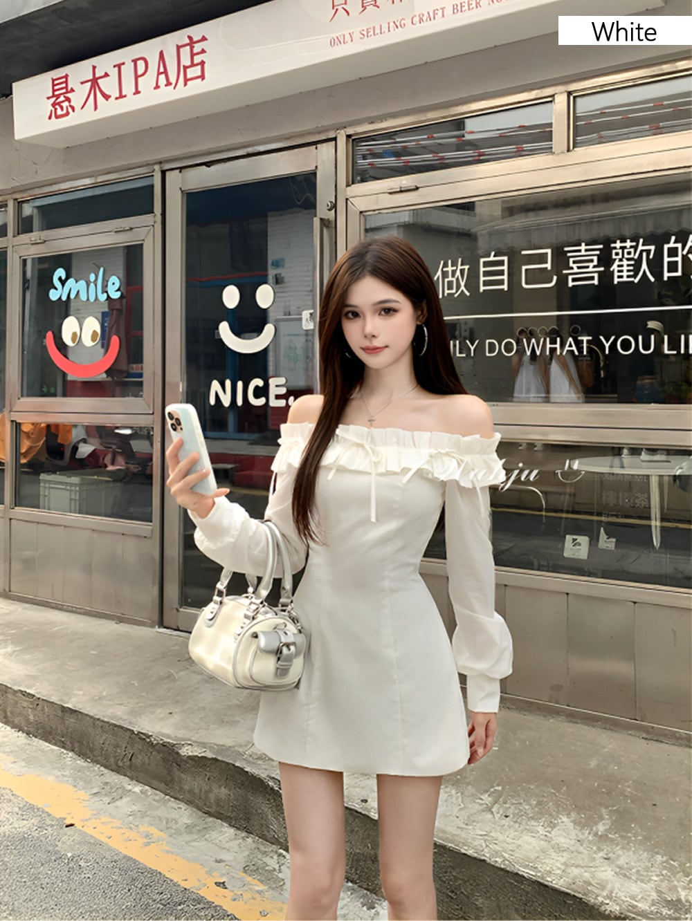 デコルテを美しく見せるオフショルダースタイルは、フェミニンで華やかな印象を演出。
