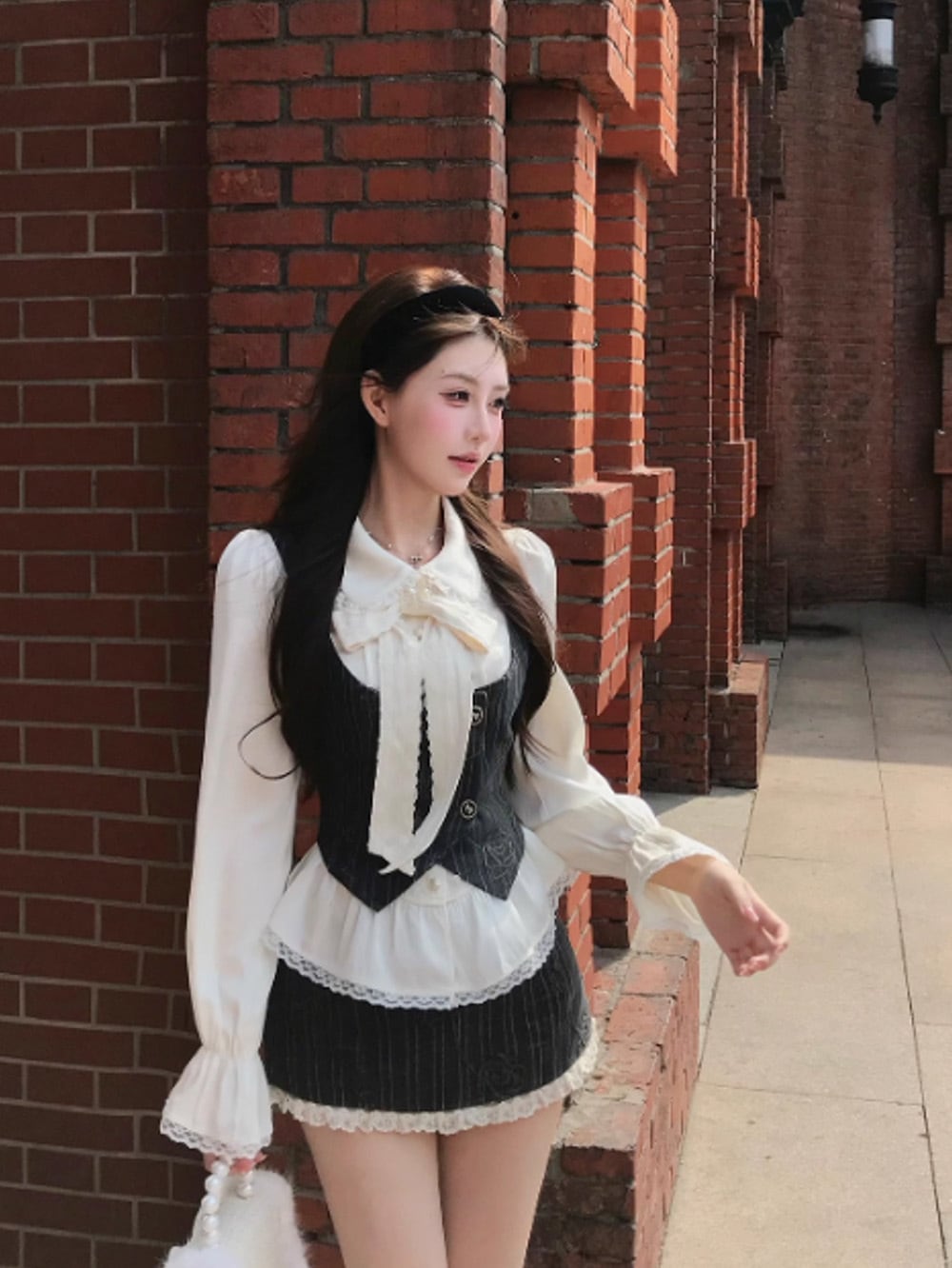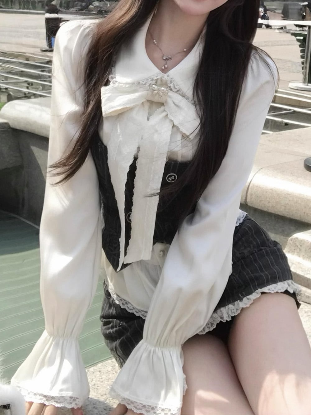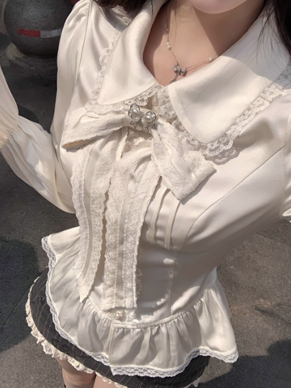 ベースとなるピンタックトップス(フリルブラウス)は、純白のシルクタッチな素材に繊細なフリルとロングスリーブがあしらわれ、優雅さを強調。