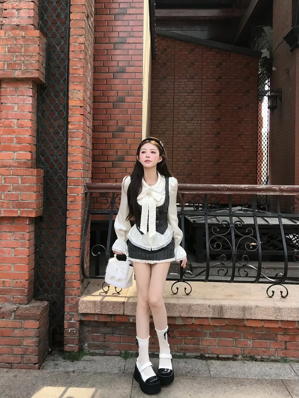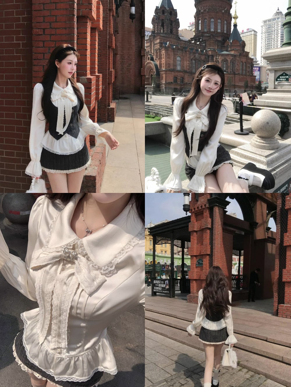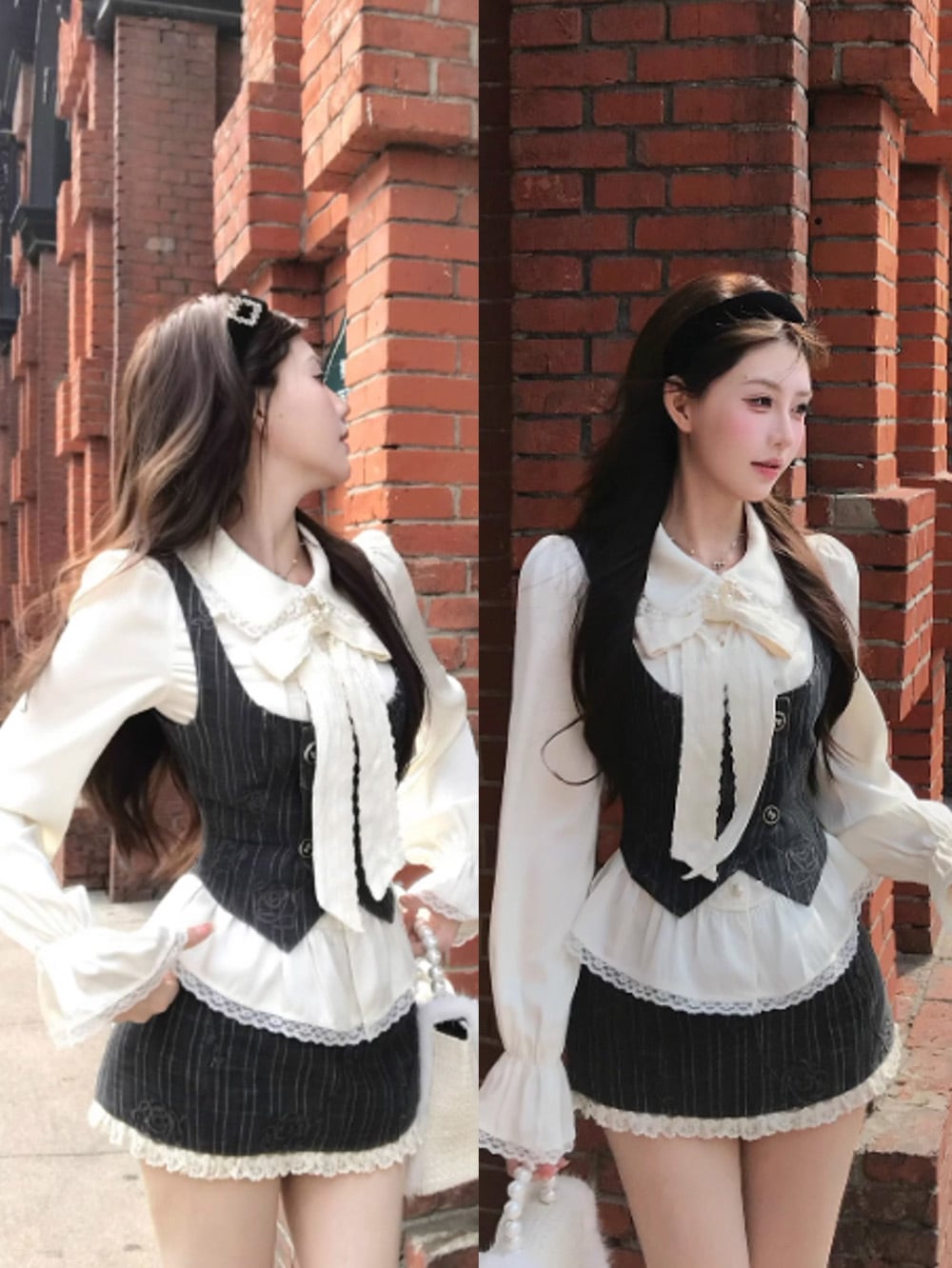 ベースとなるピンタックトップス(フリルブラウス)は、純白のシルクタッチな素材に繊細なフリルとロングスリーブがあしらわれ、優雅さを強調。
