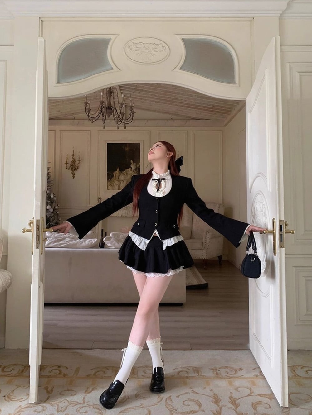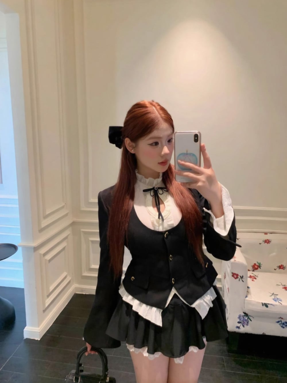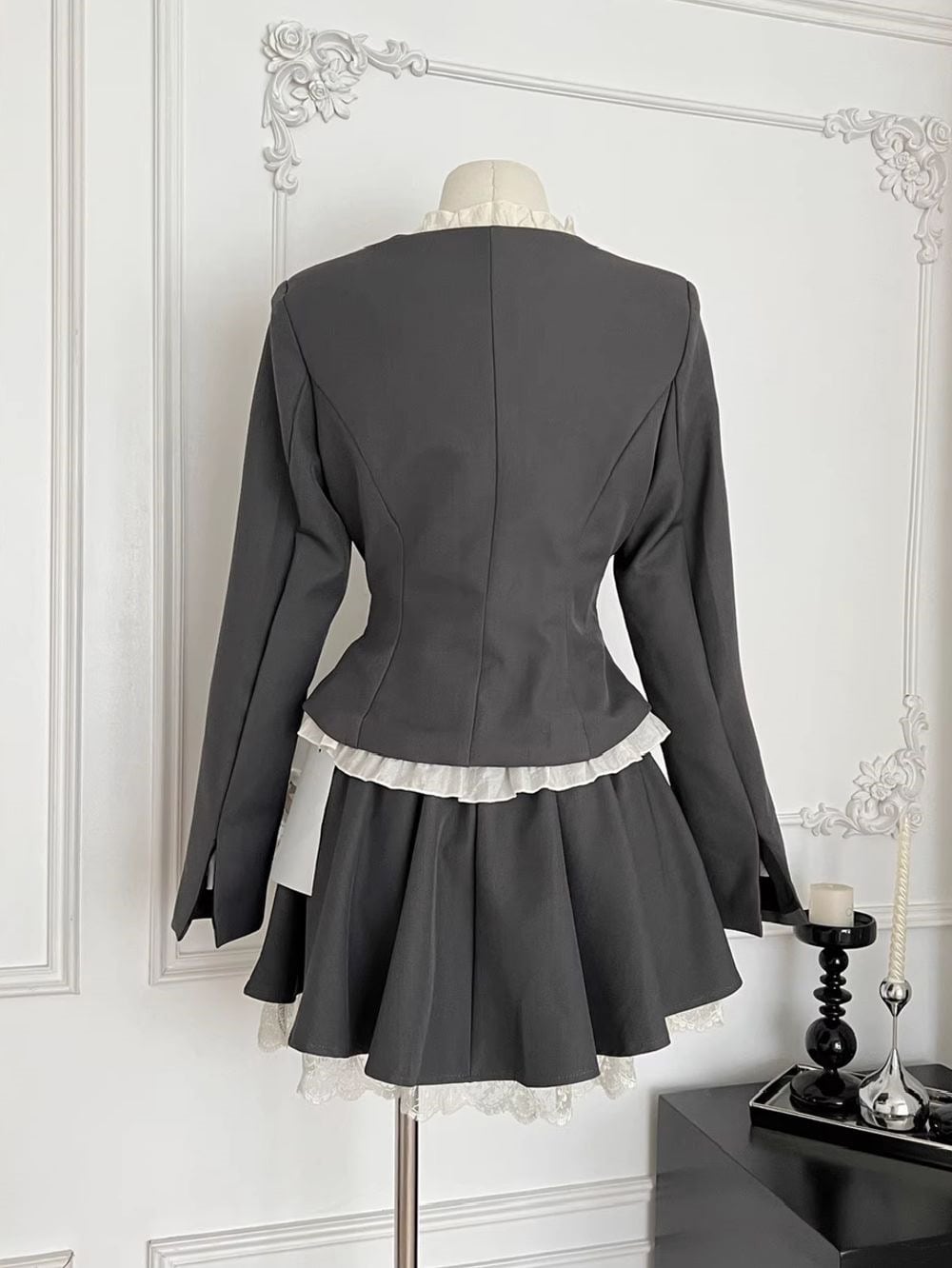 ピュアホワイトのピンタックブラウス、シックなブラック&グレーのテーラードジャケット、そして裾にシャーリングフリルをあしらったフレアスカート。