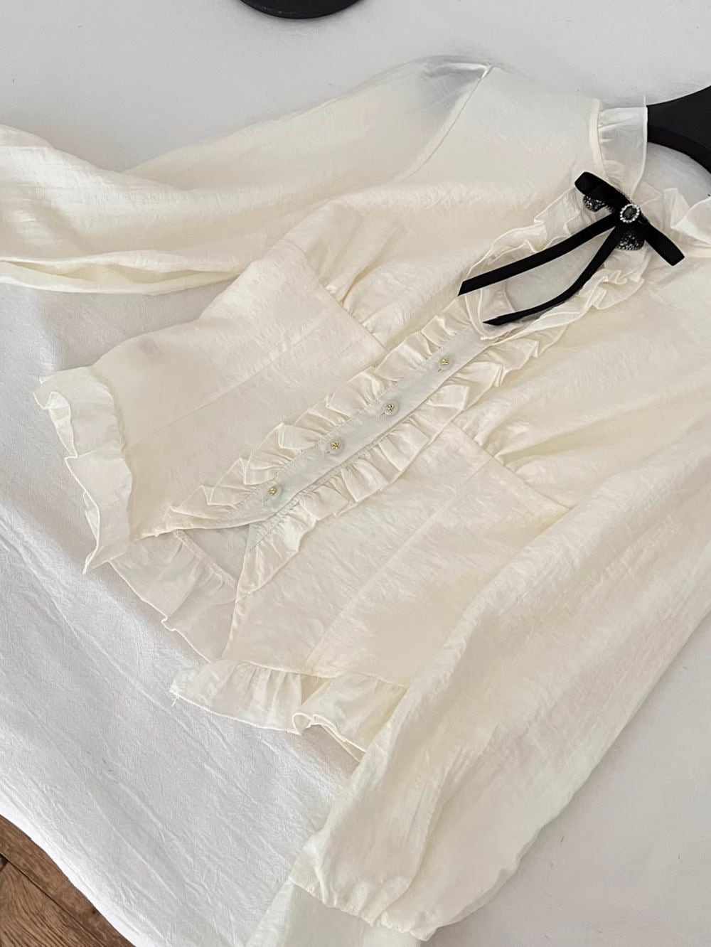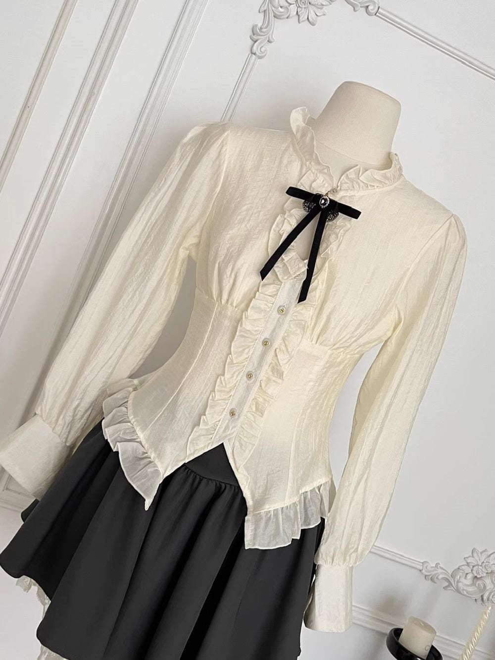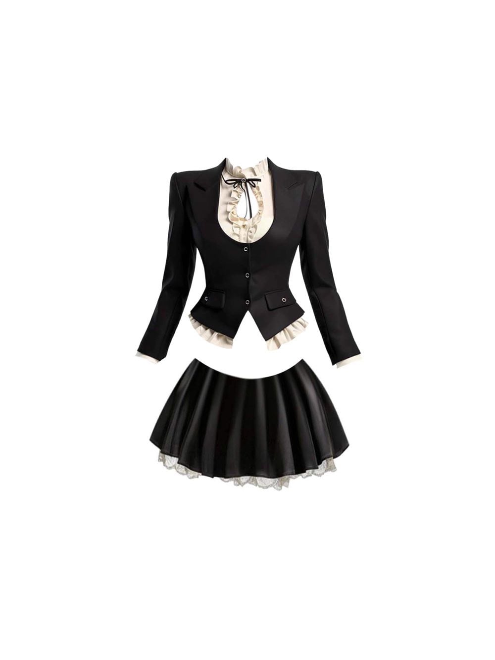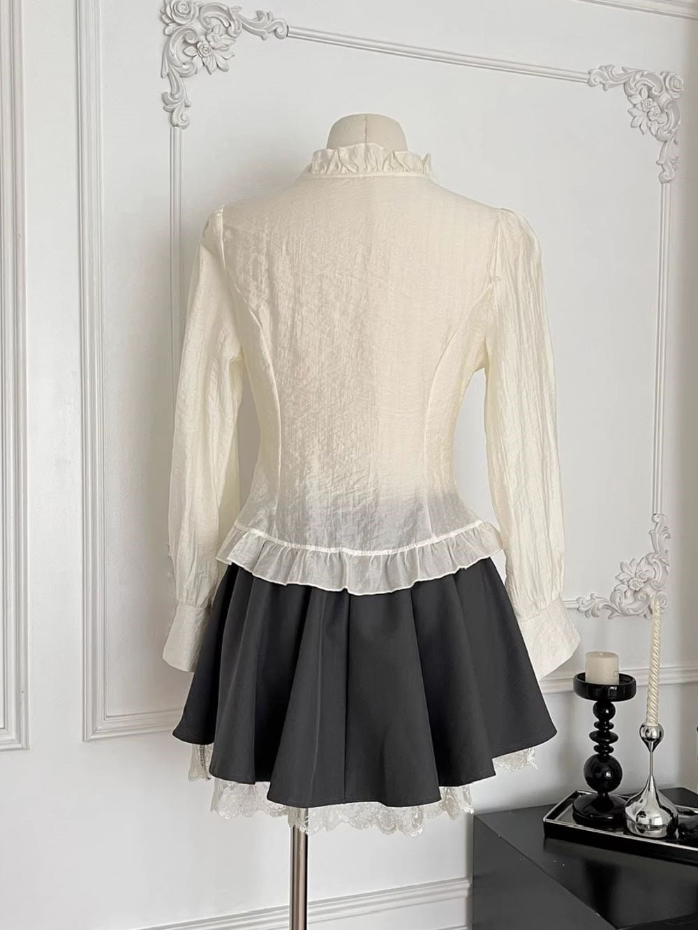 ピュアホワイトのピンタックブラウス、シックなブラック&グレーのテーラードジャケット、そして裾にシャーリングフリルをあしらったフレアスカート。