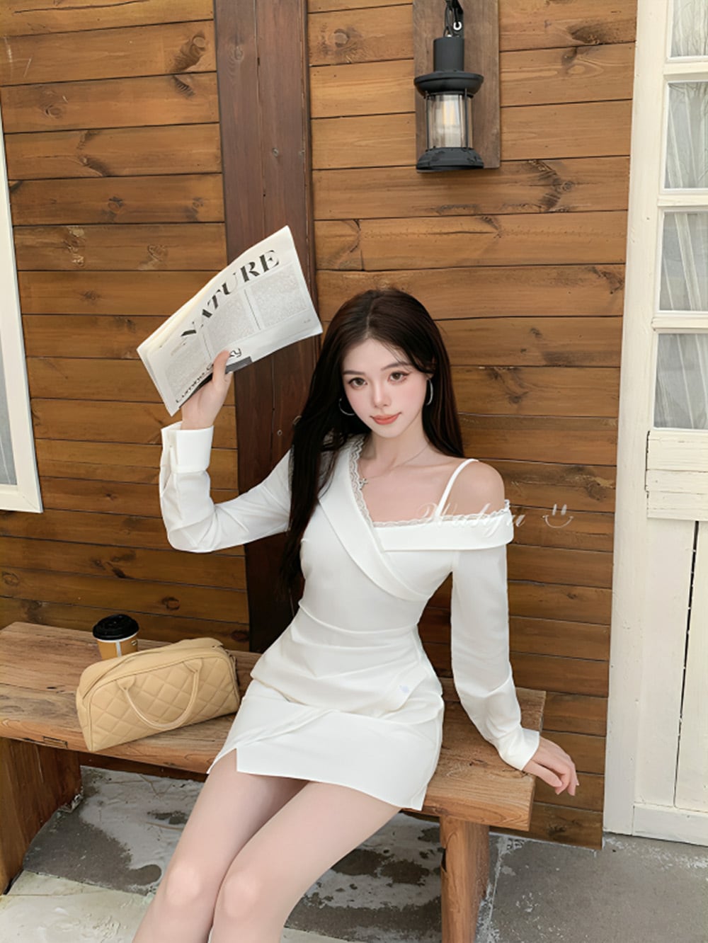 片方の肩を大胆に露出させたワンショルダーデザインが、