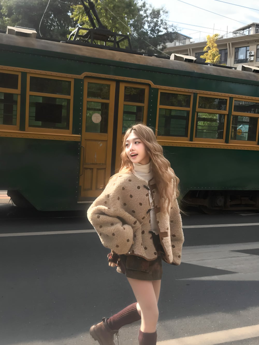 休日のカフェタイム、心躍る旅先、そしてカジュアルなデートにもぴったりな「リバーシブルブラウンドットボアフリースジャケット」をお楽しみください♡