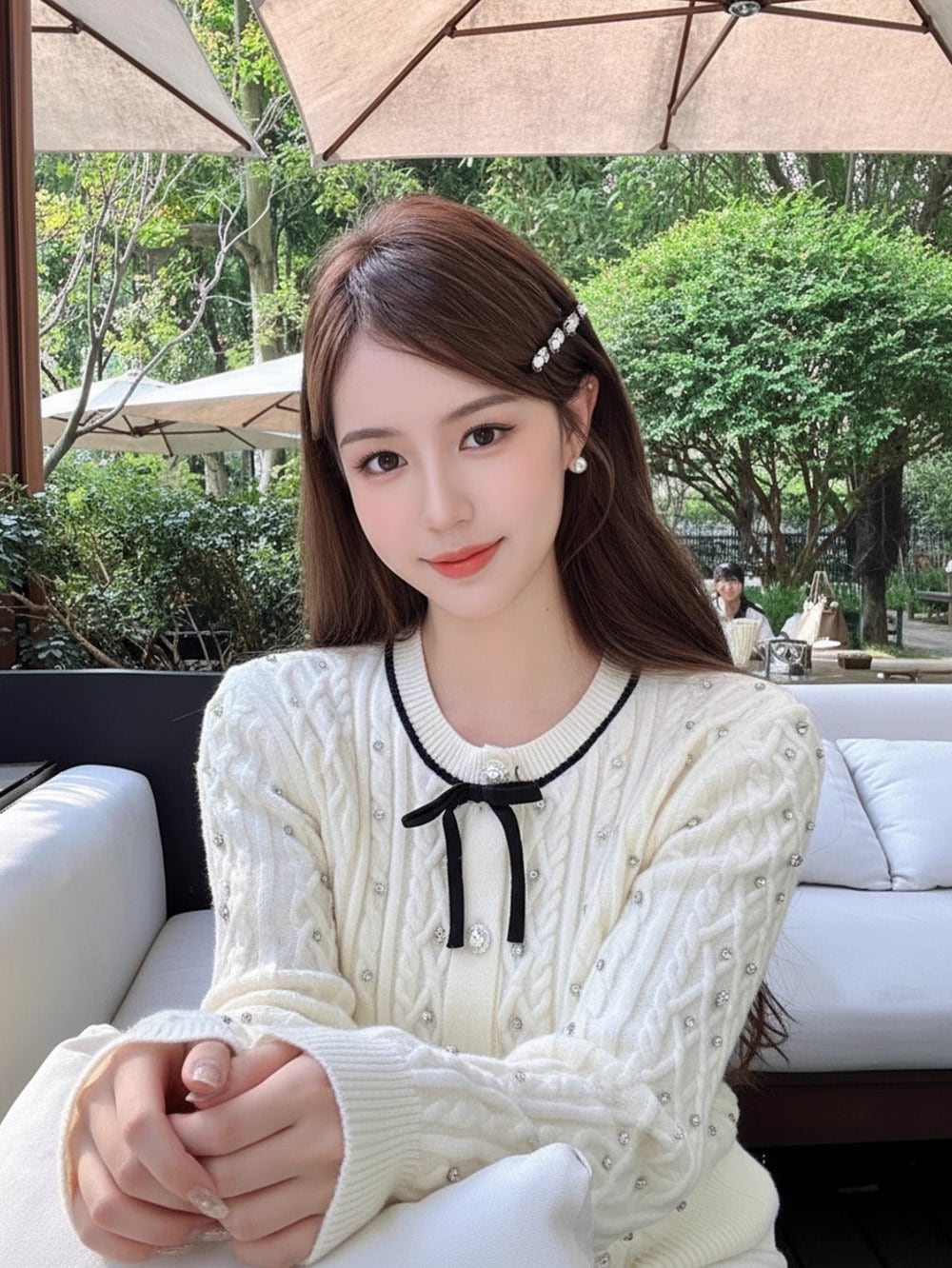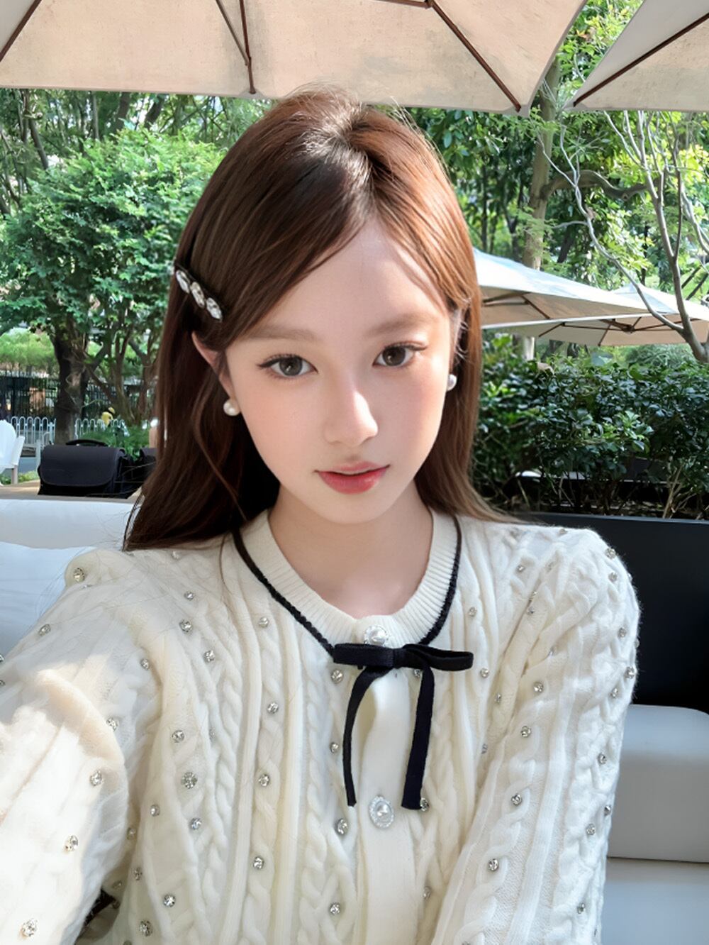 アイボリーの柔らかな色合いに、立体的なケーブル編みが描く美しいテクスチャー。胸元を飾るブラックリボンには、繊細なビジューをあしらい、さりげない華やかさをプラス。
