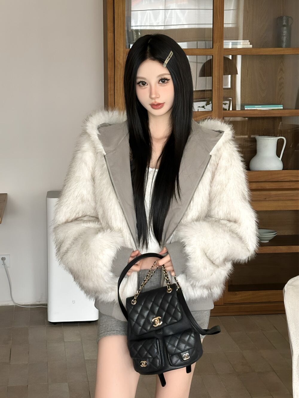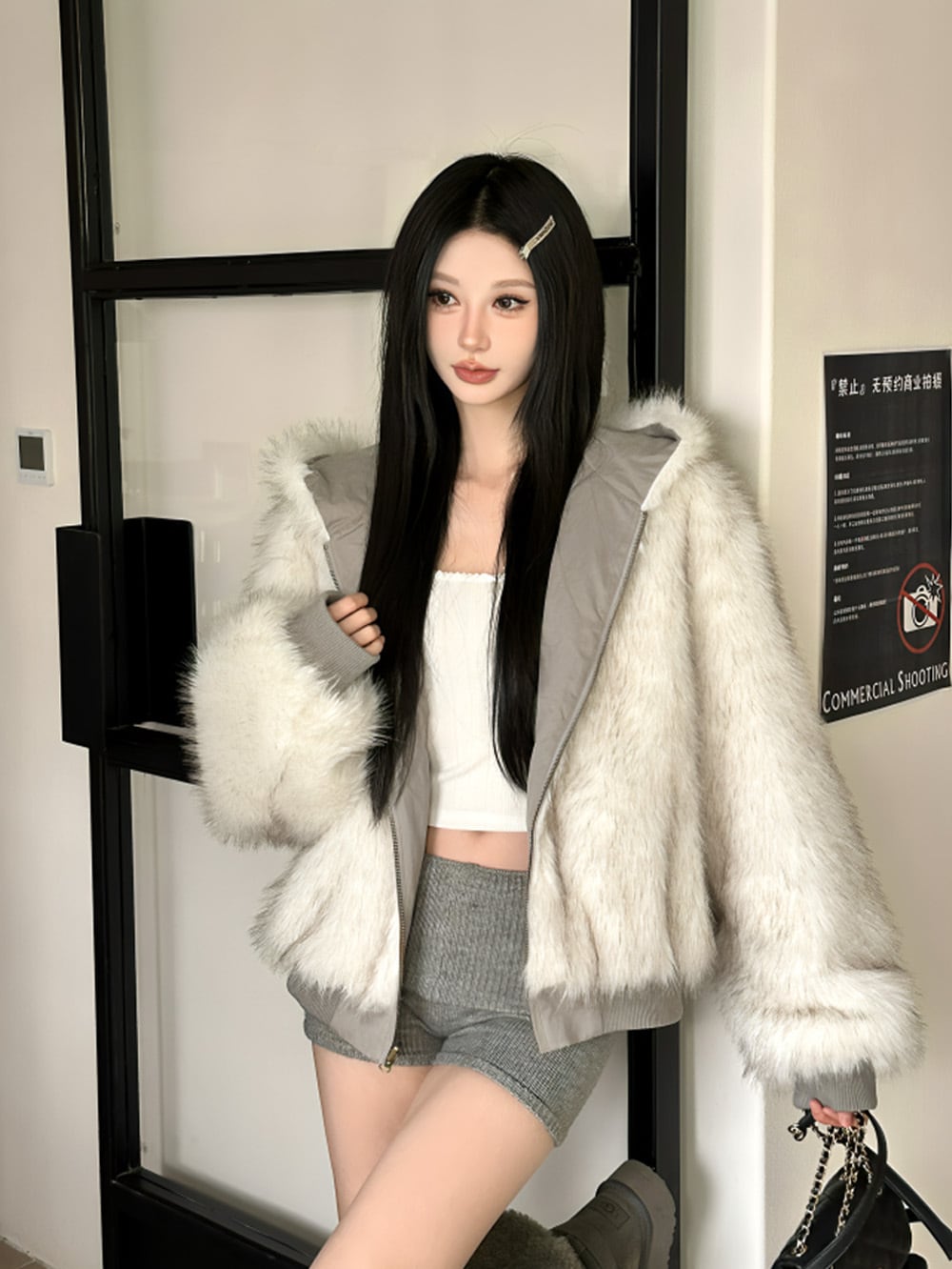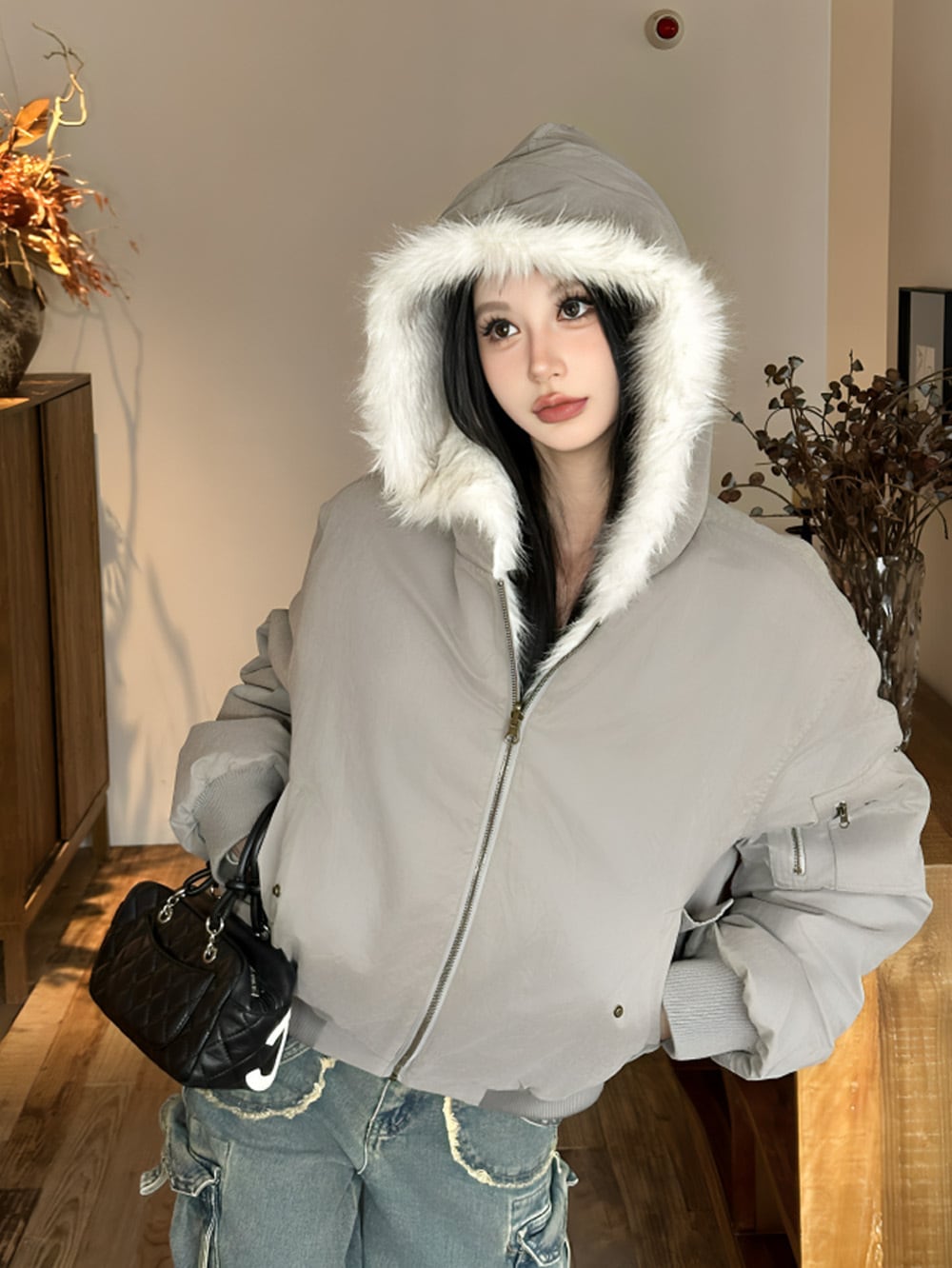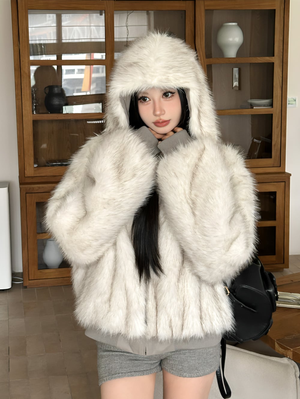 ふんわりとしたボリューム感のあるエコファーが纏う、柔らかな質感と上質な輝き。ホワイトグレーのカラーが、冬の街を優雅に彩り、まるで雪のような清楚な美しさを演出。