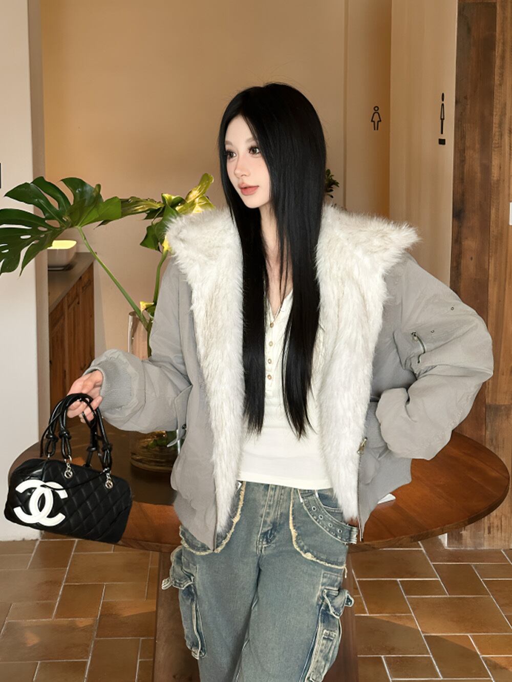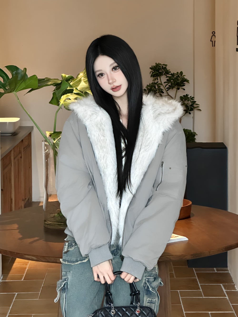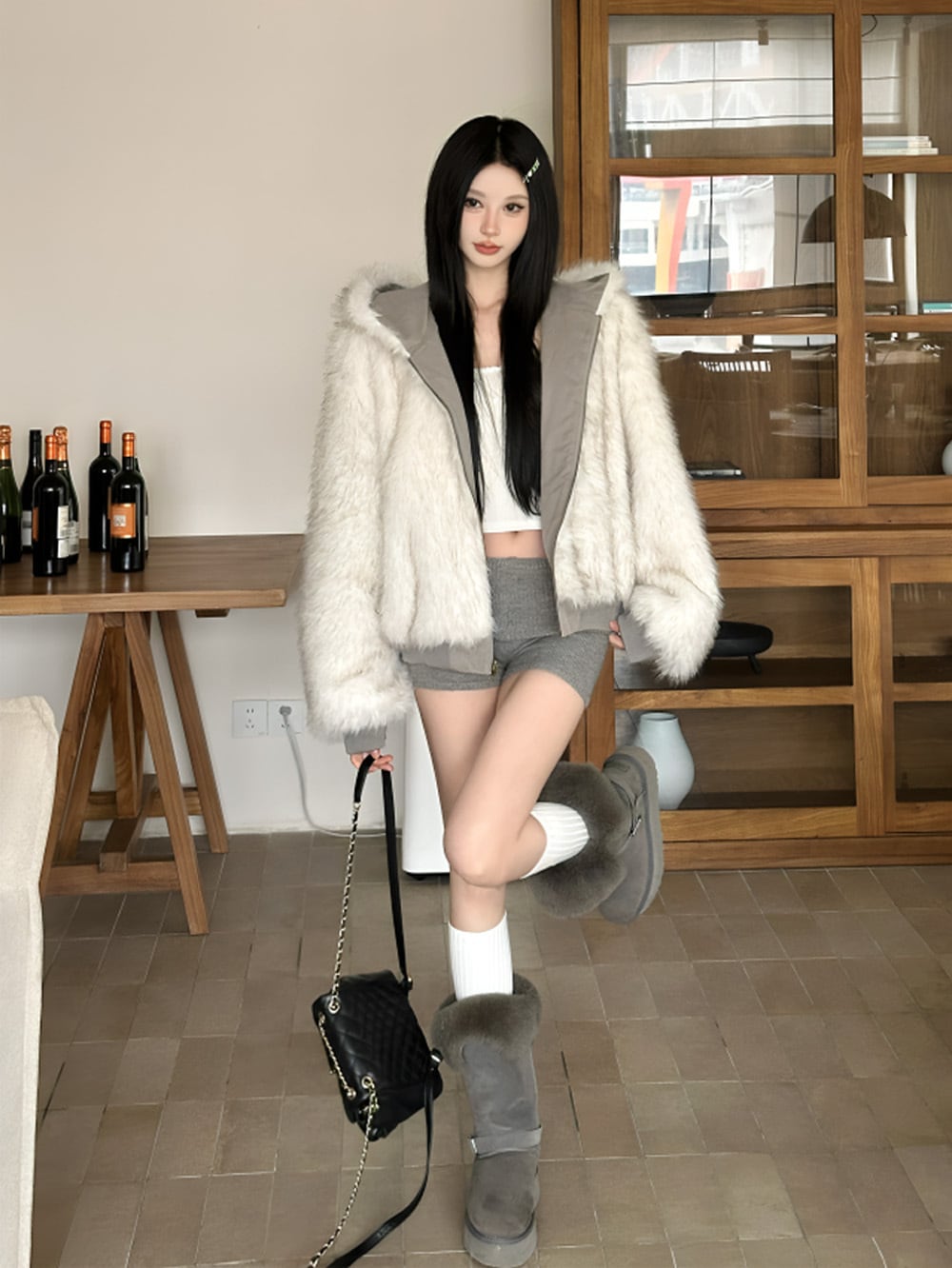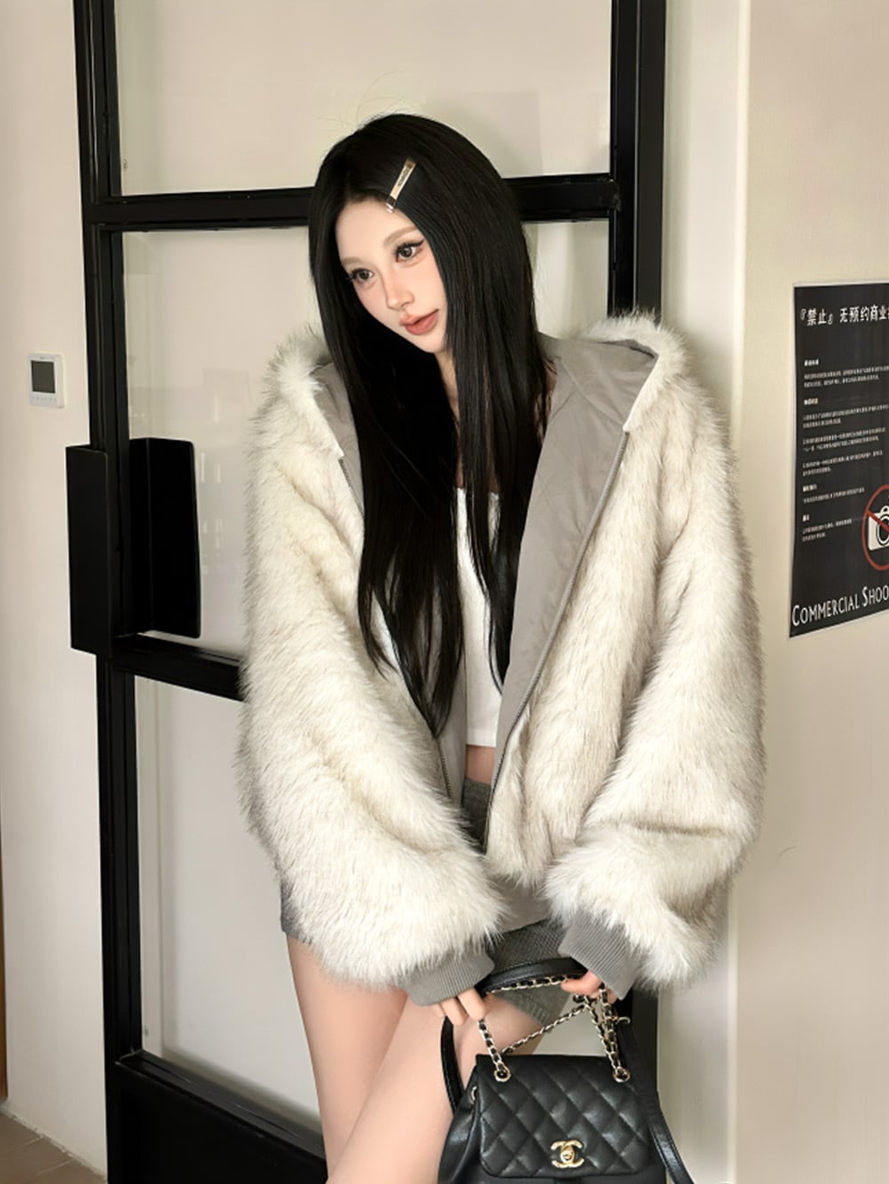 ふんわりとしたボリューム感のあるエコファーが纏う、柔らかな質感と上質な輝き。ホワイトグレーのカラーが、冬の街を優雅に彩り、まるで雪のような清楚な美しさを演出。