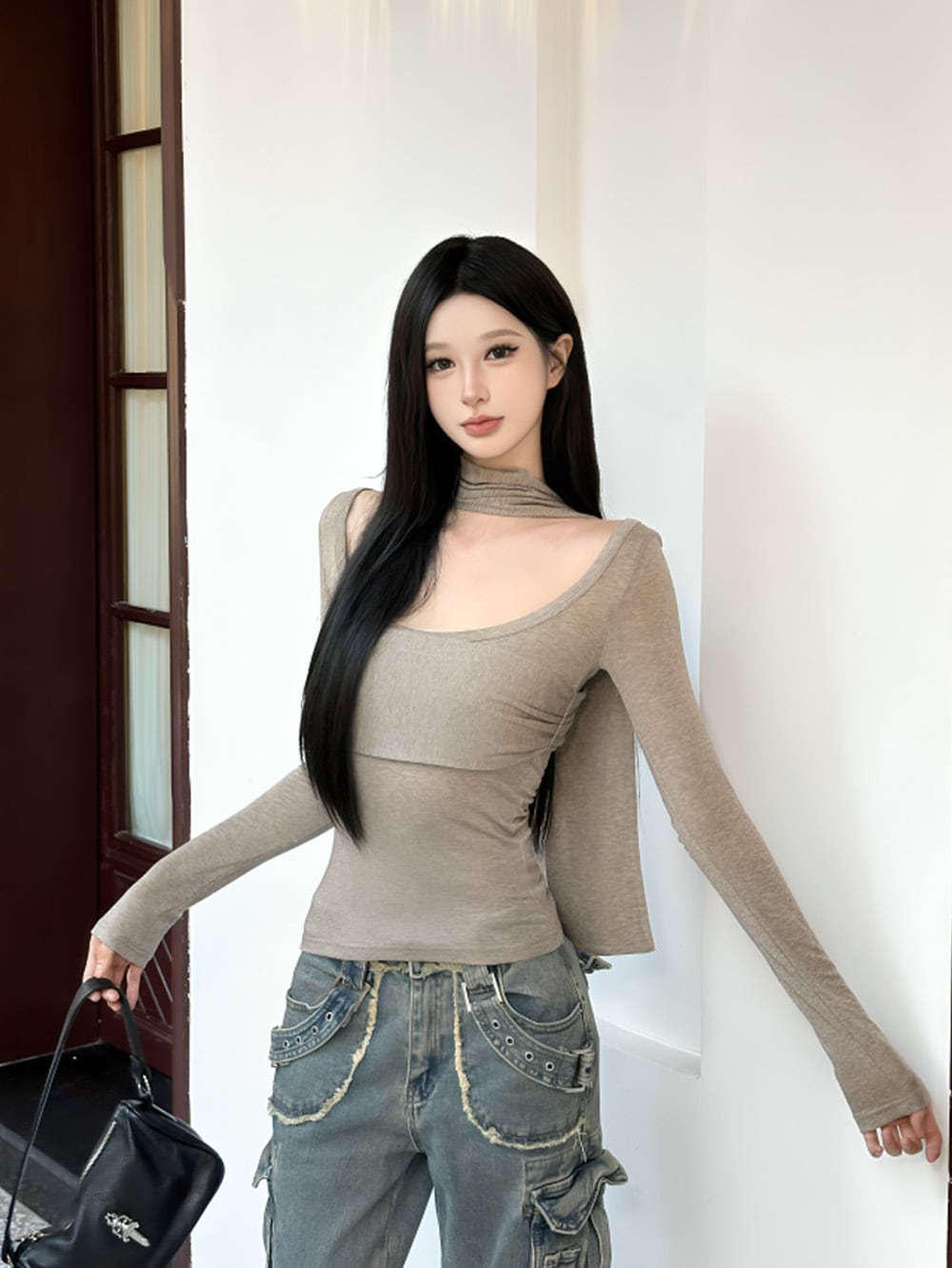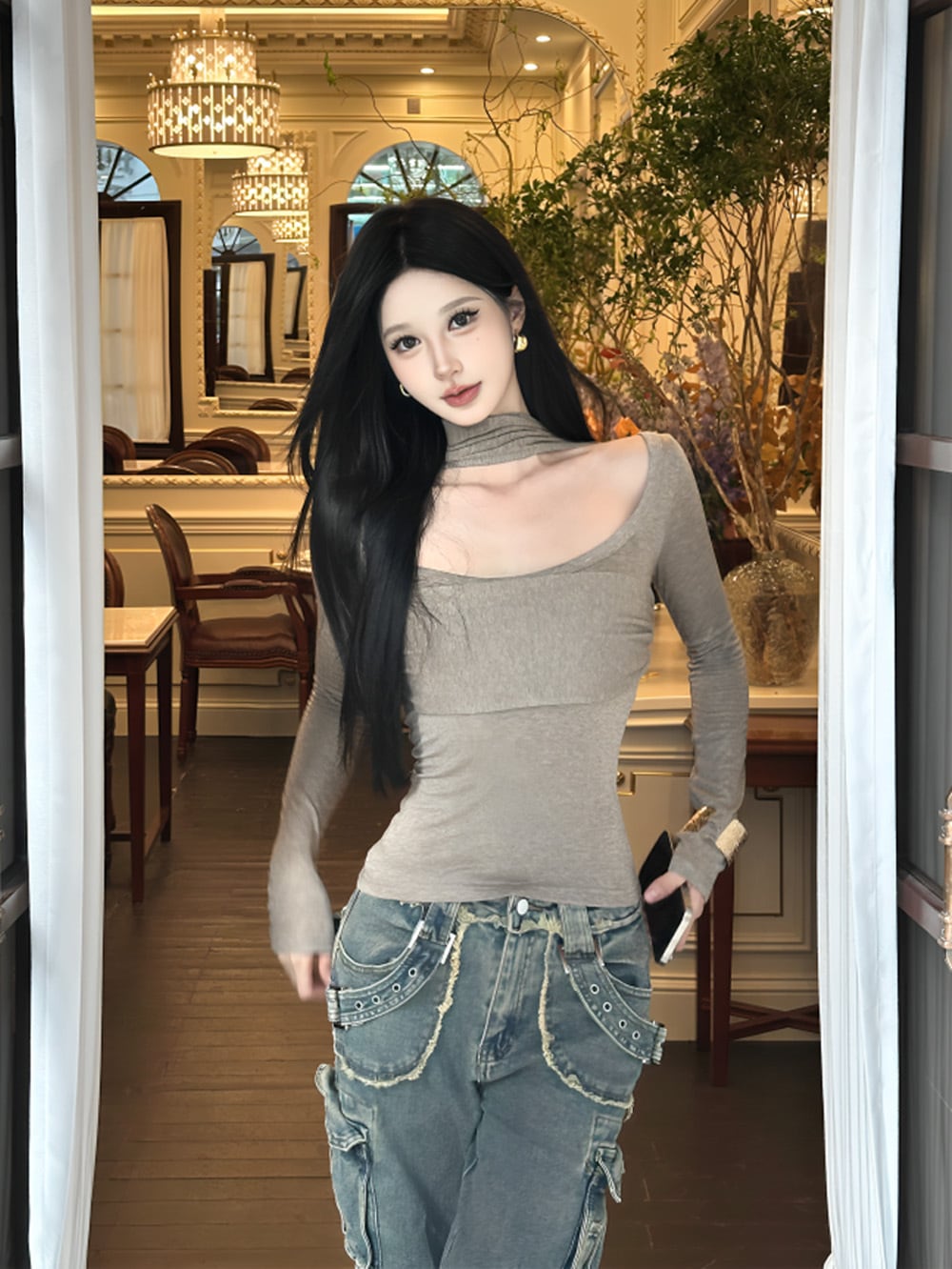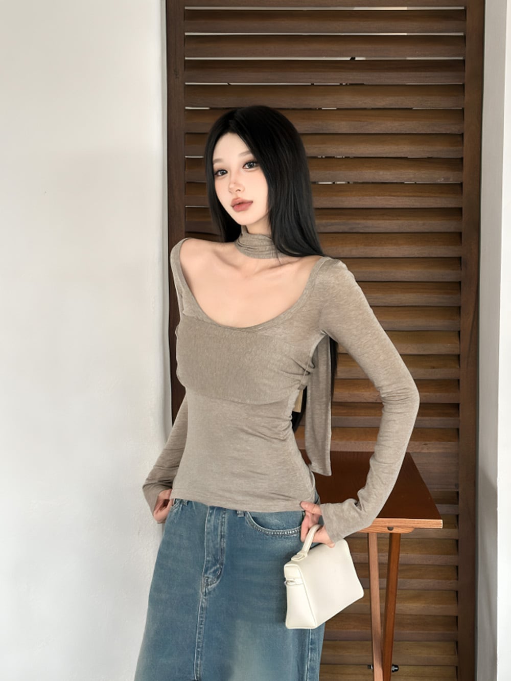 最大の魅力は、ラウンドカットのデコルテラインと、そこから立ち上がるホルターネック風の「ロングネックコード」。