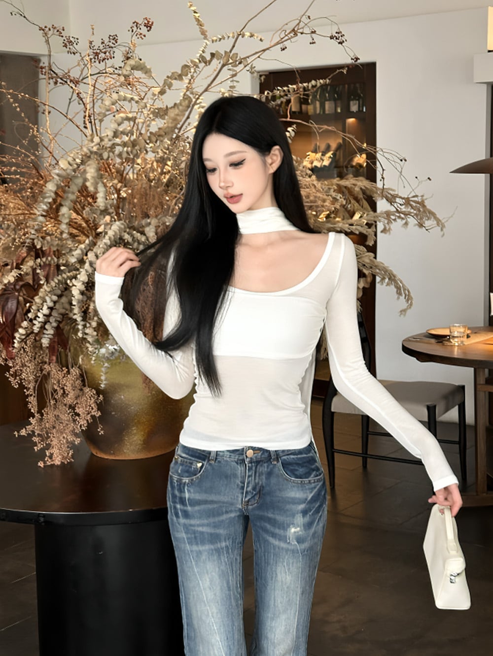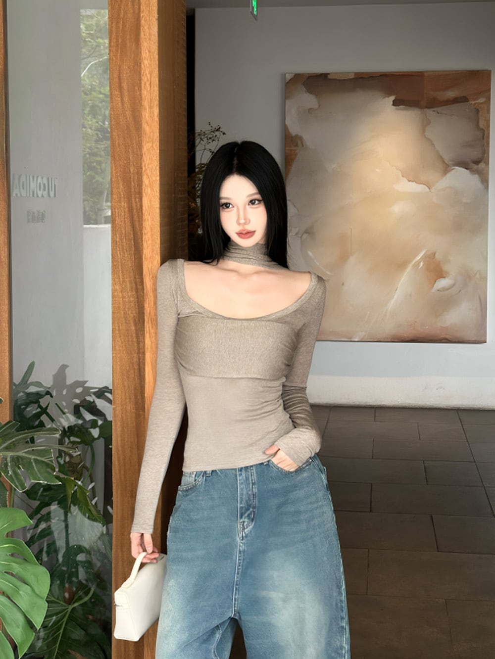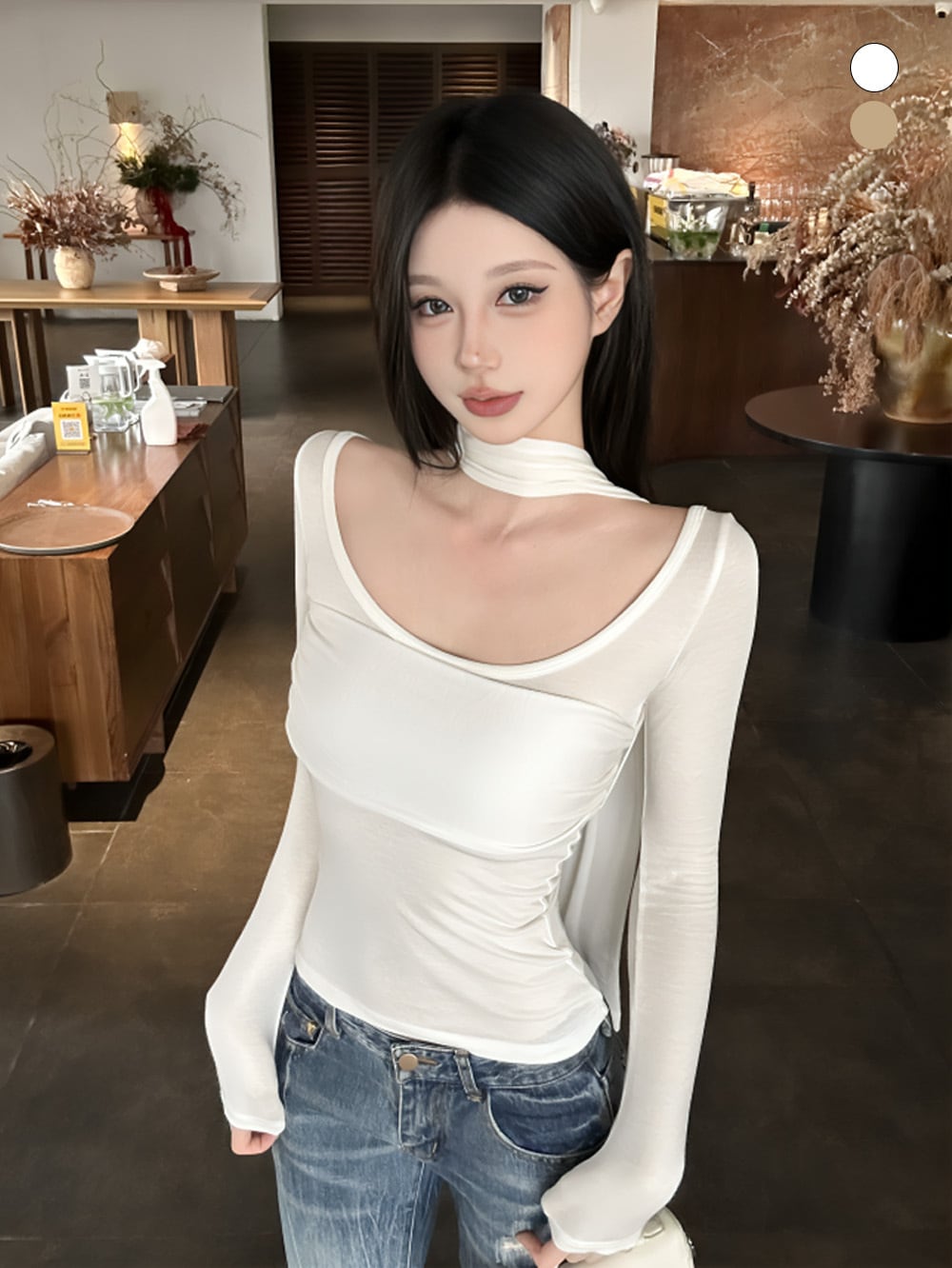 最大の魅力は、ラウンドカットのデコルテラインと、そこから立ち上がるホルターネック風の「ロングネックコード」。