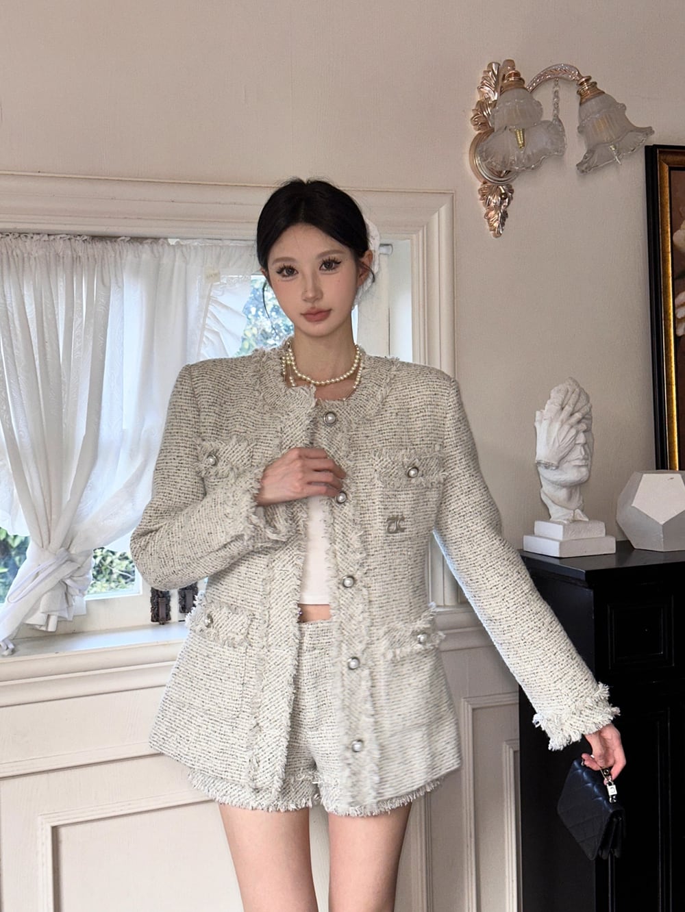 ライトグレーフリンジツイードミドルジャケット+ツイードミニパンツセットアップ|Atelier Item